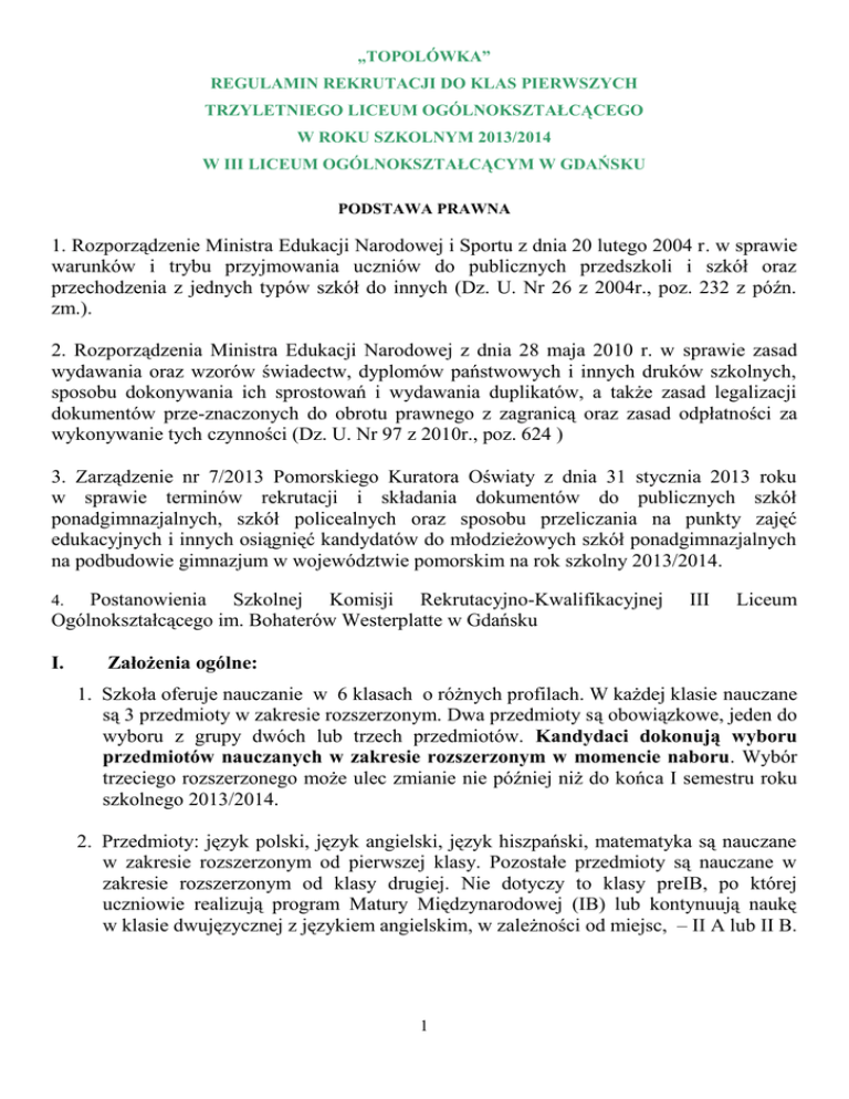 „TOPOLÓWKA” REGULAMIN REKRUTACJI DO KLAS PIERWSZYCH TRZYLETNIEGO LICEUM OGÓLNOKSZTAŁCĄCEGO W ROKU SZKOLNYM 2013/2014 W III LICEUM OGÓLNOKSZTAŁCĄCYM W GDAŃSKU PODSTAWA PRAWNA 1. Rozporządzenie Ministra Edukacji Narodowej i Sportu z dnia 20 lutego 2004 r. w sprawie warunków i trybu przyjmowania uczniów do publicznych przedszkoli i szkół oraz przechodzenia z jednych typów szkół do innych (Dz. U. Nr 26 z 2004r., poz. 232 z późn. zm.). 2. Rozporządzenia Ministra Edukacji Narodowej z dnia 28 maja 2010 r. w sprawie zasad wydawania oraz wzorów świadectw, dyplomów państwowych i innych druków szkolnych, sposobu dokonywania ich sprostowań i wydawania duplikatów, a także zasad legalizacji dokumentów prze-znaczonych do obrotu prawnego z zagranicą oraz zasad odpłatności za wykonywanie tych czynności (Dz. U. Nr 97 z 2010r., poz. 624 ) 3. Zarządzenie nr 7/2013 Pomorskiego Kuratora Oświaty z dnia 31 stycznia 2013 roku w sprawie terminów rekrutacji i składania dokumentów do publicznych szkół ponadgimnazjalnych, szkół policealnych oraz sposobu przeliczania na punkty zajęć edukacyjnych i innych osiągnięć kandydatów do młodzieżowych szkół ponadgimnazjalnych na podbudowie gimnazjum w województwie pomorskim na rok szkolny 2013/2014. Postanowienia Szkolnej Komisji Rekrutacyjno-Kwalifikacyjnej Ogólnokształcącego im. Bohaterów Westerplatte w Gdańsku 4. I. III Liceum Założenia ogólne: 1. Szkoła oferuje nauczanie w 6 klasach o różnych profilach. W każdej klasie nauczane są 3 przedmioty w zakresie rozszerzonym. Dwa przedmioty są obowiązkowe, jeden do wyboru z grupy dwóch lub trzech przedmiotów. Kandydaci dokonują wyboru przedmiotów nauczanych w zakresie rozszerzonym w momencie naboru. Wybór trzeciego rozszerzonego może ulec zmianie nie później niż do końca I semestru roku szkolnego 2013/2014. 2. Przedmioty: język polski, język angielski, język hiszpański, matematyka są nauczane w zakresie rozszerzonym od pierwszej klasy. Pozostałe przedmioty są nauczane w zakresie rozszerzonym od klasy drugiej. Nie dotyczy to klasy preIB, po której uczniowie realizują program Matury Międzynarodowej (IB) lub kontynuują naukę w klasie dwujęzycznej z językiem angielskim, w zależności od miejsc, – II A lub II B. 1 II. W roku szkolnym 2013/2014 otwieramy następujące klasy: 1. KLASA „A” – DWUJĘZYCZNA Z J. ANGIELSKIM: przedmioty z rozszerzonym programem nauczania: GEOGRAFIA MATEMATYKA Przedmioty rozszerzone do wyboru: WOS lub HISTORIA lub INFORMATYKA. nauczane języki: angielski (6h) i hiszpański (2h) przedmioty nauczane dwujęzycznie: matematyka, geografia 2. KLASA „B” – DWUJĘZYCZNA Z PRZEDMIOTAMI EKSPERYMENTALNYMI: przedmioty z rozszerzonym programem nauczania: BIOLOGIA CHEMIA Przedmioty rozszerzone do wyboru: FIZYKA lub MATEMATYKA nauczane języki: angielski (6h) i niemiecki (2h) 3. KLASA „C” - Z PROGRAMAMI WŁASNYMI, HUMANISTYCZNO-PRAWNICZA przedmioty z rozszerzonym programem nauczania: J. POLSKI HISTORIA Przedmioty rozszerzone do wyboru: WOS lub GEOGRAFIA nauczane języki: angielski (3h) i francuski (2h) 4. KLASA „D”- Z PROGRAMAMI WŁASNYMI, POLITECHNICZNA przedmioty z rozszerzonym programem nauczania: MATEMATYKA FIZYKA Przedmioty rozszerzone do wyboru: INFORMATYKA lub GEOGRAFIA nauczane języki: angielski (3h) i niemiecki lub hiszpański (2h) 5. KLASA „IH” - DWUJĘZYCZNA Z JĘZYKIEM HISZPAŃSKIM, przygotowująca do matury polskiej i hiszpańskiej (kontynuacja po klasie wstępnej „0H”). Możliwość przyjęcia kandydatów pod następującymi warunkami: a) zdanie egzaminu z języka hiszpańskiego b)wolne miejsca przedmioty z rozszerzonym programem nauczania: HISTORIA GEOGRAFIA Obowiązkowe przedmioty dodatkowe: LITERATURA HISZPAŃSKA HISTORIA Z ELEMENTAMI HISTORII SZTUKI KRÓLESTWA HISZPANII GEOGRAFIA KRÓLESTWA HISZPANII nauczane języki: hiszpański (6h) i angielski (2h) 6. KLASA „0H” - WSTĘPNA Z JĘZYKIEM HISZPAŃSKIM, przygotowująca do klasy dwujęzycznej z językiem hiszpańskim. Zajęcia z nauczycielem z Hiszpanii. Dodatkowe opłaty. nauczane języki: hiszpański (20h) 7. KLASA „preIB” - DWUJĘZYCZNA Z J. ANGIELSKIM – tylko dla uczniów, którzy od II klasy chcą uczestniczyć w programie dyplomowym matury międzynarodowej. Dodatkowe opłaty. 2 przedmioty nauczane dwujęzycznie: MATEMATYKA BIOLOGIA FIZYKA GEOGRAFIA HISTORIA CHEMIA dodatkowe przedmioty: METODOLOGIA BADAŃ NAUKOWYCH (nauczana w języku angielskim) i CAS (Creativity Action Service). nauczane języki: angielski (6h) i niemiecki (2h) UWAGI DODATKOWE! W roku szkolnym 2013 / 2014 nie będzie przeprowadzany sprawdzian uzdolnień kierunkowych z języka angielskiego do klas IA, IB i I preIB. język angielski jest obowiązkowy, jako pierwszy język obcy w klasach I A, I B ,I C, I D, I preIB ( nauczany w III LO od poziomu intermediate), w klasie wstępnej 0H i klasie IH pierwszym językiem obcym jest język hiszpański kandydaci do klasy wstępnej 0H są przyjmowani na ogólnych zasadach rekrutacji elektronicznej. nabór uczniów do klasy IH przeprowadzany jest zgodnie z wewnątrzszkolnym systemem rekrutacji, poza systemem elektronicznym, na podstawie podania złożonego do dyrektora szkoły zgodnie z terminarzem przyjmowania dokumentów oraz spełnieniem niżej wymienionych warunków kandydaci do klasy IH (uczniowie obecnej klasy 0H w III LO, oraz spoza III LO) przystępują obowiązkowo do sprawdzianu uzdolnień kierunkowych z języka hiszpańskiego dnia 13 czerwca 2013 r. o godzinie 9.00. Sprawdzian składa się z części pisemnej (60 minut) i części ustnej (10 minut) warunkiem koniecznym przyjęcia do klasy IH jest pozytywy wynik sprawdzianu z uzdolnień kierunkowych z języka hiszpańskiego Zakres zagadnień sprawdzianu kierunkowego znajduje się na tablicy ogłoszeń w szkole i na stronie internetowej szkoły. Do sprawdzianu uzdolnień kierunkowych kandydaci będą mogli przystąpić wyłącznie po okazaniu aktualnej i czyte