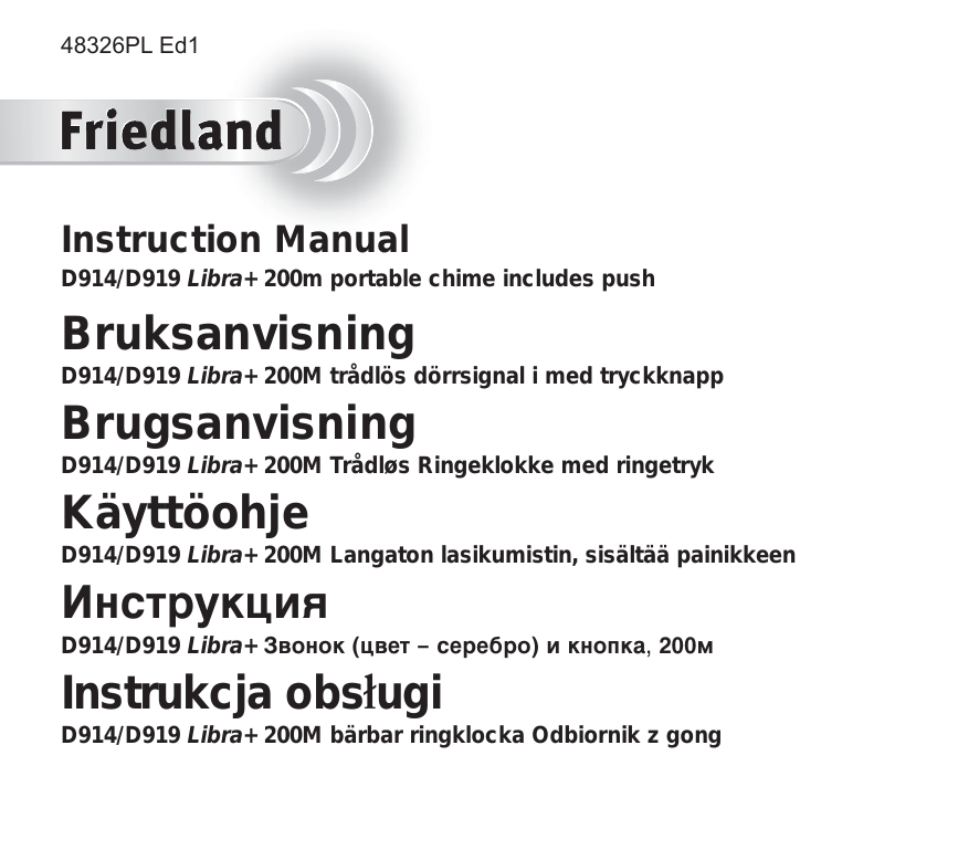 48326PL Ed1 Instruction Manual D914/D919 Libra+ 200m portable chime includes push Bruksanvisning D914/D919 Libra+ 200M trådlös dörrsignal i med tryckknapp Brugsanvisning D914/D919 Libra+ 200M Trådløs Ringeklokke med ringetryk Käyttöohje D914/D919 Libra+ 200M Langaton lasikumistin, sisältää painikkeen àÌÒÚÛ͈Ëfl D914/D919 Libra+ á‚ÓÌÓÍ (ˆ‚ÂÚ – Ò·Ó) Ë ÍÌÓÔ͇, 200Ï Instrukcja obsługi D914/D919 Libra+ 200M bärbar ringklocka Odbiornik z gong Installation and Use Checking pack contents........................................ Pg. 2 Safety..................................................................... Quick start............................................................. Open the bell push................................................ Pg. 3 Fit the push battery................................................ Fit the chime battery.............................................. Switch positions..................................................... Pg. 4 Volume control ...................................................... Sliding window ..................................................... Use of icons .......................................................... Pg. 5 Programming procedures...................................... Recall function ...................................................... Pg. 6 Chime sounds ...................................................... Mount bell push .................................................... Chime position ...................................................... Troubleshooting..................................................... Pg. 7 Specifications........................................................ Pg. 9 Disposal and recycling.......................................... Guarantee.............................................................. Declaration............................................................. 1 ENGLISH Libra + 200m Portable chime with push Libra + 200m Portable chime with push Thank you for choosing this Friedland product. Please use the following instructions to ensure correct installation and use. Keep these notes in a safe place for future reference. Checking pack contents Safety Before proceeding with the installation, please note the following safety warnings: Unpack your chime kit and identify the following parts: ¬● Chime ● Chime bracket ● Bell push ● CR2032 battery for bell push ● 2 x fixing screws for push ● 2 x fixing screws for chime ● 2 x wall plugs ● Adhesive pad ¬● Always follow the manufacturer’s advice when using power tools and wear suitable protective equipment (e.g. safety goggles) when drilling holes etc. ● ¬ You will need: ● ● ● ● A 4mm cross-head screwdriver A small flat bladed screwdriver A 6mm masonry drill 4 x LR14 ’C’ Alkaline batteries Before drilling holes in walls, check for hidden electricity cables and water pipes, the use of a cable/pipe locater maybe advisable if in doubt. Quick start The bell push supplied with this kit is pre-programmed to operate with the chime. You need to do the following to get started: ● Open the bell push ● Fit the push battery ● Fit the chime batteries ● Check the chime switch setting ● Check the volume setting When you operate the bell push, the chime will sound and the 1st Icon will flash. If you have additional pushes or you want to assign a different icon to your push, you will need to follow the programming procedure. 2 Open the bell push Fit the chime batteries To remove the chime battery cover, press at point C and slide the cover back 5mm, then lift off. Insert 4 x LR14 ‘C’ alkaline batteries (not supplied). Observe polarity as marked inside the battery compartment (Fig. 3). Insert a flat bladed screwdriver into the slot A, at the base of the push. Carefully lever the cover and base apart (Fig. 1). Fig. 3 Fig. 1 A To fit the bell push battery Insert the CR2032 coin cell. Ensure the face marked ‘+’ is uppermost (Fig. 2). C Fig. 2 CR2032 + 3 Switch positions Sliding window Mute To turn the sound off, set switch (D) to position 1. Flash off To turn the blue flashing light off, set switch (D) to position 3. Normal operation For normal operation (sound + flashing light), set switch (D) to position 2. Release the catch E and slide open the window (Fig. 6). E Fig. 4 Fig. 6 D Volume control The volume control is behind the sliding window, on the front of the chime. Initially, set the control to mid-point. After you have tested your system, adjust to the desired volume. Fig. 5 Volume control 4 Use of icons Programming procedure In addition to the chime sounds, your chime has a visual indication to show which device has activated it. An icon will illuminate when the chime is activated by a bell push or another compatible device. The chime supports six icons: Main door Back door Learn mode To enable your chime to learn the identity of your bell push: ¬● Press the ● button and keep it pressed. Each Icon will light in turn. When the Icon you want is lit, release the button. ● ¬ While the Icon you have selected is lit, operate your push. The chime will sound. The Icon will flash. ! Unlearn procedure If you want to remove a push from the chime’s memory: ¬ Press the ● button and keep it pressed. ● Each Icon will light in turn. When the Icon associated with the push to be un-learnt is lit, release the button. ● ¬ Press and hold down both ● & buttons, until a ‘beep’ sound is heard. Alert Intruder Telephone Pager/ symbol Key fob The ‘Main door’ and ‘Back door’ icons are usually used for bell pushes. The other icons are intended for use with other compatible devices, such as PIR movement detectors and Telephone ring detector. Icons numbered 1 to 6 are also included. The Icons are self-adhesive, supplied in strips of 3. They can be changed, if required, by opening the sliding window of the chime and gently peeling off the strips. If desired, the strips