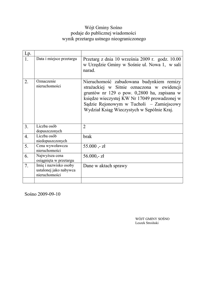 Wójt Gminy Sośno podaje do publicznej wiadomości wynik przetargu ustnego nieograniczonego Lp. 1. Data i miejsce przetargu Przetarg z dnia 10 września 2009 r. godz. 10.00 w Urzędzie Gminy w Sośnie ul. Nowa 1, w sali narad. 2. Oznaczenie nieruchomości Nieruchomość zabudowana budynkiem remizy strażackiej w Sitnie oznaczona w ewidencji gruntów nr 129 o pow. 0,2800 ha, zapisana w księdze wieczystej KW Nr 17049 prowadzonej w Sądzie Rejonowym w Tucholi – Zamiejscowy Wydział Ksiąg Wieczystych w Sępólnie Kraj. 3. Liczba osób dopuszczonych Liczba osób niedopuszczonych Cena wywoławcza nieruchomości Najwyższa cena osiągnięta w przetargu Imię i nazwisko osoby ustalonej jako nabywca nieruchomości 2 4. 5. 6. 7. brak 55.000 ,- zł 56.000,- zł Dane w aktach sprawy Sośno 2009-09-10 WÓJT GMINY SOŚNO Leszek Stroiński