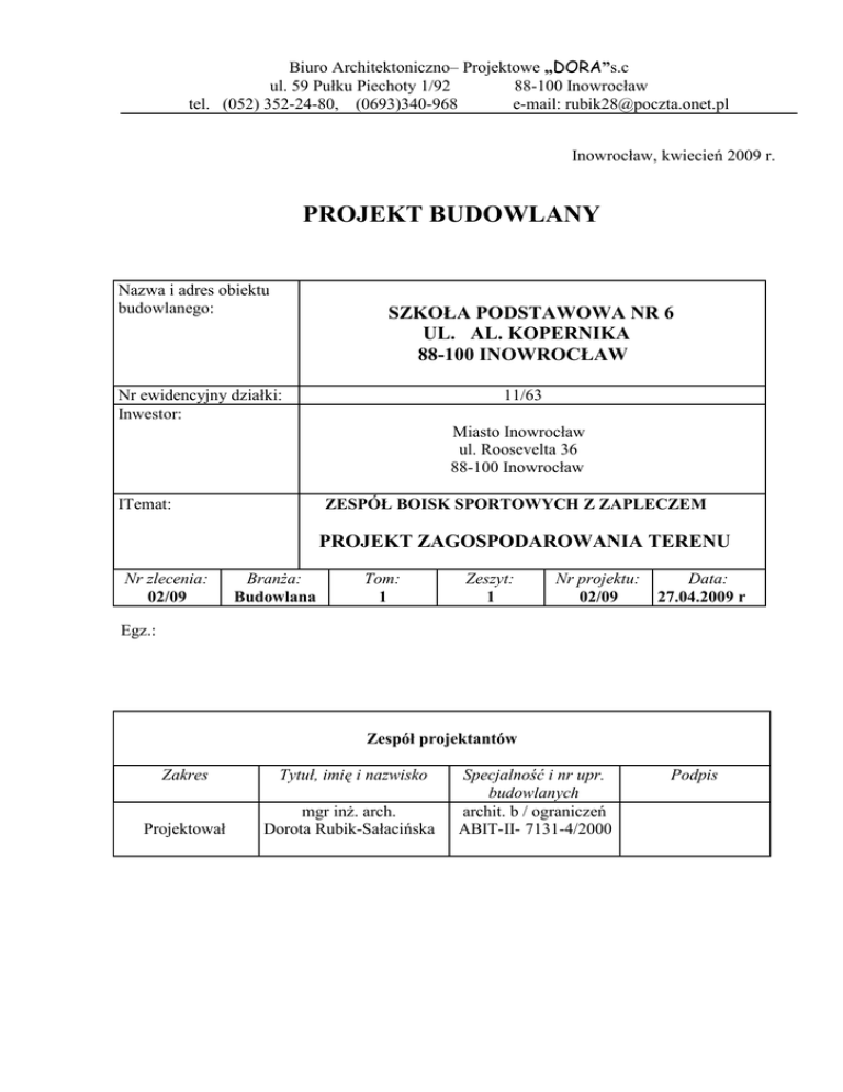 Biuro Architektoniczno– Projektowe „DORA”s.c ul. 59 Pułku Piechoty 1/92 88-100 Inowrocław tel. (052) 352-24-80, (0693)340-968 e-mail: [email protected] Inowrocław, kwiecień 2009 r. PROJEKT BUDOWLANY Nazwa i adres obiektu budowlanego: SZKOŁA PODSTAWOWA NR 6 UL. AL. KOPERNIKA 88-100 INOWROCŁAW Nr ewidencyjny działki: Inwestor: 11/63 Miasto Inowrocław ul. Roosevelta 36 88-100 Inowrocław ITemat: ZESPÓŁ BOISK SPORTOWYCH Z ZAPLECZEM PROJEKT ZAGOSPODAROWANIA TERENU Nr zlecenia: 02/09 BranŜa: Budowlana Tom: 1 Zeszyt: 1 Nr projektu: 02/09 Data: 27.04.2009 r Egz.: Zespół projektantów Zakres Tytuł, imię i nazwisko Projektował mgr inŜ. arch. Dorota Rubik-Sałacińska Specjalność i nr upr. budowlanych archit. b / ograniczeń ABIT-II- 7131-4/2000 Podpis „Dora”s.c. Biuro Arch-Projektowe 88-100 Inowrocław ul.59PułkuPiechoty 1/92 Miasto Inowrocław ul. Al. Kopernika 88-100 Inowrocław SZKOŁA PODSTAWOWA UL. AL. KOPERNIKA 88-100 INOWROCŁAW ZESPÓŁ BOISK SPORTOWYCH Z ZAPLECZEM PROJEKT ZAGOSPODAROWANIA TERENU Nr proj. B-02/09 Tom 1 Zeszyt 1 Zawartość opracowania 1. 2. 3. 4. 5. Strona tytułowa Zawartości opracowania Oświadczenie projektanta. Opis techniczny zagospodarowania terenu Rysunki : • Projekt zagospodarowania terenu • DrenaŜ, przekroje boisk • Zaplecze socjalne – rzuty zmiany • Zaplecze socjalne – elewacje zmiany • Pochylnia dla osób niepełnosprawnych - 01 - 02 - 03 - 04 - 05 - 06 6. BranŜa elektryczna - adaptacja B-02/09 Strona 2/9 „Dora”s.c. Biuro Arch-Projektowe 88-100 Inowrocław ul.59PułkuPiechoty 1/92 Miasto Inowrocław ul. Al. Kopernika 88-100 Inowrocław SZKOŁA PODSTAWOWA UL. AL. KOPERNIKA 88-100 INOWROCŁAW ZESPÓŁ BOISK SPORTOWYCH Z ZAPLECZEM PROJEKT ZAGOSPODAROWANIA TERENU Nr proj. B-02/09 Tom 1 Zeszyt 1 Inowrocław, 27.04.2009r. OŚWIADCZENIE Oświadcza się, Ŝe dokumentacja: „PROJEKT ZAGOSPODAROWANIA TERENU ZESPOŁU BOISK SPORTOWYCH Z ZAPLECZEM” wykonana dla Miasta Inowrocław została wykonana zgodnie z otrzymanym zleceniem, z obowiązującymi przepisami techniczno-budowlanymi oraz normami i jest kompletna z punktu widzenia celu, któremu ma słuŜyć. Projektant: ……………………………………………… mgr inŜ.arch.Dorota Rubik-Sałacińska proj.:ABIT-II-7131-4/2000 B-02/09 Strona 3/9 „Dora”s.c. Biuro Arch-Projektowe 88-100 Inowrocław ul.59PułkuPiechoty 1/92 Miasto Inowrocław ul. Al. Kopernika 88-100 Inowrocław SZKOŁA PODSTAWOWA UL. AL. KOPERNIKA 88-100 INOWROCŁAW ZESPÓŁ BOISK SPORTOWYCH Z ZAPLECZEM PROJEKT ZAGOSPODAROWANIA TERENU Nr proj. B-02/09 Tom 1 Zeszyt 1 CZĘŚĆ OPISOWA 1. • • • • • • • • • 2. Podstawa opracowania Zlecenie nr 02/09 Mapa sytuacyjno - wysokościowa w skali 1:500 do celów projektowych wydana przez Powiatowy Ośrodek Dokumentacji Geodezyjnej i Kartograficznej w Inowrocławiu w dniu 19.02.2009 r. Dokumentacja geotechniczna Własność nieruchomości miasto Inowrocław Uzgodnienia koncepcyjne Wizja lokalna Koncepcja architektoniczna zaakceptowana przez Inwestora Obowiązujące normy, normatywy i przepisy techniczne Akty prawne Rozporządzenie Ministra Infrastruktury z dnia 3 lipca 2003 r. w sprawie szczegółowego zakresu i formy projektu budowlanego (Dz. U. Nr 120, poz. 1133). Rozporządzenie Ministra Infrastruktury z dnia 7 kwietnia 2004 roku w sprawie warunków technicznych , jakim powinny odpowiadać budynki i ich usytuowanie / j Dz.U. nr 109 poz. 1156 z późn.zm / . Art. 20 ust. 4 z dnia 7 lipca 1994 r. Prawo budowlane (tekst jednolity: Dz.U. Nr 156 poz.1118 z 1 września 2006 roku). Przedmiot inwestycji Przedmiotem inwestycji jest realizacja zespołu boisk sportowych z zapleczem socjalnym w Inowrocławiu przy ul. Aleja Mikołaja Kopernika na działce nr 11/63. 3. Istniejący stan zagospodarowania terenu Obszar objęty opracowaniem stanowi teren zagospodarowany . Jest to teren Szkoły Podstawowej nr 6 , na którym znajduje się istniejące boisko o nawierzchni trawiastej. Północną część terenu stanowi teren zabudowany – budynki KSM , od strony wschodniej znajduje się szkoła , natomiast od zachodniej ul. Kopernika. Droga dojazdowa na teren działki (boiska) znajduje się od strony szkoły. 4. Projektowane zagospodarowanie terenu Projektuje się zagospodarowanie działki w następującym zakresie: - Boisko do piłki noŜnej o wymiarach 30,0 x 62,0 m wraz z drenaŜem na podbudowie z kruszywa i o nawierzchni syntetycznej (sztuczna trawa) - Boisko do koszykówki i siatkówki o wymiarach 19,10 x 32,10 m wraz z drenaŜem o nawierzchni syntetycznej (poliuretanowa) - Zaplecze boisk składające się z 10 -ciu segmentów B-02/09 Strona 4/9 „Dora”s.c. Biuro Arch-Projektowe 88-100 Inowrocław ul.59PułkuPiechoty 1/92 Miasto Inowrocław ul. Al. Kopernika 88-100 Inowrocław SZKOŁA PODSTAWOWA UL. AL. KOPERNIKA 88-100 INOWROCŁAW ZESPÓŁ BOISK SPORTOWYCH Z ZAPLECZEM PROJEKT ZAGOSPODAROWANIA TERENU Nr proj. B-02/09 Tom 1 Zeszyt 1 - Ciągi komunikacyjne (piesze i jezdne o szerokości całkowitej 5,00 m ) - Oświetlenie boisk z naświetlaczami i instalacją odgromową - Ogrodzenie terenu z bramą wjazdową i furtką wejściową 5. Wykonanie podbudowy wraz z systemem drenaŜu 1. Roboty przygotowawcze • • • Usunięcie warstwy humusu o miąŜszości od 0,30 m do 0,50 m Wyrównanie istniejącego podłoŜa terenu do poziomu pozwalającego wykonać boisko na rzędnej 99,93 m n.p.m. Wywóz i utylizacja odpadów oraz ziemi. 2. System drenaŜu boiska • • UłoŜenie systemu rur drenarskich pod projektowanymi boiskami. Maksymalna odległość pomiędzy rurami systemu wynosi 10,00 m, średnica sączków drenarskich Ø100 mm z PCV, natomiast drenu zbiorczego Ø 150 mm z PCV. UłoŜenie rur, naleŜy wykonać tak aby zapewnić prawidłowe funkcjonowanie systemu. Podłączenie systemu drenaŜowego do istniejącego systemu kanalizacji deszczowej UWAGA: Podczas realizacji drenaŜu naleŜy sprawdzić faktyczny poziom istniejącej kanalizacji w miejscu podł