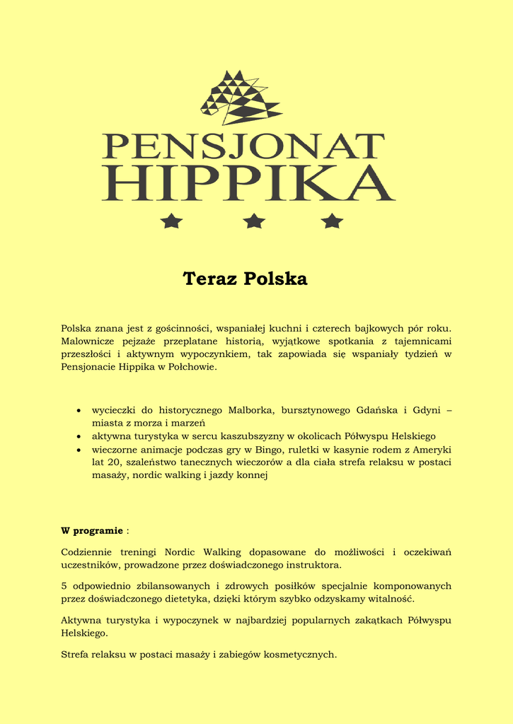 Teraz Polska Polska znana jest z gościnności, wspaniałej kuchni i czterech bajkowych pór roku. Malownicze pejzaże przeplatane historią, wyjątkowe spotkania z tajemnicami przeszłości i aktywnym wypoczynkiem, tak zapowiada się wspaniały tydzień w Pensjonacie Hippika w Połchowie. wycieczki do historycznego Malborka, bursztynowego Gdańska i Gdyni – miasta z morza i marzeń aktywna turystyka w sercu kaszubszyzny w okolicach Półwyspu Helskiego wieczorne animacje podczas gry w Bingo, ruletki w kasynie rodem z Ameryki lat 20, szaleństwo tanecznych wieczorów a dla ciała strefa relaksu w postaci masaży, nordic walking i jazdy konnej W programie : Codziennie treningi Nordic Walking dopasowane do możliwości i oczekiwań uczestników, prowadzone przez doświadczonego instruktora. 5 odpowiednio zbilansowanych i zdrowych posiłków specjalnie komponowanych przez doświadczonego dietetyka, dzięki którym szybko odzyskamy witalność. Aktywna turystyka i wypoczynek w najbardziej popularnych zakątkach Półwyspu Helskiego. Strefa relaksu w postaci masaży i zabiegów kosmetycznych. Wycieczki do wyjątkowych miejsc w Malborku, Gdańsku i Gdyni, których historię przybliży przewodnik – pasjonat historii. Wyjątkowe wieczory z muzyką i zabawą w tle pozwolą na niezapomniane przeżycia, nowe przyjaźnie i wspaniałe samopoczucie. Prawdziwie polska gościnność zaczyna się w Połchowie! Pensjonat Hippika to na co dzień nadmorskie centrum sportu, wypoczynku i biznesu. Stadnina koni, urokliwie tereny do spacerów, w otoczeniu lasu i pobliskiego morza. Do dyspozycji gości są pokoje o wysokim standardzie, sala konferencyjno-bankietowa, plac zabaw, parking, szkółka jazdy konnej oraz kuchnia, słynna w regionie z fantastycznego menu i wielu nagród w konkursach kulinarnych. Zapraszamy w listopadzie, marcu i kwietniu. Cena pobytu to 450 euro. Szczegółowe informacje dotyczące programu i rezerwacji znajdują się: https://www.facebook.com/Pensjonat-Hippika-KJ-Jackiewicz%C3%B3w243801939130968/?fref=ts http://www.pensjonat-hippika.pl/ oraz pod numerem telefonu + 48 501 522 354 email. [email protected] dzieci: do 4 roku życia w cenie pobytu rodziców, powyżej 4 roku życia 600 zł/dziecko rezerwacja pobytu jest równoznaczna z wpłatą 25 % tytułem zaliczki za Teraz Polska nr konta do wpłaty to : Equi – Invest Katarzyna Jackiewicz – Wójcik S.K.A. ul. Polna 30 Połchowo 93249000050000453058027591 Alior Bank Pora rozsmakować się w gościnności, wypoczynku i zabawie. Teraz Polska!