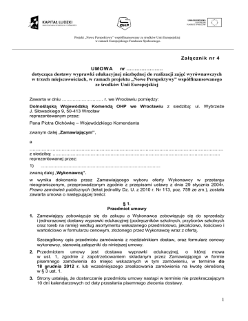 Projekt „Nowe Perspektywy” współfinansowany ze środków Unii Europejskiej w ramach Europejskiego Funduszu Społecznego. Załącznik nr 4 UMOW A nr …………………. dotycząca dostawy wyprawki edukacyjnej niezbędnej do realizacji zajęć wyrównawczych w trzech miejscowościach, w ramach projektu „Nowe Perspektywy” współfinansowanego ze środków Unii Europejskiej Zawarta w dniu ……………………… r. we Wrocławiu pomiędzy: Dolnośląską Wojewódzką Komendą OHP we Wrocławiu z siedzibą: ul. Wybrzeże J. Słowackiego 9, 50-413 Wrocław reprezentowanym przez: Pana Piotra Olchówkę – Wojewódzkiego Komendanta zwanym dalej „Zamawiającym”, a ………………………………………………………………………………………………………………. z siedzibą: ……………………………………………………………………………………………….. reprezentowanej przez: 1) .............................................................................................. zwaną dalej „Wykonawcą”. w wyniku dokonania przez Zamawiającego wyboru oferty Wykonawcy w przetargu nieograniczonym, przeprowadzonym zgodnie z przepisami ustawy z dnia 29 stycznia 2004r. Prawo zamówień publicznych (tekst jednolity Dz. U. z 2010 r. Nr 113, poz. 759 ze zm.), została zawarta umowa o następującej treści: § 1. Przedmiot umowy 1. Zamawiający zobowiązuje się do zakupu a Wykonawca zobowiązuje się do sprzedaży i jednorazowej dostawy wyprawki edukacyjnej (podręczników szkolnych, przyborów szkolnych oraz toreb na ramię) według asortymentu wskazanego przedmiotowo, jakościowo, ilościowo i wartościowo w formularzu cenowym, złożonego przez Wykonawcę wraz z ofertą. Szczegółowy opis przedmiotu zamówienia z rozdzielnikiem dostaw, oraz formularz cenowy wykonawcy, stanowią załączniki do niniejszej umowy. 2. Przedmiotem umowy jest dostawa wyprawki edukacyjnej, o której mowa w ust. 1, zgodnie z zapotrzebowaniem składanym przez Zamawiającego w formie pisemnego zamówienia do miejsc wskazanych w tym zamówieniu, w terminie do 18 grudnia 2012 r. lub wcześniejszego zrealizowania zamówienia na kwotę określoną w § 3 ust. 1. 3. Strony ustalają, że dostarczanie przedmiotu umowy nastąpi w terminie nie przekraczającym 10 dni kalendarzowych od daty przesłania pisemnego zlecenia dostawy. 1 Projekt „Nowe Perspektywy” współfinansowany ze środków Unii Europejskiej w ramach Europejskiego Funduszu Społecznego. 4. Wykonawca dostarcza przedmiot umowy na adresy wskazane w punkcie 10 w szczegółowym opisie przedmiotu zamówienia (rozdzielnik dostaw) na własny koszt i ryzyko. 5. Zamawiający zastrzega możliwość zmiany adresów dostaw, w każdym momencie trwania umowy. Dlatego więc przed dokonaniem wysyłki przedmiotu umowy, Wykonawca zobowiązany jest potwierdzić u Zamawiającego adres dostawy. Ewentualne zmienione lokalizacje dostaw znajdować się będą w województwie dolnośląskim. 6. Zamawiający zaleca dokonanie jednej całościowej dostawy do poszczególnych miejsc docelowych wskazanych w pisemnym zamówieniu. 7. Zamawiający dopuszcza możliwość dostarczania pełnego asortymentu dostarczanych artykułów w częściach, faktura jednak będzie wystawiona po zrealizowaniu całego zamówienia określonego w pisemnym zamówieniu. Ilość faktur musi odpowiadać ilości złożonych zamówień. 8. Odbiór przedmiotu umowy potwierdzony zostanie podpisanymi przez przedstawicieli Stron protokołami odbioru, lub innymi dokumentami potwierdzającymi odbiór przedmiotu umowy np. dowód wydania towaru WZ, który musi zawierać następujące informacje: Kto i komu przekazał przedmiot zamówienia Miejsce dostawy: dokładny adres Szczegółowy wykaz artykułów wraz z ich ilością Podpisy osób które przekazały i odebrały towar. 9. Wykonawca oświadcza, że zbywany towar jest wolny od wszelkich długów i obciążeń, oraz nie posiada wad prawnych. 10. Wykonawca jest odpowiedzialny względem zamawiającego za wszelkie wady fizyczne i prawne dostarczanych artykułów, w tym również za ewentualne roszczenia osób trzecich wynikające z naruszenia praw własności intelektualnej lub przemysłowej, w tym praw autorskich, patentów, praw ochronnych na znaki towarowe oraz praw z rejestracji na wzory użytkowe i przemysłowe, pozostające w związku z wprowadzaniem dostarczanego towaru do obrotu na terytorium Rzeczypospolitej Polskiej. § 2. Czas obowiązywania umowy 1. Umowa zostaje zawarta na czas określony od dnia podpisania umowy do dnia 18.12.2012 r. 2. W przypadku wyczerpania całkowitej wartości umowy brutto, o której mowa w § 3 ust. 1, umowa ulegnie rozwiązaniu na mocy niniejszego postanowienia bez konieczności składania przez Strony dodatkowych oświadczeń woli. § 3. Wartość umowy 1. Maksymalna cena przedmiotu umowy zgodnie z ofertą Wykonawcy wynosi ………………. zł brutto (słownie: ……………………………………………………………………………………………..). Ceny jednostkowe zawarte zostały w formularzu cenowym będącym integralną częścią oferty przetargowej. 2 Projekt „Nowe Perspektywy” współfinansowany ze środków Unii Europejskiej w ramach Europejskiego Funduszu Społecznego. 2. Ceny poszczególnych artykułów, określone w Ofercie z dnia ……………r., pozostają niezmienne przez cały okres obowiązywania umowy. 3. W cenie oferty Wykonawca uwzględnił wszystkie koszty, niezbędne do realizacji zamówienia tj. koszty transportu, ubezpieczenia, załadunku, rozładunku, ewentualne upusty i rabaty, a także koszty uwzględniające warunki gwarancji i rękojmi. 4. Zamawiający zastrzega prawo zrealizowania umowy do wartości niższej niż określona w ust. 1 oraz do zmiany ilości zamawianych artykułów biurowych w poszczególnych pozycjach formularza cenowego, w zależności od faktycznych potrzeb Zamawiającego i przy zachowaniu ce