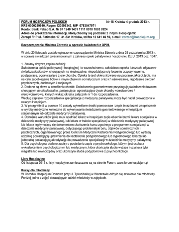 FORUM HOSPICJÓW POLSKICH Nr 18 Kraków 4 grudnia 2013 r. KRS 0000289910, Regon 120599343, NIP 6783047971 Konto: Bank Pekao S.A. Nr 97 1240 1431 1111 0010 1863 8924 Adres do przekazania informacji, którą chcemy się podzielić z innymi Hospicjami: Zarząd FHP ul. Fatimska 17, 31-831 Kraków, tel/fax 12 641 46 59, e-mail: [email protected] Rozporządzenie Ministra Zdrowia w sprawie świadczeń z OPiH. W dniu 20 listopada zostało ogłoszone rozporządzenie Ministra Zdrowia z dnia 29 października 2013 r. w sprawie świadczeń gwarantowanych z zakresu opieki paliatywnej i hospicyjnej. Dz.U. 2013 poz. 1347. 1. Zmiany dotyczą zapisu definicji: Świadczenia opieki paliatywnej i hospicyjnej to wszechstronna, całościowa opieka i leczenie objawowe świadczeniobiorców, chorujących na nieuleczalne, niepoddające się leczeniu przyczynowemu, postępujące, ograniczające życie choroby. Opieka ta jest ukierunkowana na poprawę jakości życia, ma na celu zapobieganie bólowi i innym objawom somatycznym oraz ich uśmierzanie, łagodzenie cierpień psychicznych, duchowych i socjalnych. 2. Dodane są słowa w określeniu chorób: Świadczenia gwarantowane przysługują świadczeniodawcom chorującym na nieuleczalne, postępujące, ograniczające życie choroby nowotworowe i nienowotworowe, których wykaz określa załącznik nr 1 do rozporządzenia. Według zapisów rozporządzenia specjalizacja z medycyny paliatywnej może być nadal prowadzona w naszym Hospicjum. 3. W paragrafie 5 w punkcie 10 zostały wykreślone środki pomocnicze i zapis teraz brzmi: zaopatrzenie w wyroby medyczne konieczne do wykonywania świadczenia gwarantowanego w hospicjum stacjonarnym lub oddziale medycyny paliatywnej. 4. Odnośnie warunków jakie musi spełniać lekarz w hospicjum zapis obecnie brzmi: lekarz specjalista w dziedzinie medycyny paliatywnej, lub lekarz w trakcie specjalizacji w dziedzinie medycyny paliatywnej lub lekarz legitymujący się dokumentem ukończenia kursu zgodnego z programem specjalizacji w dziedzinie medycyny paliatywnej, dotyczącego problematyki bólu, objawów somatycznych i psychicznych, organizowanego przez Centrum Medyczne Kształcenia Podyplomowego lub wyższą uczelnię posiadającą uprawnienia do kształcenia podyplomowego lub dyplomowego lekarza lub jednostkę posiadającą akredytację do prowadzenia specjalizacji w dziedzinie medycyny paliatywnej. 5. Dla psychologów dodano zapisy o posiadaniu zapis o psychoonkologu, którym jest osoba z wykształceniem psychologicznym lub medycznym, która ukończyła studia wyższe i uzyskała tytuł magistra lub równorzędny oraz ukończyła studia podyplomowe z psychoonkologii. Listy Hospicyjne Od listopada 2013 r. listy hospicyjne zamieszczane są na stronie Forum: www.forumhospicjum.pl Kursy dla młodzieży W Ośrodku Hospicjum Domowe przy ul. Tykocińskiej w Warszawie odbyło się szkolenie dla młodzieży. Poniżej jedno z zdjęć obrazujących udział młodzieży w zajęciach.
