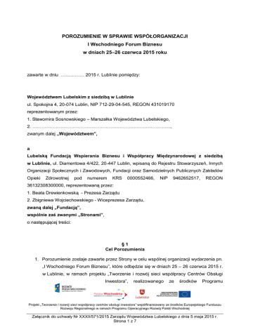 POROZUMIENIE W SPRAWIE WSPÓŁORGANIZACJI I Wschodniego Forum Biznesu w dniach 25–26 czerwca 2015 roku zawarte w dniu …………… 2015 r. Lublinie pomiędzy: Województwem Lubelskim z siedzibą w Lublinie ul. Spokojna 4, 20-074 Lublin, NIP 712-29-04-545, REGON 431019170 reprezentowanym przez: 1. Sławomira Sosnowskiego – Marszałka Województwa Lubelskiego, 2. …………………………………………………………………………….., zwanym dalej „Województwem”, a Lubelską Fundacją Wspierania Biznesu i Współpracy Międzynarodowej z siedzibą w Lublinie, ul. Diamentowa 4/422, 20-447 Lublin, wpisaną do Rejestru Stowarzyszeń, Innych Organizacji Społecznych i Zawodowych, Fundacji oraz Samodzielnych Publicznych Zakładów Opieki Zdrowotnej pod numerem KRS 0000552466, NIP 9462652517, REGON 36132308300000, reprezentowaną przez: 1. Beata Drewienkowską - Prezesa Zarządu 2. Zbigniewa Wojciechowskiego - Wiceprezesa Zarządu, zwaną dalej „Fundacją”, wspólnie zaś zwanymi „Stronami”, o następującej treści: §1 Cel Porozumienia 1. Porozumienie zostaje zawarte przez Strony w celu wspólnej organizacji wydarzenia pn. „I Wschodniego Forum Biznesu”, które odbędzie się w dniach 25 – 26 czerwca 2015 r. w Lublinie, w ramach projektu „Tworzenie i rozwój sieci współpracy Centrów Obsługi Inwestora”, realizowanego ze środków Programu Projekt „Tworzenie i rozwój sieci współpracy centrów obsługi inwestora” współfinansowany ze środków Europejskiego Funduszu Rozwoju Regionalnego w ramach Programu Operacyjnego Rozwój Polski Wschodniej Załącznik do uchwały Nr XXXII/571/2015 Zarządu Województwa Lubelskiego z dnia 5 maja 2015 r. Strona 1 z 7 Operacyjnego Rozwój Polski Wschodniej na lata 2007-2013, zwanego w dalszej Porozumienia jako „Forum”. 2. Pomysłodawcą wydarzenia, o którym mowa w ust. 1, będącym jednocześnie autorem jego scenariusza, jest Fundacja. 3. Strony zobowiązują się do współdziałania i realizacji zadań określonych niniejszym Porozumieniem. §2 Obowiązki Stron 1. W ramach współorganizacji Województwo zobowiązuje się do: a) wynajmu powierzchni sali konferencyjnej w dniach 24-25 czerwca 2015 roku umożliwiające przygotowanie i organizację Forum (sale – 1 sala na min. 350/400 osób oraz dodatkowo 1 sala na ok. 150 osób). Sale muszą być zlokalizowane w jednym miejscu, b) zapewnienia cateringu, tj. podczas przerw kawowych (kawa, herbata, woda, ciastka) oraz lunchu (zupa, 3 ciepłe dania do wyboru, deser, napoje – kawa, herbata, woda, soki), jak również zapewnienia profesjonalnej obsługi kelnerskiej oraz technicznej, c) umożliwienia Fundacji dostępu do miejsca odbywania się Forum w dniu 25 września w celu realizacji zadań przez Fundację, d) zapewnienia sprzętu multimedialnego (nagłośnienie, ekrany, nagranie dźwięku – w każdej sali zostaną zapewnione: ekrany projekcyjne, projektory, monitory, system podglądu prezentacji, laptopy, nagłośnienie obsługa techniczna), e) zapewnienia tłumaczenia symultanicznego podczas obrad (1 dzień konferencyjny, bez spotkania networkingowego), wynajęcia tłumaczy oraz zlecenia tłumaczenia materiałów konferencyjnych. Zakłada się, że obrady będą prowadzone w języku polskim, angielskim i rosyjskim, f) zapewnienia wyposażenia technicznego, m.in. stołów, krzeseł, sceny, foteli, światła oraz nagłośnienia niezbędnego do realizacji wydarzeń w dniu 25 czerwca 2015 roku, g) organizacji strefy VIP, h) zakwaterowania, tj. 50 pokoi dla gości VIP oraz transportu gości VIP (z/do miejsca zakwaterowania do/z miejsca organizacji Forum), i) organizacji min. 30 stoisk dla uczestników Forum, j) zrealizowania działań promujących Forum, z zastrzeżeniem ust. 2 lit. g, k) zapewnienia i opłacenia 3 prelegentów, w tym uznanych w Polsce i Europie autorytetów z dziedziny ekonomii, z zastrzeżeniem ust. 2 lit. c oraz 2 moderatorów, l) organizacji relacji wideo z Forum oraz wykonania profesjonalnych zdjęć ze spotkania (relacja fotograficzna), Projekt „Tworzenie i rozwój sieci współpracy centrów obsługi inwestora” współfinansowany ze środków Europejskiego Funduszu Rozwoju Regionalnego w ramach Programu Operacyjnego Rozwój Polski Wschodniej Załącznik do uchwały Nr XXXII/571/2015 Zarządu Województwa Lubelskiego z dnia 5 maja 2015 r. Strona 2 z 7 m) przygotowania upominków dla gości VIP, n) organizacji wieczornego spotkania networkingowego, w tym zapewnienia miejsca, programu, kolacji oraz zabezpieczenia technicznego spotkania, o) oraz inne niezbędne zadania do realizacji I–go dnia Forum, tj. 25 czerwca 2015 roku. 2. W ramach współorganizacji Fundacja zobowiązuje się do: a) zapewnienia wymaganej liczby uczestników - minimum 400 osób, w tym min. 100 gości spoza województwa lubelskiego, b) zapewnienia udziału przedstawicieli głównych instytucji związanych z rozwojem gospodarczym i współpracą ze Wschodem (Ministerstwo Gospodarki, Ministerstwo Spraw Zagranicznych, Ministerstwo Infrastruktury i Rozwoju), a także przedstawicieli z następujących krajów: Białoruś, Ukraina, Gruzja, Mołdawia, Kazachstan, Uzbekistan, Angola, Włochy oraz - w przypadku, gdy którakolwiek z przedstawicieli instytucji związanych z rozwojem gospodarczym i współpracą ze Wschodem nie będzie mogła uczestniczyć w Forum z przyczyn nie leżących po stronie Fundacji - zapewnienie na jej miejsce udziału innej osoby, w tym przedstawiciela innego kraju, c) zapewnienia i opłacenia min. 3 prelegentów do każdego panelu, w tym uznanych w Polsce i Europie autorytetów w dziedzinie ekonomii, z zastrzeżeniem ust. 1 lit. k, d) zapewnienia Patronatów Honorowych nad Forum, e) zapewnienia województwa udziału przedstawicieli lubelskiego oraz przedsiębiorstw przedsiębiorstw działających zagranicznych na terenie potencjalnie zainteresowanych podjęciem inwestycji na terenie Polski Wschodniej (minimum 65 reprezentantów przedsięb