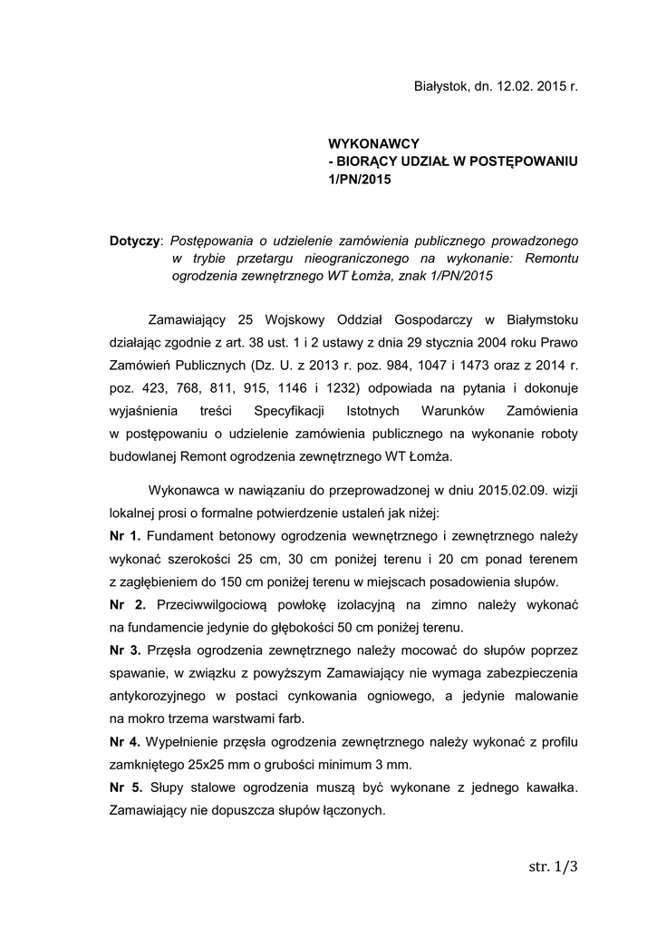 Białystok, dn. 12.02. 2015 r. WYKONAWCY - BIORĄCY UDZIAŁ W POSTĘPOWANIU 1/PN/2015 Dotyczy: Postępowania o udzielenie zamówienia publicznego prowadzonego w trybie przetargu nieograniczonego na wykonanie: Remontu ogrodzenia zewnętrznego WT Łomża, znak 1/PN/2015 Zamawiający 25 Wojskowy Oddział Gospodarczy w Białymstoku działając zgodnie z art. 38 ust. 1 i 2 ustawy z dnia 29 stycznia 2004 roku Prawo Zamówień Publicznych (Dz. U. z 2013 r. poz. 984, 1047 i 1473 oraz z 2014 r. poz. 423, 768, 811, 915, 1146 i 1232) odpowiada na pytania i dokonuje wyjaśnienia treści Specyfikacji Istotnych Warunków Zamówienia w postępowaniu o udzielenie zamówienia publicznego na wykonanie roboty budowlanej Remont ogrodzenia zewnętrznego WT Łomża. Wykonawca w nawiązaniu do przeprowadzonej w dniu 2015.02.09. wizji lokalnej prosi o formalne potwierdzenie ustaleń jak niżej: Nr 1. Fundament betonowy ogrodzenia wewnętrznego i zewnętrznego należy wykonać szerokości 25 cm, 30 cm poniżej terenu i 20 cm ponad terenem z zagłębieniem do 150 cm poniżej terenu w miejscach posadowienia słupów. Nr 2. Przeciwwilgociową powłokę izolacyjną na zimno należy wykonać na fundamencie jedynie do głębokości 50 cm poniżej terenu. Nr 3. Przęsła ogrodzenia zewnętrznego należy mocować do słupów poprzez spawanie, w związku z powyższym Zamawiający nie wymaga zabezpieczenia antykorozyjnego w postaci cynkowania ogniowego, a jedynie malowanie na mokro trzema warstwami farb. Nr 4. Wypełnienie przęsła ogrodzenia zewnętrznego należy wykonać z profilu zamkniętego 25x25 mm o grubości minimum 3 mm. Nr 5. Słupy stalowe ogrodzenia muszą być wykonane z jednego kawałka. Zamawiający nie dopuszcza słupów łączonych. str. 1/3 Zamawiający w odpowiedzi precyzuje: Ad. 1. Fundament betonowy ogrodzenia wewnętrznego i zewnętrznego należy wykonać o wymiarach 0,25 m szerokość, 0,30 m zagłębienie poniżej terenu, 0,20 m wystające ponad terenem – wysokość ogrodzenia 2,00 m liczona od poziomu terenu. W ogrodzeniu wewnętrznym należy przewidzieć wykonanie wysięgników stalowych skierowanych pod kątem 45 stopni do wewnątrz kompleksu na montaż zwojów przestrzennych drutu ostrzowego typu Concertina (opis w ST). Zagłębienia stóp fundamentowych słupów nośnych ogrodzenia, bram i furtek na głębokość 1,50 m poniżej terenu. Ad. 2. Izolacyjną powłokę należy wykonać przez dwukrotne naniesienie jej metodą smarowania na zimno na fundament ogrodzenia do głębokości 0,50 m z tym, że na odcinakach podwyższonego fundamentu należy tą ilość odnieść (doliczyć) do poziomu gruntu w stosunku do wysokości podwyższenia ławy fundamentowej. Ad. 3. Zamawiający dopuszcza mocowanie przęseł ogrodzenia zewnętrznego i wewnętrznego do słupów nośnych za pomocą elementów łączeniowych (śruby) zapewniających w sposób uniemożliwiający ich bezprawny demontaż lub za pomocą spawów sztywnych pod warunkiem zabezpieczenia ich antykorozyjnie w sposób trwały wskazany w ST. Nie wymaga się cynkowania elementów łączeniowych ogniowo. Ad. 4. Zamawiający dopuszcza wykonanie elementów wypełnienia przęseł ogrodzenia zewnętrznego z kształtowników o przekroju zamkniętym minimum o wymiarach 25 mm x 25 mm i grubości ścianki minimum 3 mm. Należy również przewidzieć łączenie „spinające” przęsła dwiema poprzeczkami opisanymi w ST. Ad. 5. Zamawiający nie dopuszcza łączenia słupów nośnych ogrodzenia, bram i furtek. Słupy muszą być wykonane z jednego (jednorodnego) odcinka stalowego. W słupach nośnych ogrodzenia, bram i furtek należy zastosować montaż w dolnych partiach słupów, które będą zagłębione w stopach str. 2/3 fundamentowych, zabezpieczenia antywyważeniowego w postaci tzw. „wąsów” – opis w ST. Pozostałe postanowienia Specyfikacji Istotnych Warunków Zamówienia w przedmiotowym postępowaniu pozostają bez zmian. KOMENDANT / - / w/z ppłk Krzysztof LENKIEWICZ J. Wiewiórka , tel. 85 749 88 39 12.02.2015 r. T: 13/28 SZP-1/PN/2015 str. 3/3