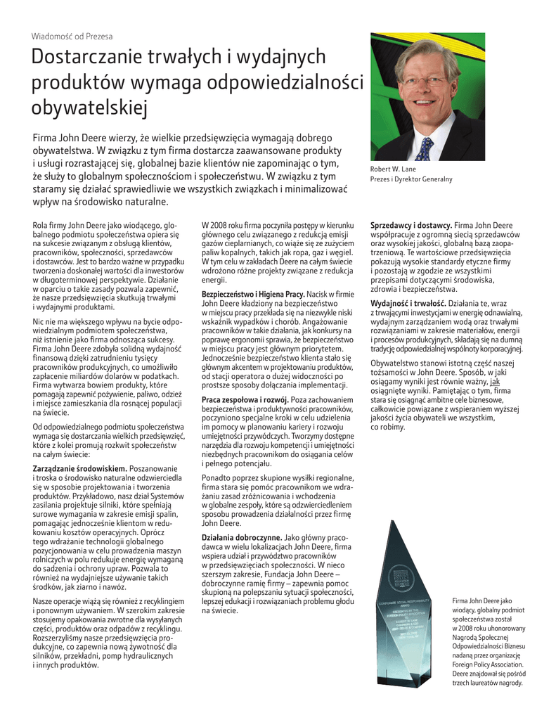 Wiadomość od Prezesa Dostarczanie trwałych i wydajnych produktów wymaga odpowiedzialności obywatelskiej Firma John Deere wierzy, że wielkie przedsięwzięcia wymagają dobrego obywatelstwa. W związku z tym firma dostarcza zaawansowane produkty i usługi rozrastającej się, globalnej bazie klientów nie zapominając o tym, że służy to globalnym społecznościom i społeczeństwu. W związku z tym staramy się działać sprawiedliwie we wszystkich związkach i minimalizować wpływ na środowisko naturalne. Rola firmy John Deere jako wiodącego, globalnego podmiotu społeczeństwa opiera się na sukcesie związanym z obsługą klientów, pracowników, społeczności, sprzedawców i dostawców. Jest to bardzo ważne w przypadku tworzenia doskonałej wartości dla inwestorów w długoterminowej perspektywie. Działanie w oparciu o takie zasady pozwala zapewnić, że nasze przedsięwzięcia skutkują trwałymi i wydajnymi produktami. Nic nie ma większego wpływu na bycie odpowiedzialnym podmiotem społeczeństwa, niż istnienie jako firma odnosząca sukcesy. Firma John Deere zdobyła solidną wydajność finansową dzięki zatrudnieniu tysięcy pracowników produkcyjnych, co umożliwiło zapłacenie miliardów dolarów w podatkach. Firma wytwarza bowiem produkty, które pomagają zapewnić pożywienie, paliwo, odzież i miejsce zamieszkania dla rosnącej populacji na świecie. Od odpowiedzialnego podmiotu społeczeństwa wymaga się dostarczania wielkich przedsięwzięć, które z kolei promują rozkwit społeczeństw na całym świecie: Zarządzanie środowiskiem. Poszanowanie i troska o środowisko naturalne odzwierciedla się w sposobie projektowania i tworzenia produktów. Przykładowo, nasz dział Systemów zasilania projektuje silniki, które spełniają surowe wymagania w zakresie emisji spalin, pomagając jednocześnie klientom w redukowaniu kosztów operacyjnych. Oprócz tego wdrażanie technologii globalnego pozycjonowania w celu prowadzenia maszyn rolniczych w polu redukuje energię wymaganą do sadzenia i ochrony upraw. Pozwala to również na wydajniejsze używanie takich środków, jak ziarno i nawóz. Nasze operacje wiążą się również z recyklingiem i ponownym używaniem. W szerokim zakresie stosujemy opakowania zwrotne dla wysyłanych części, produktów oraz odpadów z recyklingu. Rozszerzyliśmy nasze przedsięwzięcia produkcyjne, co zapewnia nową żywotność dla silników, przekładni, pomp hydraulicznych i innych produktów. W 2008 roku firma poczyniła postępy w kierunku głównego celu związanego z redukcją emisji gazów cieplarnianych, co wiąże się ze zużyciem paliw kopalnych, takich jak ropa, gaz i węgiel. W tym celu w zakładach Deere na całym świecie wdrożono różne projekty związane z redukcja energii. Bezpieczeństwo i Higiena Pracy. Nacisk w firmie John Deere kładziony na bezpieczeństwo w miejscu pracy przekłada się na niezwykle niski wskaźnik wypadków i chorób. Angażowanie pracowników w takie działania, jak konkursy na poprawę ergonomii sprawia, że bezpieczeństwo w miejscu pracy jest głównym priorytetem. Jednocześnie bezpieczeństwo klienta stało się głównym akcentem w projektowaniu produktów, od stacji operatora o dużej widoczności po prostsze sposoby dołączania implementacji. Praca zespołowa i rozwój. Poza zachowaniem bezpieczeństwa i produktywności pracowników, poczyniono specjalne kroki w celu udzielenia im pomocy w planowaniu kariery i rozwoju umiejętności przywódczych. Tworzymy dostępne narzędzia dla rozwoju kompetencji i umiejętności niezbędnych pracownikom do osiągania celów i pełnego potencjału. Robert W. Lane Prezes i Dyrektor Generalny Sprzedawcy i dostawcy. Firma John Deere współpracuje z ogromną siecią sprzedawców oraz wysokiej jakości, globalną bazą zaopatrzeniową. Te wartościowe przedsięwzięcia pokazują wysokie standardy etyczne firmy i pozostają w zgodzie ze wszystkimi przepisami dotyczącymi środowiska, zdrowia i bezpieczeństwa. Wydajność i trwałość. Działania te, wraz z trwającymi inwestycjami w energię odnawialną, wydajnym zarządzaniem wodą oraz trwałymi rozwiązaniami w zakresie materiałów, energii i procesów produkcyjnych, składają się na dumną tradycję odpowiedzialnej wspólnoty korporacyjnej. Obywatelstwo stanowi istotną część naszej tożsamości w John Deere. Sposób, w jaki osiągamy wyniki jest równie ważny, jak osiągnięte wyniki. Pamiętając o tym, firma stara się osiągnąć ambitne cele biznesowe, całkowicie powiązane z wspieraniem wyższej jakości życia obywateli we wszystkim, co robimy. Ponadto poprzez skupione wysiłki regionalne, firma stara się pomóc pracownikom we wdrażaniu zasad zróżnicowania i wchodzenia w globalne zespoły, które są odzwierciedleniem sposobu prowadzenia działalności przez firmę John Deere. Działania dobroczynne. Jako główny pracodawca w wielu lokalizacjach John Deere, firma wspiera udział i przywództwo pracowników w przedsięwzięciach społeczności. W nieco szerszym zakresie, Fundacja John Deere – dobroczynne ramię firmy – zapewnia pomoc skupioną na polepszaniu sytuacji społeczności, lepszej edukacji i rozwiązaniach problemu głodu na świecie. Firma John Deere jako wiodący, globalny podmiot społeczeństwa został w 2008 roku uhonorowany Nagrodą Społecznej Odpowiedzialności Biznesu nadaną przez organizację Foreign Policy Association. Deere znajdował się pośród trzech laureatów nagrody.
