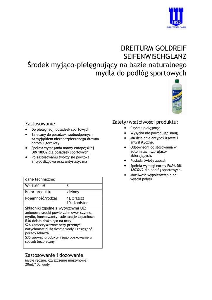DREITURM GOLDREIF SEIFENWISCHGLANZ Środek myjąco-pielęgnujący na bazie naturalnego mydła do podłóg sportowych Zalety/właściwości produktu: Zastosowanie: Do pielęgnacji posadzek sportowych. Zalecany do posadzek wodoodpornych za wyjątkiem niezabezpieczonego drewna chromu ,terakoty. Spełnia wymagania normy europejskiej DIN 18032 dla posadzek sportowych. Po zastosowaniu tworzy się powłoka antypoślizgowa oraz antystatyczna dane techniczne: Wartość pH 8 Kolor produktu zielony Pojemność/rodzaj 1L x 12szt 10L kanister Składniki zgodne z wytycznymi UE: anionowe środki powierzchniowo- czynne, mydło, konserwanty, substancje zapachowe R46 działa drażniąco na oczy S26 zanieczyszczone oczy przemyć natychmiast dużą ilością wody i zasięgnąć porady lekarza S35 usuwać produkty i jego opakowanie w sposób bezpieczny Zastosowanie i dozowanie Mycie ręczne, czyszczenie maszynowe: 20ml/10L wody Czyści i pielęgnuje. Wysycha nie powodując smug. Ma działanie antypoślizgowe i antystatyczne. Odpowiedni do stosowania w automatach szorującozbierających. Posiada świeży zapach. Spełnia wymogi normy FMPA DIN 18032/2 dla podłóg sportowych. Możliwość wypolerowania na wysoki połysk.