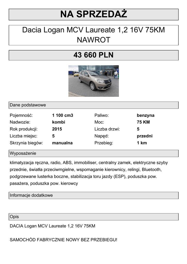 NA SPRZEDAŻ Dacia Logan MCV Laureate 1,2 16V 75KM NAWROT 43 660 PLN Dane podstawowe Pojemność: 1 100 cm3 Paliwo: benzyna Nadwozie: kombi Moc: 75 KM Rok produkcji: 2015 Liczba drzwi: 5 Liczba miejsc: 5 Napęd: przedni Skrzynia biegów: manualna Przebieg: 1 km Wyposażenie klimatyzacja ręczna, radio, ABS, immobiliser, centralny zamek, elektryczne szyby przednie, światła przeciwmgielne, wspomaganie kierownicy, relingi, Bluetooth, podgrzewane lusterka boczne, stabilizacja toru jazdy (ESP), poduszka pow. pasażera, poduszka pow. kierowcy Informacje dodatkowe Opis DACIA Logan MCV Laureate 1,2 16V 75KM SAMOCHÓD FABRYCZNIE NOWY BEZ PRZEBIEGU! SAMOCHÓD SPRZEDAJE AUTORYZOWANY DEALER RENAULT. WYPOSAŻENIE: - ABS, - system ESC, - klimatyzacja manualna, - światła przeciwmgłowe, - komputer pokładowy, - szyby przednie el. regulowane, - c.zamek sterowany falami radiowymi, - zderzaki w kolorze nadwozia, - lakier metalizowany Beż Popielaty. W OFERCIE POSIADAMY ATRAKCYJNY KREDYT/LEASING: PRZYJMUJEMY SAMOCHODY W ROZLICZENIU. ZAPRASZAMY DO NASZYCH SALONÓW: Długołęka ul. Wrocławska 33B pn-pt. 8.00-19.00 sob. 8.00-14.00 tel. 071 315 21 09 Wrocław ul. Sienkiewicza 10 tel. 071 322 66 77 WIĘCEJ INFO: KAMIL KNYSZ 603 395 522 MARCIN BEDNARSKI 669 688 988 pn-pt. 9.00-18.00 sob. 8.00-14.00 MONIKA POPŁAWSKA 669 510 191 JAROSŁAW LEMANIK 669 511 652 Niniejsza oferta jest wyłącznie informacją handlową i nie stanowi oferty w rozumieniu przepisów kodeksu cywilnego