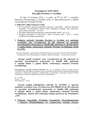 Protokół nr 74/IV/2012 Zarządu Powiatu w Gryfinie W dniu 12 kwietnia 2012 r. w godz. od 800 do 1010 w siedzibie Starostwa Powiatowego w Gryfinie, przy ul. Sprzymierzonych 4, odbyło się posiedzenie Zarządu Powiatu. I. SPRAWY ORGANIZACYJNE 1. Po stwierdzeniu quorum posiedzenie otworzył i prowadził – Starosta Wojciech Konarski. W posiedzeniu udział wzięli Członkowie Zarządu oraz zaproszeni goście (listy obecności – zał. nr 1). 2. Porządek obrad został przyjęty bez zmian (porządek obrad - zał. nr 2). 3. Przyjęcie protokołu Nr 73/IV/2012 z dnia 5 kwietnia 2012 r. 2012 r. zostało przełożone na kolejne posiedzenie. 1. Podjęcie uchwały Zarządu Powiatu w Gryfinie w/s ustalenia wysokości ceny wywoławczej do III rokowań na sprzedaż nieruchomości oznaczonej nr działki 688, położonej w obrębie Banie 2, gmina Banie, stanowiącej własność Powiatu Gryfińskiego (druk nr 1/74). Od tego momentu w posiedzeniu Zarządu Powiatu uczestniczyła Naczelnik Wydziału Gospodarki Nieruchomościami i Nadzoru Właścicielskiego – Lucyna Zawierucha. Zarząd ustalił wysokość ceny wywoławczej do III rokowań na sprzedaż nieruchomości oznaczonej nr działki 688, położonej w obrębie Banie 2, gmina Banie, stanowiącej własność Powiatu Gryfińskiego. Przewodniczący Zarządu Wojciech Konarski: Kto jest za podjęciem uchwały Zarządu Powiatu w Gryfinie w sprawie ustalenia wysokości ceny wywoławczej do III rokowań na sprzedaż nieruchomości oznaczonej nr działki 688, położonej w obrębie Banie 2, gmina Banie, stanowiącej własność Powiatu Gryfińskiego w brzmieniu zaproponowanym przez wnioskodawcę? Za – 4 osoby, Przeciw – 0 osób, Wstrzymało się – 0 osób Zarząd podjął jednogłośnie uchwałę Nr 242/2012 w sprawie ustalenia wysokości ceny wywoławczej (619 900,00 zł) do III rokowań na sprzedaż nieruchomości oznaczonej nr działki 688, położonej w obrębie Banie 2, gmina Banie, stanowiącej własność Powiatu Gryfińskiego. Nadzór nad realizacją zadania powierza się Wydziałowi „GN”. 2. Wniosek Naczelnika Wydziału Gospodarki Nieruchomościami i Nadzoru Właścicielskiego w/s rozpatrzenia wniosku Prezesa 1 Spółki Szpital Powiatowy w Gryfinie o wyrażenie zgody na poddzierżawę części działki nr 162/1, obręb Gryfino (druk nr 2/74). Na wniosek Naczelnika Wydziału Gospodarki Nieruchomościami i Nadzoru Właścicielskiego, Zarząd jednogłośnie wyraził zgodę Prezesowi Spółki Szpital Powiatowy w Gryfinie na poddzierżawienie części nieruchomości niezabudowanej, oznaczonej nr działki 162/1 pod warunkiem uwzględnienia w umowie poddzierżawy w szczególności pkt D.1, D.2 i D.3 umowy zbycia udziałów należących do powiatu gryfińskiego w spółce „Szpital Powiatowy w Gryfinie sp. z o.o. wraz ze zobowiązaniami inwestycyjnymi kupującego, w ramach realizacji pakietu inwestycyjnego przedstawionego przez Spółkę Dom Lekarski w Szczecinie na okres nieprzekraczający okresu trwania umowy dzierżawy zawartej pomiędzy Powiatem Gryfińskim a Spółką Szpital Powiatowy w Gryfinie. Nadzór nad realizacją zadania powierza się Wydziałowi „GN”. W tym momencie posiedzenie Zarządu Powiatu opuściła Naczelnik Wydziału Gospodarki Nieruchomościami i Nadzoru Właścicielskiego – Lucyna Zawierucha. 3. Podjęcie uchwały Zarządu Powiatu w Gryfinie w/s określenia zasad organizacji szkół i placówek oświatowych prowadzonych przez Powiat Gryfiński w roku szkolnym 2012/2013 (druk nr 3/74). Od tego momentu w posiedzeniu Zarządu Powiatu uczestniczyła Naczelnik Wydziału Edukacji, Kultury, Sportu i Turystyki – Elżbieta Lorenowicz-Bień. Zarząd omówił projekt uchwały w sprawie określenia zasad organizacji szkół i placówek oświatowych prowadzonych przez Powiat Gryfiński w roku szkolnym 2012/2013. Przewodniczący Zarządu Wojciech Konarski: Kto jest za podjęciem uchwały Zarządu Powiatu w Gryfinie w sprawie określenia zasad organizacji szkół i placówek oświatowych prowadzonych przez Powiat Gryfiński w roku szkolnym 2012/2013 w brzmieniu zaproponowanym przez wnioskodawcę? Za – 4 osoby, Przeciw – 0 osób, Wstrzymało się – 0 osób Zarząd podjął jednogłośnie uchwałę Nr 243/2012 w sprawie określenia zasad organizacji szkół i placówek oświatowych prowadzonych przez Powiat Gryfiński w roku szkolnym 2012/2013. Nadzór nad realizacją zadania powierza się Wydziałowi „EK”. W tym momencie posiedzenie Zarządu Powiatu opuściła Naczelnik Wydziału Edukacji, Kultury, Sportu i Turystyki – Elżbieta Lorenowicz-Bień. 2 4. Wniosek Naczelnika Wydziału Zarządzania Drogami w/s wyrażenia zgody na zlecenie wykonania remontu nawierzchni na drodze powiatowej Nr 1384Z Kłodowo-Trzcińsko-Zdrój-Warnice na odcinku w m. Żelechowo (druk nr 4/74). Od tego momentu w posiedzeniu Zarządu Powiatu uczestniczył Zastępca Naczelnika Wydziału Zarządzania Drogami – Maria Ilińczyk. Na wniosek Naczelnika Wydziału Zarządzania Drogami, Zarząd jednogłośnie wyraził zgodę na zlecenie firmie DATA-TRANS Usługi Sprzętowo-Transportowe Roboty Drogowe z Pyrzyc wykonania remontu nawierzchni na drodze powiatowej Nr 1384Z KłodowoTrzcińsko-Zdrój-Warnice na odcinku w m. Żelechowo za kwotę 15 645,60 zł brutto. Nadzór nad realizacją zadania powierza się Wydziałowi „ZD”. 5. Wniosek Naczelnika Wydziału Zarządzania Drogami oraz Naczelnika Wydziału Ochrony Środowiska, Rolnictwa i Leśnictwa w/s wyrażenia zgody na zlecenia likwidacji dzikich wysypisk i usuwanie zanieczyszczeń z pasów drogowych dróg powiatowych na terenie Powiatu Gryfińskiego (druk nr 5/74). Na wniosek Naczelnika Wydziału Zarządzania Drogami, Zarząd jednogłośnie wyraził zgodę na zlecenia likwidacji dzikich wysypisk i usuwanie zanieczyszczeń z pasów drogowych dróg powiatowych: - na terenie Gminy Trzcińsko-Zdrój - Zakład Komunalny z Trzcińska-Zdrój do kwoty 6 084,00 zł brutto, - na terenie Gminy Mieszkowice - Z