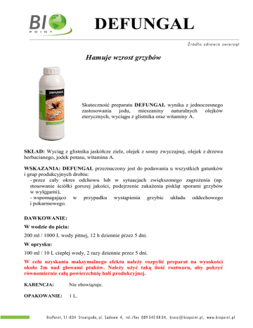 DEFUNGAL Hamuje wzrost grzybów Skuteczność preparatu DEFUNGAL wynika z jednoczesnego jednocze zastosowania jodu, mieszaniny naturalnych olejków eterycznych, wyciągu z glistnika oraz witaminy A. zwyczajnej olejek z drzewa SKŁAD: Wyciąg z glistnika jaskółcze ziele, olejek z sosny zwyczajnej, herbacianego, jodek potasu, witamina A. A WSKAZANIA: DEFUNGAL przeznaczony jest do podawania ia u wszystkich gatunków i grup produkcyjnych drobiu: - przez cały okres odchowu lub w sytuacjach zwiększonego zagroŜenia (np. stosowanie ściółki gorszej jakości, podejrzenie zakaŜenia piskląt sporami grzybów w wylęgarni), - wspomagająco w przypadku wystąpienia grzybic układu oddechowego i pokarmowego. DAWKOWANIE: W wodzie do picia: 200 ml / 1000 L wody pitnej, 12 h dziennie przez 5 dni. W oprysku: 100 ml / 10 L ciepłej wody, 2 razy dziennie przez 5 dni. W celu uzyskania ia maksymalnego efektu naleŜy rozpylić preparat na wysokości około 2m nad głowami ptaków. NaleŜy uŜyć taką ilość roztworu, aby pokryć równomiernie całą powierzchnię hali produkcyjnej. KARENCJA: Nie obowiązuje. OPAKOWANIE: 1 L.
