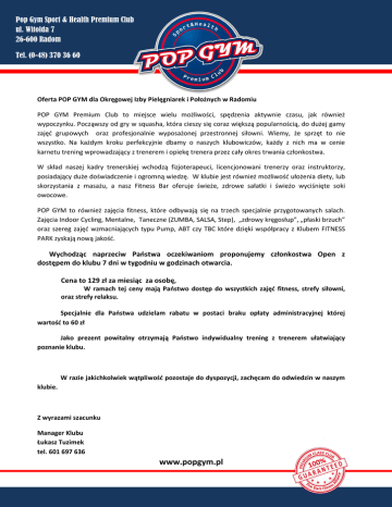 Pop Gym Sport & Health Premium Club ul. Witolda 7 26-600 Radom Tel. (0-48) 370 36 60 Oferta POP GYM dla Okręgowej Izby Pielęgniarek i Położnych w Radomiu POP GYM Premium Club to miejsce wielu możliwości, spędzenia aktywnie czasu, jak również wypoczynku. Począwszy od gry w squasha, która cieszy się coraz większą popularnością, do dużej gamy zajęć grupowych oraz profesjonalnie wyposażonej przestronnej siłowni. Wiemy, że sprzęt to nie wszystko. Na każdym kroku perfekcyjnie dbamy o naszych klubowiczów, każdy z nich ma w cenie karnetu trening wprowadzający z trenerem i opiekę trenera przez cały okres trwania członkostwa. W skład naszej kadry trenerskiej wchodzą fizjoterapeuci, licencjonowani trenerzy oraz instruktorzy, posiadający duże doświadczenie i ogromną wiedzę. W klubie jest również możliwość ułożenia diety, lub skorzystania z masażu, a nasz Fitness Bar oferuje świeże, zdrowe sałatki i świeżo wyciśnięte soki owocowe. POP GYM to również zajęcia fitness, które odbywają się na trzech specjalnie przygotowanych salach. Zajęcia Indoor Cycling, Mentalne, Taneczne (ZUMBA, SALSA, Step), „zdrowy kręgosłup”, „płaski brzuch” oraz szereg zajęć wzmacniających typu Pump, ABT czy TBC które dzięki współpracy z Klubem FITNESS PARK zyskają nową jakość. Wychodząc naprzeciw Państwa oczekiwaniom proponujemy członkostwa Open z dostępem do klubu 7 dni w tygodniu w godzinach otwarcia. Cena to 129 zł za miesiąc za osobę, W ramach tej ceny mają Państwo dostęp do wszystkich zajęć fitness, strefy siłowni, oraz strefy relaksu. Specjalnie dla Państwa udzielam rabatu w postaci braku opłaty administracyjnej której wartość to 60 zł Jako prezent powitalny otrzymają Państwo indywidualny trening z trenerem ułatwiający poznanie klubu. W razie jakichkolwiek wątpliwość pozostaje do dyspozycji, zachęcam do odwiedzin w naszym klubie. Z wyrazami szacunku Manager Klubu Łukasz Tuzimek tel. 601 697 636 www.popgym.pl