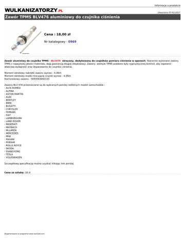 Informacje o produkcie Utworzono 07-03-2017 Zawór TPMS BLV476 aluminiowy do czujnika ciśnienia Cena : 18,00 zł Nr katalogowy : 0969 Zawór aluminiwy do czujnika TPMS - BLV476 skręcany, dedykowany do czujników pomiaru ciśnienia w oponach. Starannie wykonane zawory TPMS z najwyższej jakości materiału, dają gwarancją długiej eksploatacji. Zawory wentyle TPMS poddane były rygorystycznej kontroli, aby zapewnić właściwą wydajność oraz dopasowanie do czujnika ciśnienia. Moment obrotowy nakrętki zaworu wynosi - 4.0Nm Moment obrotowy śrubki mocującej czujnik wynosi - 4.0Nm Kod kreskowy zaworu - 5055563002133 Zawory BLV 476 przeznaczone są do wybranych poniżej niektórych modeli samochodów : - ALFA ROMEO - ALPINA - ASTON MARTIN - AUDI - BENTLEY - BMW - BUGATTI - CHRYSLER - FERRARI - FIAT - LAMBORGHINI - LAND ROVER - MASERATI - MAYBACH - McLAREN - MERCEDES - MINI - PAGANI - PORSHE - ROLLS ROYCE - SKODA - SSANGYONG - TESLA - VOLKSWAGEN Szczegółową specyfikację można uzyskać klikając link poniżej. Cena za sztukę: 18 zł Wygenerowano w programie www.oscGold.com