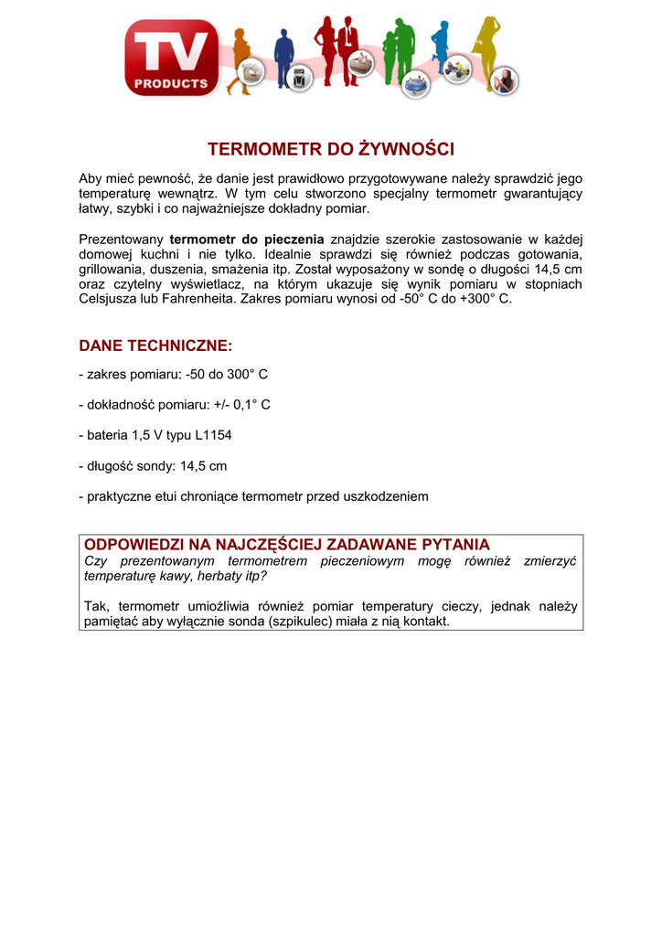 TERMOMETR DO ŻYWNOŚCI Aby mieć pewność, że danie jest prawidłowo przygotowywane należy sprawdzić jego temperaturę wewnątrz. W tym celu stworzono specjalny termometr gwarantujący łatwy, szybki i co najważniejsze dokładny pomiar. Prezentowany termometr do pieczenia znajdzie szerokie zastosowanie w każdej domowej kuchni i nie tylko. Idealnie sprawdzi się również podczas gotowania, grillowania, duszenia, smażenia itp. Został wyposażony w sondę o długości 14,5 cm oraz czytelny wyświetlacz, na którym ukazuje się wynik pomiaru w stopniach Celsjusza lub Fahrenheita. Zakres pomiaru wynosi od -50° C do +300° C. DANE TECHNICZNE: - zakres pomiaru: -50 do 300° C - dokładność pomiaru: +/- 0,1° C - bateria 1,5 V typu L1154 - długość sondy: 14,5 cm - praktyczne etui chroniące termometr przed uszkodzeniem ODPOWIEDZI NA NAJCZĘŚCIEJ ZADAWANE PYTANIA Czy prezentowanym termometrem temperaturę kawy, herbaty itp? pieczeniowym mogę również zmierzyć Tak, termometr umiożliwia również pomiar temperatury cieczy, jednak należy pamiętać aby wyłącznie sonda (szpikulec) miała z nią kontakt.