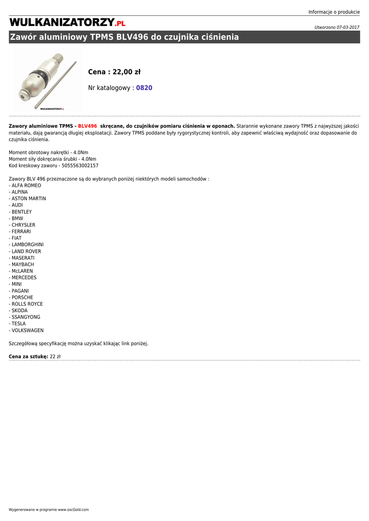 Informacje o produkcie Utworzono 07-03-2017 Zawór aluminiowy TPMS BLV496 do czujnika ciśnienia Cena : 22,00 zł Nr katalogowy : 0820 Zawory aluminiowe TPMS - BLV496 skręcane, do czujników pomiaru ciśnienia w oponach. Starannie wykonane zawory TPMS z najwyższej jakości materiału, dają gwarancją długiej eksploatacji. Zawory TPMS poddane były rygorystycznej kontroli, aby zapewnić właściwą wydajność oraz dopasowanie do czujnika ciśnienia. Moment obrotowy nakrętki - 4.0Nm Moment siły dokręcania śrubki - 4.0Nm Kod kreskowy zaworu - 5055563002157 Zawory BLV 496 przeznaczone są do wybranych poniżej niektórych modeli samochodów : - ALFA ROMEO - ALPINA - ASTON MARTIN - AUDI - BENTLEY - BMW - CHRYSLER - FERRARI - FIAT - LAMBORGHINI - LAND ROVER - MASERATI - MAYBACH - McLAREN - MERCEDES - MINI - PAGANI - PORSCHE - ROLLS ROYCE - SKODA - SSANGYONG - TESLA - VOLKSWAGEN Szczegółową specyfikację można uzyskać klikając link poniżej. Cena za sztukę: 22 zł Wygenerowano w programie www.oscGold.com