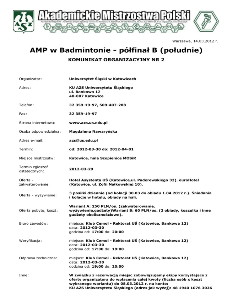 Warszawa, 14.03.2012 r. AMP w Badmintonie - półfinał B (południe) KOMUNIKAT ORGANIZACYJNY NR 2 Organizator: Uniwersytet Śląski w Katowicach Adres: KU AZS Uniwersytetu Śląskiego ul. Bankowa 12 40-007 Katowice Telefon: 32 359-19-97, 509-407-288 Fax: 32 359-19-97 Strona internetowa: www.azs.us.edu.pl Osoba odpowiedzialna: Magdalena Nawaryńska Adres e-mail: [email protected] Termin: od: 2012-03-30 do: 2012-04-01 Miejsce mistrzostw: Katowice, hala Szopienice MOSiR Termin zgłoszeń ostatecznych: 2012-03-29 Oferta zakwaterowanie: Hotel Asystenta UŚ (Katowice,ul. Paderewskiego 32). euroHotel (Katowice, ul. Zofii Nałkowskiej 10). Oferta - wyżywienie: 3 posiłki dziennie (od kolacji 30.03 do obiadu 1.04.2012 r.). Śniadania i kolacje w hotelu, obiady na hali. Oferta pobytu, koszt: Wariant A: 250 PLN/os. (zakwaterowanie, wyżywienie,gadżety)Wariant B: 60 PLN/os. (2 obiady, koszulka i inne gadżety okolicznościowe). Biuro zawodów: miejsce: Klub Cemol - Rektorat UŚ (Katowice, Bankowa 12) data: 2012-03-30 godzina od: 17:00 do: 20:00 Weryfikacja: miejsce: Klub Cemol - Rektorat UŚ (Katowice, Bankowa 12) data: 2012-03-30 godzina od: 17:30 do: 19:00 Odprawa techniczna: miejsce: Klub Cemol - Rektorat UŚ (Katowice, Bankowa 12) data: 2012-03-30 godzina od: 19:00 do: 20:00 Inne: W związku z rezerwacją miejsc zobowiązujemy ekipy korzystające z oferty organizatora do wpłacenia całej kwoty (liczba osób x koszt wybranego wariantu) do 08.03.2012 r. na konto: KU AZS Uniwersytetu Śląskiego (adres jak wyżej): 48 1940 1076 3036 7159 0000 0000 (bank Credit Agricole) z dopiskiem "AMP w badmintonie/nazwa Uczelni). Brak w/w wpłaty będzie traktowany jako rezygnacja z oferty organizatora. W przypadku problemów z płatnościami prosimy o kontakt z biurem AZS UŚ. Dla ekip korzystających z opcji organizatora zapewniamy transport rano na halę oraz wieczorem dowóz do hotelu (Hotel Asystencki UŚ). Organizator nie zapewnia lotek na zawody. Zgodnie z regulaminem PZB obowiązują tylko i wyłącznie lotki piórkowe. Kwota 250 zł przy fakturze za udział. Funkcja / imię i nazwisko organizatora: Maciej Kiesler - V-ce Prezes ds. organizacyjnych