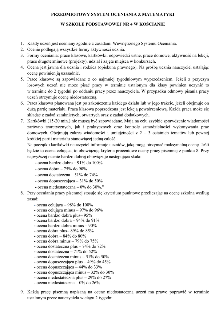 PRZEDMIOTOWY SYSTEM OCENIANIA Z MATEMATYKI W SZKOLE PODSTAWOWEJ NR 4 W KOŚCIANIE 1. Każdy uczeń jest oceniany zgodnie z zasadami Wewnętrznego Systemu Oceniania. 2. Ocenie podlegają wszystkie formy aktywności ucznia. 3. Formy oceniania: prace klasowe, kartkówki, odpowiedzi ustne, prace domowe, aktywność na lekcji, prace długoterminowe (projekty), udział i zajęte miejsca w konkursach. 4. Ocena jest jawna dla ucznia i rodzica (opiekuna prawnego). Na prośbę ucznia nauczyciel ustalając ocenę powinien ją uzasadnić. 5. Prace klasowe są zapowiadane z co najmniej tygodniowym wyprzedzeniem. Jeżeli z przyczyn losowych uczeń nie może pisać pracy w terminie ustalonym dla klasy powinien uczynić to w terminie do 2 tygodni po oddaniu pracy przez nauczyciela. W przypadku odmowy pisania pracy uczeń otrzymuje ocenę niedostateczną. 6. Praca klasowa planowana jest po zakończeniu każdego działu lub w jego trakcie, jeżeli obejmuje on dużą partię materiału. Praca klasowa poprzedzona jest lekcją powtórzeniową. Każda praca może się składać z zadań zamkniętych, otwartych oraz z zadań dodatkowych. 7. Kartkówki (15-20 min.) nie muszą być zapowiadane. Mają na celu szybkie sprawdzenie wiadomości zarówno teoretycznych, jak i praktycznych oraz kontrolę samodzielności wykonywania prac domowych. Obejmują zakres wiadomości i umiejętności z 2 – 3 ostatnich tematów lub pewnej krótkiej partii materiału stanowiącej jedną całość. Na początku kartkówki nauczyciel informuje uczniów, jaką mogą otrzymać maksymalną ocenę. Jeśli będzie to ocena celująca, to obowiązują kryteria procentowe oceny pracy pisemnej z punktu 8. Przy najwyższej ocenie bardzo dobrej obowiązuje następująca skala: - ocena bardzo dobra – 91% do 100% - ocena dobra – 75% do 90% - ocena dostateczna – 51% do 74% - ocena dopuszczająca – 31% do 50% - ocena niedostateczna – 0% do 30%." 8. Przy ocenianiu pracy pisemnej stosuje się kryterium punktowe przeliczając na ocenę szkolną według zasad: - ocena celująca – 98% do 100% - ocena celująca minus – 97% do 96% - ocena bardzo dobra plus– 95% - ocena bardzo dobra – 94% do 91% - ocena bardzo dobra minus – 90% - ocena dobra plus– 89% do 85% - ocena dobra – 84% do 80% - ocena dobra minus – 79% do 75% - ocena dostateczna plus – 74% do 72% - ocena dostateczna – 71% do 52% - ocena dostateczna minus – 51% do 50% - ocena dopuszczająca plus – 49% do 45% - ocena dopuszczająca – 44% do 33% - ocena dopuszczająca minus – 32% do 30% - ocena niedostateczna plus – 29% do 27% - ocena niedostateczna – 0% do 26% 9. Każdą pracę pisemną napisaną na ocenę niedostateczną uczeń ma prawo poprawić w terminie ustalonym przez nauczyciela w ciągu 2 tygodni. 10. Przy poprawianiu prac pisemnych i pisaniu ich w drugim terminie kryteria oceniania nie zmieniają się. 11. Sprawdzone i ocenione prace pisemne nauczyciel omawia w sali i daje do wglądu w terminie 2 tygodni od przeprowadzenia pracy. 12. Uczeń ma prawo w ciągu półrocza do dwukrotnego zgłoszenia nieprzygotowania do lekcji. Zgłoszenie nieprzygotowania nie dotyczy zapowiedzianych sprawdzianów pisemnych. Po wykorzystaniu limitu nauczyciel może postawić ocenę niedostateczną.