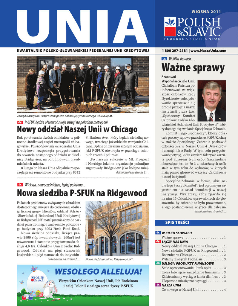 WIOSNA 2011 KWARTALNIK POLSKO-SŁOWIAŃSKIEJ FEDERALNEJ UNII KREDYTOWEJ 1 800 297-2181 | www.NaszaUnia.com 1 800 2971 W kilku słowach… Ważne sprawy Zarząd Naszej Unii i zaproszeni goście dokonują symbolicznego wbicia łopat. P-SFUK będzie oferować swoje usługi na południu metropolii Nowy oddział Naszej Unii w Chicago Rok po otwarciu dwóch oddziałów w północno-środkowej części metropolii chicagowskiej, Polsko-Słowiańska Federalna Unia Kre dy to wa roz po czę ła przy go to wa nia do otwarcia następnego oddziału w dziel nicy Bridgeview, na południowych przedmieściach miasta. 8 lutego br. Nasza Unia oficjalnie rozpoczęła prace remontowe budynku przy 8342 S. Harlem Ave., który będzie siedzibą nowego, trzeciego już oddziału w rejonie Chicago. Będzie on zarazem szóstym oddziałem, jaki P-SFUK otworzyła w przeciągu ostatnich trzech i pół roku. „Po naszym sukcesie w Mt. Prospect i Norridge lokalne organizacje polonijne sugerowały Bridgeview jako kolejne miejdokończenie na stronie 2… Większa, nowocześniejsza, lepiej położona... Nowa siedziba P-SFUK na Ridgewood Po latach problemów związanych z brakiem dostatecznego miejsca do codziennej obsłu gi licznej grupy klientów, oddział Polsko -Słowiańskiej Federalnej Unii Kredytowej na Ridgewood, NY został przeniesiony do bar dziej przestronnego i znakomicie położone go budynku przy 6903 Fresh Pond Road. Nowa siedziba oddziału, licząca prawie 2800 stóp kwadratowych (260m2) jest nowoczesna i starannie przygotowana do ob sługi 4,6 tys. Członków Unii z okolic Ridge wo od. Od dział ma pięć sta no wisk kasjerskich i pięć stanowisk do indywidu dokończenie na stronie 2… Szanowni Współwłaściciele Unii, Chciałbym Państwa poinformować, że większość członków Rady Dyrektorów zdecydo wanie sprzeciwia się próbie przejęcia naszej in sty tu cji przez tzw. „Spo łecz ny Ko mi tet Członków Polsko -Słowiańskiej Federalnej Unii Kredytowej”, który domaga się zwołania Specjalnego Zebrania. Komitet i jego „sponsorzy”, którzy opła cają procesy sądowe przeciwko P-SFUK, chcą w trakcie Specjalnego Zebrania pozbawić członkostwa w Naszej Unii 4 Dyrektorów i usunąć ich z Rady. W tym celu przygotowano petycję, która zawiera fałszywe zarzuty pod adresem tych osób. Szczególnie oburzające jest to, że 3 z oskarżanych osób staje w tym roku do wyborów, w których mają prawo głosować wszyscy Członkowie naszej instytucji. Specjalne Zebranie, w formie, jakiej so bie tego życzy „Komitet”, jest ogromnym zagrożeniem dla zasad demokracji w naszej in sty tu cji. Wy star czy, że by zja wi ło się na nim 15 Członków uprawnionych do głosowania, by zebranie to było prawomocne, a jego postanowienia wiążące dla całej indokończenie na stronie 2… SPIS TREŚCI Nowa siedziba Unii na Ridgewood, NY. Wesołego AllelujA! Wszystkim Członkom Naszej Unii, Ich Rodzinom i całej Polonii z całego serca życzy P-SFUK W KIlKu słoWACH Ważne sprawy . . . . . . . . . . . . . . . . . . . . . 1 łĄCZY NAs uNIA Nowy oddział Naszej Unii w Chicago . . . 1 Nowa siedziba P-SFUK na Ridgewood . . . 1 Rocznica w Chicago . . . . . . . . . . . . . . . . . 2 Witamy Związek Podhalan . . . . . . . . . . . 3 usługI I PRoDuKTY FINANsoWe Stałe oprocentowanie i brak opłat . . . . . . 3 Coraz łatwiejsze zarządzanie finansami . 3 Elektroniczny wyciąg z konta dla firm . . . 3 Ulepszone miesięczne wyciągi . . . . . . . . . 3 NAsZA uNIA Co nowego w Naszej Unii . . . . . . . . . . . . . 4 UNIA WIOSNA 2011 Ważne sprawy Nowy oddział Naszej Unii w Chicago …dokończenie ze strony 1 stytucji. Uważam, że o tym, kto powinien być członkiem Rady Dyrektorów, powinni decydować WSZYSCY Członkowie Unii – w demokratycznych wyborach. Smutnym jest fakt, że postępowanie „Komitetu”, które psuje reputację naszej instytucji, odciąga uwagę od osiągnięć Naszej Unii i jej bieżącej działalności. A w mijającym właśnie kwartale wydarzeń budujących prestiż i dobre imię naszej instytucji było bardzo wie le. Dla przykładu, rozpoczęliśmy nową edycję Programu Stypendialnego, przeznaczając na pomoc dla studentów 300 tys. dolarów. Oczekujemy, że skorzysta z niego około 300 studentów i absolwentów szkół średnich. Przez parę miesięcy trwały prace nad przeniesieniem siedziby naszego oddziału w Ridgewood do większego, bardziej nowoczesnego pomieszczenia. Oddział na Ridgewood, już w nowym, przestronnym miejscu, został uroczyście otwarty 21 stycznia br., a okoliczna Polonia, która przybyła na uroczystość, była bardzo zadowolona nie tylko z lokaliza cji oddziału, ale również z jego wyglądu i funkcjonalności. Wkrótce potem zorganizowaliśmy promocyjną uroczystość w Chicago, podczas której przedstawialiśmy dorobek naszych dwóch oddziałów, które funkcjonują tam od roku. Po skorygowaniu początkowych planów rozwoju Unii w Chicago, co było głównym punktem mojego programu wyborczego, roczna działalność P-SFUK na tamtejszym rynku przyniosła nam duży sukces i skłoniła Naszą Unię do otwarcia następnego oddziału w południowej części metropolii, gdzie zaprosili nas Podhalanie. 8 lutego br. rozpoczęliśmy prace nad stworzeniem tam nowego oddziału. Na początku marca br. przedłużyliśmy czas pracy aż sześciu oddziałów, co jest dużym ułatwieniem dla wielu osób, które do tychczas miały problemy z korzystaniem z naszych usług. Pod koniec marca rozpo częliśmy też nową promocję „Ambasador Unii”, której celem jest pozyskanie nowych Członków i nagrodzenie dotychczasowych Członków za lojalność i rekomendowanie naszych usług. Szkoda, że na wszystkie te osiągnięcia rzuca złe światło działalność „Komitetu”. Je żeli Sąd zadecyduje o konieczności odbycia Zebrania Specjalnego, poinformujemy Pań stwa o miejscu i czasie zebrania – prosimy też o liczne przybycie. O przyszłości Naszej Unii nie powinien dec
