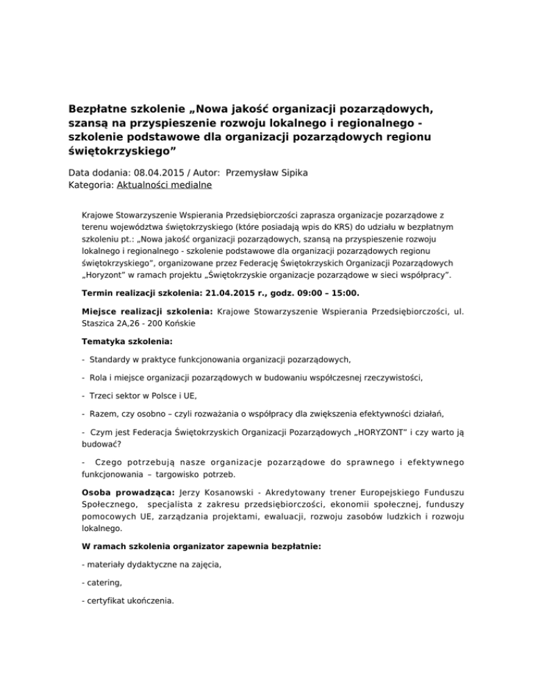 Bezpłatne szkolenie „Nowa jakość organizacji pozarządowych, szansą na przyspieszenie rozwoju lokalnego i regionalnego szkolenie podstawowe dla organizacji pozarządowych regionu świętokrzyskiego” Data dodania: 08.04.2015 / Autor: Przemysław Sipika Kategoria: Aktualności medialne Krajowe Stowarzyszenie Wspierania Przedsiębiorczości zaprasza organizacje pozarządowe z terenu województwa świętokrzyskiego (które posiadają wpis do KRS) do udziału w bezpłatnym szkoleniu pt.: „Nowa jakość organizacji pozarządowych, szansą na przyspieszenie rozwoju lokalnego i regionalnego - szkolenie podstawowe dla organizacji pozarządowych regionu świętokrzyskiego”, organizowane przez Federację Świętokrzyskich Organizacji Pozarządowych „Horyzont” w ramach projektu „Świętokrzyskie organizacje pozarządowe w sieci współpracy”. Termin realizacji szkolenia: 21.04.2015 r., godz. 09:00 – 15:00. Miejsce realizacji szkolenia: Krajowe Stowarzyszenie Wspierania Przedsiębiorczości, ul. Staszica 2A,26 - 200 Końskie Tematyka szkolenia: - Standardy w praktyce funkcjonowania organizacji pozarządowych, - Rola i miejsce organizacji pozarządowych w budowaniu współczesnej rzeczywistości, - Trzeci sektor w Polsce i UE, - Razem, czy osobno – czyli rozważania o współpracy dla zwiększenia efektywności działań, - Czym jest Federacja Świętokrzyskich Organizacji Pozarządowych „HORYZONT” i czy warto ją budować? - Czego potrzebują nasze organizacje pozarządowe do sprawnego i efektywnego funkcjonowania – targowisko potrzeb. Osoba prowadząca: Jerzy Kosanowski - Akredytowany trener Europejskiego Funduszu Społecznego, specjalista z zakresu przedsiębiorczości, ekonomii społecznej, funduszy pomocowych UE, zarządzania projektami, ewaluacji, rozwoju zasobów ludzkich i rozwoju lokalnego. W ramach szkolenia organizator zapewnia bezpłatnie: - materiały dydaktyczne na zajęcia, - catering, - certyfikat ukończenia. Zgłoszenia na szkolenie przyjmowane są telefonicznie lub e-mailowo (dane kontaktowe poniżej), albo za pomocą formularza on-line na stronie internetowej www.federacjahoryzont.pl. Osoba do kontaktów: a) KSWP: Marta Strzelczyk, tel.: 41 260 46 17, e-mail: [email protected] b) OPIWPR: Łukasz Boduszek, tel.: 668 019 303, e-mail: [email protected]