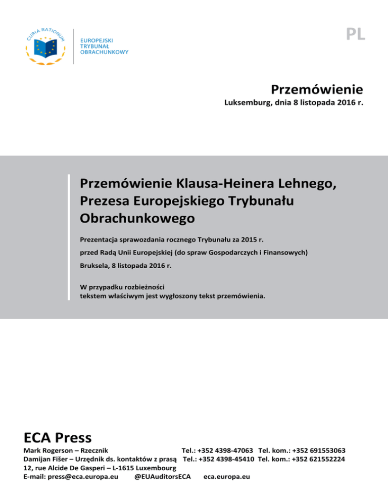 PL Przemówienie Luksemburg, dnia 8 listopada 2016 r. Przemówienie Klausa-Heinera Lehnego, Prezesa Europejskiego Trybunału Obrachunkowego Prezentacja sprawozdania rocznego Trybunału za 2015 r. przed Radą Unii Europejskiej (do spraw Gospodarczych i Finansowych) Bruksela, 8 listopada 2016 r. W przypadku rozbieżności tekstem właściwym jest wygłoszony tekst przemówienia. ECA Press Mark Rogerson – Rzecznik Tel.: +352 4398-47063 Tel. kom.: +352 691553063 Damijan Fišer – Urzędnik ds. kontaktów z prasą Tel.: +352 4398-45410 Tel. kom.: +352 621552224 12, rue Alcide De Gasperi – L-1615 Luxembourg E-mail: [email protected] @EUAuditorsECA eca.europa.eu Szanowny Panie Przewodniczący! Szanowne Panie Minister, szanowni Panowie Ministrowie! Czuję się zaszczycony, że mam dziś możliwość przedstawić Państwu wyniki prac Europejskiego Trybunału Obrachunkowego. Jest to pierwsze posiedzenie Rady Ecofin, w którym uczestniczę w roli prezesa Trybunału, i chciałbym skorzystać z tej okazji, żeby wybiec w przyszłość, a także spojrzeć wstecz. Chciałbym rozważyć, w jaki sposób zarządzanie finansami unijnymi powinno rozwijać się w nadchodzących latach, a jednocześnie wziąć pod uwagę wydarzenia z niedawnej przeszłości. Sądzę, że jako instytucje europejskie w pewnym stopniu utraciliśmy zaufanie obywateli Unii. To od nich pochodzą środki finansowe, które wydatkujemy, a odzyskanie ich zaufania będzie dla Unii poważnym wyzwaniem. Nie ulega wątpliwości, że konieczne jest przeprowadzenie reform i że muszą one opierać się na solidnych podstawach finansowych. Przekłada się to moim zdaniem na cztery elementy – Unia musi prowadzić solidną rachunkowość finansową, zagwarantować prawidłowe stosowanie unijnych przepisów finansowych, wykorzystywać środki w gospodarny sposób oraz zapewniać przejrzystość i wiarygodność rozliczeń. Obywatele UE nie obdarzą nas zaufaniem, jeśli nie będą przekonani, że dbamy o środki finansowe, które nam powierzyli, i że skrupulatnie rozliczamy się z podejmowanych w związku z nimi działań. W sprawozdaniu rocznym za 2015 r. Trybunał uznaje, że unijne sprawozdanie finansowe daje prawdziwy i rzetelny obraz sytuacji. Można jednak uczynić więcej. Komisja nie opracowała na przykład prognozy przepływu środków pieniężnych na najbliższe 7-10 lat. Tymczasem tego rodzaju prognoza przyczyniłaby się do odbudowy zaufania. Średnioterminowa prognoza Komisji dotycząca płatności stanowi natomiast krok w dobrym kierunku. Po drugie, Unia musi zagwarantować, że unijne przepisy finansowe będą odpowiednio stosowane. Środki finansowe zasilające obecny budżet unijny i z niego wypłacane są prawidłowo księgowane, ale wciąż pojawia się zbyt wiele błędów w zakresie ich wydatkowania. Ze sprawozdania rocznego Trybunału wynika, że szacowany poziom błędu wynosi 3,8%. Jest on zasadniczo zbliżony do poziomów z poprzednich lat, jednak nadal utrzymuje się powyżej poziomu oczekiwanego przez Trybunał. Błędy występują głównie na poziomie państw członkowskich. Na przykład w tegorocznym sprawozdaniu specjalnym Trybunału na temat pomocy państwa w obszarze polityki spójności ustalono, że w porównaniu z kontrolami przeprowadzanymi przez Trybunał i Komisję państwa członkowskie wykrywają jedynie co piąty przypadek naruszenia przepisów. 2 Komisja podjęła działania, by ulepszyć swoją ocenę ryzyka i zwiększyć wpływ działań naprawczych. Niemniej jednak i w tym przypadku istnieje pole do poprawy. Z perspektywy europejskiego podatnika byłoby o wiele lepiej, gdyby Komisja i państwa członkowskie dbały w pierwszej kolejności o prawidłowe wydawanie większej części środków. W sprawozdaniu specjalnym na temat transportu morskiego w UE Trybunał stwierdził wiele nieskutecznych i nietrwałych inwestycji w porty morskie, a także zwrócił uwagę na wysokie ryzyko, że zainwestowane środki w kwocie około 400 mln euro zostały zmarnotrawione. Trybunał uznał też, że często brakowało połączeń drogowych i kolejowych między portami a ich zapleczem lądowym bądź istniejące połączenia były nieodpowiednie. Oznacza to, że aby pierwotne inwestycje mogły zacząć funkcjonować, konieczne będą dodatkowe środki publiczne. Zalecenia sformułowane w sprawozdaniach Trybunału mają przyczyniać się do poprawy tego rodzaju inwestycji w przyszłości, co powinno pozwolić odbudować zaufanie naszych obywateli. Ponadto liczbę błędów można by ograniczyć, gdyby ulepszono koncepcję programów wydatkowania. Jak podkreślono w szeregu sprawozdań specjalnych Trybunału, odnosi się to w szczególności do sektora rolnictwa. Ludzie nie są w stanie zaufać systemowi, którego nie rozumieją. Dochodzimy tym samym do trzeciego elementu, o którym wspomniałem, czyli należytego zarządzania finansami. Nasi obywatele chcą i muszą mieć pewność, że Unia gwarantuje gospodarne wykorzystanie środków finansowych. Nawet bowiem dopilnowanie, by wszystkie środki zostały rozliczone i by przestrzegano wszystkich obowiązujących przepisów, nie może zagwarantować, że projekty współfinansowane przez Unię będą się charakteryzować gospodarnością. Obywatele muszą mieć wszak poczucie, że powierzone przez nich środki przynoszą im korzyści. Jeżeli ludzie nie są w stanie stwierdzić, czy dany system jest z ich perspektywy funkcjonalny, nie możemy oczekiwać, że będą mieli do niego zaufanie. Ponadto zaufanie wymaga przejrzystości i wiarygodności. Komisja musi przekazywać Parlamentowi i opinii publicznej właściwe informacje, a te muszą zostać należycie sprawdzone i poddane niezależnej kontroli. Niemniej rosnące wykorzystanie instrumentów finansowych, które nie są finansowane bezpośrednio z budżetu unijnego ani nie podlegają kontroli sprawowanej przez Trybunał, stwarza zwiększone zagrożenie dla przejrzystości, rozliczalności i koordynacji un