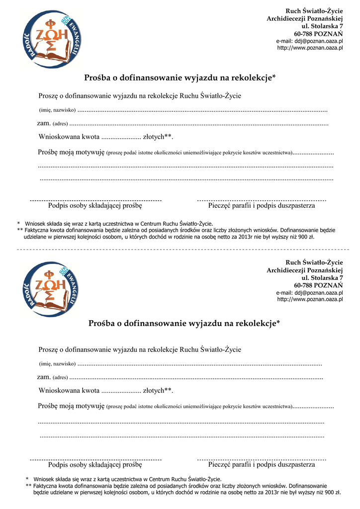 Ruch Światło-Życie Archidiecezji Poznańskiej ul. Stolarska 7 60-788 POZNAŃ e-mail: [email protected] http://www.poznan.oaza.pl Prośba o dofinansowanie wyjazdu na rekolekcje* Proszę o dofinansowanie wyjazdu na rekolekcje Ruchu Światło-Życie (imię, nazwisko) .......................................................................................................................................... zam. (adres) ............................................................................................................................................... Wnioskowana kwota ...................... złotych**. Prośbę moją motywuję (proszę podać istotne okoliczności uniemożliwiające pokrycie kosztów uczestnictwa)....................... ................................................................................................................................................................... .................................................................................................................................................................. Podpis osoby składającej prośbę Pieczęć parafii i podpis duszpasterza * Wniosek składa się wraz z kartą uczestnictwa w Centrum Ruchu Światło-Życie. ** Faktyczna kwota dofinansowania będzie zależna od posiadanych środków oraz liczby złożonych wniosków. Dofinansowanie będzie udzielane w pierwszej kolejności osobom, u których dochód w rodzinie na osobę netto za 2013r nie był wyższy niż 900 zł. Ruch Światło-Życie Archidiecezji Poznańskiej ul. Stolarska 7 60-788 POZNAŃ e-mail: [email protected] http://www.poznan.oaza.pl Prośba o dofinansowanie wyjazdu na rekolekcje* Proszę o dofinansowanie wyjazdu na rekolekcje Ruchu Światło-Życie (imię, nazwisko) ....................................................................................................................................... zam. (adres) ............................................................................................................................................ Wnioskowana kwota ...................... złotych**. Prośbę moją motywuję (proszę podać istotne okoliczności uniemożliwiające pokrycie kosztów uczestnictwa)....................... .............................................................................................................................................................. ............................................................................................................................................................. Podpis osoby składającej prośbę Pieczęć parafii i podpis duszpasterza * Wniosek składa się wraz z kartą uczestnictwa w Centrum Ruchu Światło-Życie. ** Faktyczna kwota dofinansowania będzie zależna od posiadanych środków oraz liczby złożonych wniosków. Dofinansowanie będzie udzielane w pierwszej kolejności osobom, u których dochód w rodzinie na osobę netto za 2013r nie był wyższy niż 900 zł. Oświadczam, że średni miesięczny dochód netto w 2013 r w przeliczeniu na osobę w mojej rodzinie wyniósł (właściwe zakreślić): □ Poniżej 500 zł □ 500 – 700 zł □ 700 – 900 zł □ więcej Aby obliczyć średni miesięczny dochód netto na osobę trzeba zsumować wszystkie dochody netto uzyskane w 2013 r. przez wszystkie osoby zamieszkujące w jednym gospodarstwie domowym (np. na podstawie deklaracji podatkowych, informacji od pracodawców, wyciągów bankowych) podzielić uzyskaną kwotę przez liczbę miesięcy (12) oraz przez liczbę osób zamieszkujących w jednym gospodarstwie domowym Podpis osoby składającej prośbę Oświadczam, że średni miesięczny dochód netto w 2013 r w przeliczeniu na osobę w mojej rodzinie wyniósł (właściwe zakreślić): □ Poniżej 500 zł □ 500 – 700 zł □ 700 – 900 zł □ więcej Aby obliczyć średni miesięczny dochód netto na osobę trzeba zsumować wszystkie dochody netto uzyskane w 2013 r. przez wszystkie osoby zamieszkujące w jednym gospodarstwie domowym (np. na podstawie deklaracji podatkowych, informacji od pracodawców, wyciągów bankowych) podzielić uzyskaną kwotę przez liczbę miesięcy (12) oraz przez liczbę osób zamieszkujących w jednym gospodarstwie domowym Podpis osoby składającej prośbę