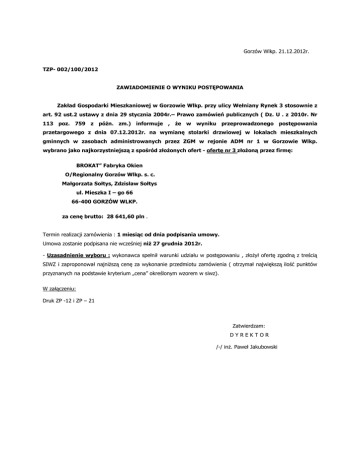 Gorzów Wlkp. 21.12.2012r. TZP- 002/100/2012 ZAWIADOMIENIE O WYNIKU POSTĘPOWANIA Zakład Gospodarki Mieszkaniowej w Gorzowie Wlkp. przy ulicy Wełniany Rynek 3 stosownie z art. 92 ust.2 ustawy z dnia 29 stycznia 2004r.– Prawo zamówień publicznych ( Dz. U . z 2010r. Nr 113 poz. 759 z póŜn. zm.) informuje , Ŝe w wyniku przeprowadzonego postępowania przetargowego z dnia 07.12.2012r. na wymianę stolarki drzwiowej w lokalach mieszkalnych gminnych w zasobach administrowanych przez ZGM w rejonie ADM nr 1 w Gorzowie Wlkp. wybrano jako najkorzystniejszą z spośród złoŜonych ofert - ofertę nr 3 złoŜoną przez firmę: BROKAT” Fabryka Okien O/Regionalny Gorzów Wlkp. s. c. Małgorzata Sołtys, Zdzisław Sołtys ul. Mieszka I – go 66 66-400 GORZÓW WLKP. za cenę brutto: 28 641,60 pln . Termin realizacji zamówienia : 1 miesiąc od dnia podpisania umowy. Umowa zostanie podpisana nie wcześniej niŜ 27 grudnia 2012r. - Uzasadnienie wyboru : wykonawca spełnił warunki udziału w postępowaniu , złoŜył ofertę zgodną z treścią SIWZ i zaproponował najniŜszą cenę za wykonanie przedmiotu zamówienia ( otrzymał największą ilość punktów przyznanych na podstawie kryterium „cena” określonym wzorem w siwz). W załączeniu: Druk ZP -12 i ZP – 21 Zatwierdzam: DYREKTOR /-/ inŜ. Paweł Jakubowski