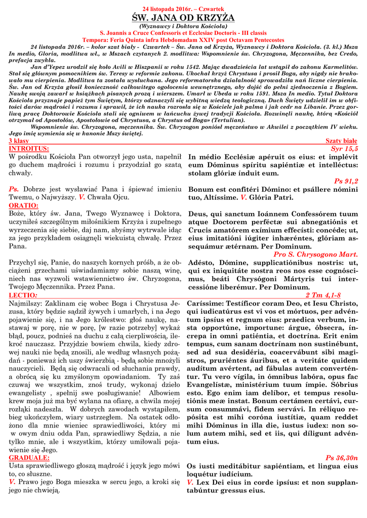 24 listopada 2016r. – Czwartek ŚW. JANA OD KRZYŻA (Wyznawcy i Doktora Kościoła) S. Joannis a Cruce Confessoris et Ecclesiae Doctoris - III classis Tempora: Feria Quinta infra Hebdomadam XXIV post Octavam Pentecostes 24 listopada 2016r. – kolor szat biały - Czwartek – Św. Jana od Krzyża, Wyznawcy i Doktora Kościoła. (3. kl.) Msza In medio, Gloria, modlitwa wł., w Mszach czytanych 2. modlitwa: Wspomnienie św. Chryzogona, Męczennika, bez Credo, prefacja zwykła. Jan d’Yepez urodził się koło Avili w Hiszpanii w roku 1542. Mając dwadzieścia lat wstąpił do zakonu Karmelitów. Stał się głównym pomocnikiem św. Teresy w reformie zakonu. Ukochał krzyż Chrystusa i prosił Boga, aby nigdy nie brakowało mu cierpienia. Modlitwa ta została wysłuchana. Jego reformatorska działalność sprowadziła nań liczne cierpienia. Św. Jan od Krzyża głosił konieczność całkowitego ogołocenia wewnętrznego, aby dojść do pełni zjednoczenia z Bogiem. Naukę swoją zawarł w książkach pisanych prozą i wierszem. Umarł w Ubeda w roku 1591. Msza In medio. Tytuł Doktora Kościoła przyznaje papież tym Świętym, którzy odznaczyli się wybitną wiedzą teologiczną. Duch Święty udzielił im w obfitości darów mądrości i rozumu i sprawił, że ich nauka rozrosła się w Kościele jak palma i jak cedr na Libanie. Przez gorliwą pracę Doktorowie Kościoła stali się ogniwem w łańcuchu żywej tradycji Kościoła. Rozwinęli naukę, którą «Kościół otrzymał od Apostołów, Apostołowie od Chrystusa, a Chrystus od Boga» (Tertulian). Wspomnienie św. Chryzogona, męczennika. Św. Chryzogon poniósł męczeństwo w Akwilei z początkiem IV wieku. Jego imię wymienia się w kanonie Mszy świętej. 3 klasy Szaty białe INTROITUS: Syr 15,5 W pośrodku Kościoła Pan otworzył jego usta, napełnił In médio Ecclésiæ apéruit os eius: et implévit go duchem mądrości i rozumu i przyodział go szatą eum Dóminus spíritu sapiéntiæ et intelléctus: chwały. stolam glóriæ índuit eum. Ps 91,2 Ps. Dobrze jest wysławiać Pana i śpiewać imieniu Bonum est confitéri Dómino: et psállere nómini Twemu, o Najwyższy. V. Chwała Ojcu. tuo, Altíssime. V. Glória Patri. ORATIO: Boże, który św. Jana, Twego Wyznawcę i Doktora, Deus, qui sanctum Ioánnem Confessórem tuum uczyniłeś szczególnym miłośnikiem Krzyża i zupełnego atque Doctorem perféctæ sui abnegatiónis et wyrzeczenia się siebie, daj nam, abyśmy wytrwale idąc Crucis amatórem exímium effecísti: concéde; ut, za jego przykładem osiągnęli wiekuistą chwałę. Przez eius imitatióni iúgiter inhæréntes, glóriam asPana. sequámur ætérnam. Per Dominum. Pro S. Chrysogono Mart. Przychyl się, Panie, do naszych kornych próśb, a że ob- Adésto, Dómine, supplicatiónibus nostris: ut, ciążeni grzechami uświadamiamy sobie naszą winę, qui ex iniquitáte nostra reos nos esse cognósciniech nas wyzwoli wstawiennictwo św. Chryzogona, mus, beáti Chrysógoni Mártyris tui interTwojego Męczennika. Przez Pana. cessióne liberémur. Per Dominum. LECTIO: 2 Tm 4,1-8 Najmilszy: Zaklinam cię wobec Boga i Chrystusa Je- Caríssime: Testíficor coram Deo, et Iesu Christo, zusa, który będzie sądził żywych i umarłych, i na Jego qui iudicatúrus est vi vos et mórtuos, per advénpojawienie się, i na Jego królestwo: głoś naukę, na- tum ipsíus et regnum eius: praedica verbum, instawaj w porę, nie w porę, [w razie potrzeby] wykaż sta opportúne, importune: árgue, óbsecra, ínbłąd, poucz, podnieś na duchu z całą cierpliwością, ile- crepa in omni patiéntia, et doctrína. Erit enim kroć nauczasz. Przyjdzie bowiem chwila, kiedy zdro- tempus, cum sanam doctrínam non sustinébunt, wej nauki nie będą znosili, ale według własnych pożą- sed ad sua desidéria, coacervábunt sibi magidań - ponieważ ich uszy świerzbią - będą sobie mnożyli stros, pruriéntes áuribus, et a veritáte quidem nauczycieli. Będą się odwracali od słuchania prawdy, audítum avértent, ad fábulas autem converténa obrócą się ku zmyślonym opowiadaniom. Ty zaś tur. Tu vero vígila, in ómnibus labóra, opus fac czuwaj we wszystkim, znoś trudy, wykonaj dzieło Evangelístæ, ministérium tuum ímpie. Sóbrius ewangelisty , spełnij swe posługiwanie! Albowiem esto. Ego enim iam delíbor, et tempus resolukrew moja już ma być wylana na ofiarę, a chwila mojej tiónis meæ instat. Bonum certámen certávi, currozłąki nadeszła. W dobrych zawodach wystąpiłem, sum consummávi, fidem servávi. In réliquo rebieg ukończyłem, wiary ustrzegłem. Na ostatek odło- pósita est mihi coróna iustítiæ, quam reddet żono dla mnie wieniec sprawiedliwości, który mi mihi Dóminus in illa die, iustus iudex: non sow owym dniu odda Pan, sprawiedliwy Sędzia, a nie lum autem mihi, sed et iis, qui díligunt advéntylko mnie, ale i wszystkim, którzy umiłowali poja- tum eius. wienie się Jego. GRADUALE: Ps 36,30n Usta sprawiedliwego głoszą mądrość i język jego mówi Os iusti meditábitur sapiéntiam, et lingua eius to, co słuszne. loquétur iudícium. V. Prawo jego Boga mieszka w sercu jego, a kroki się V. Lex Dei eius in corde ipsíus: et non supplanjego nie chwieją. tabúntur gressus eius. ALLELUJA: Alleluja, alleluja. V. Umiłował go Pan i przyozdobił, przyodział go szatą chwały. Alleluja. EVANGELIUM: Onego czasu: Rzekł Jezus uczniom swoim: Wy jesteście solą dla ziemi. Lecz jeśli sól utraci swój smak, czymże ją posolić? Na nic się już nie przyda, chyba na wyrzucenie i podeptanie przez ludzi. Wy jesteście światłem świata. Nie może się ukryć miasto położone na górze. Nie zapala się też światła i nie stawia pod korcem, ale na świeczniku, aby świeciło wszystkim, którzy są w domu. Tak niech świeci wasze światło przed ludźmi, aby widzieli wasze dobre uczynki i chwalili Ojca waszego, który jest w niebie. Nie sądźcie, że przyszedłem znieść Prawo albo P