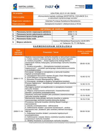 Nr projektu UDA-POKL.02.01.01-00-126/08 Tytuł projektu „Wzmocnienie kapitału ludzkiego MOSTOSTAL CHOJNICE S.A. w warunkach dynamicznego wzrostu” Organizator szkolenia Gdańska Fundacja Kształcenia Menedżerów Zarządzanie kosztami i efektywnością w firmie Tytuł szkolenia INFORMACJE OGÓLNE 1. 2. 3. 4. Planowany termin rozpoczęcia szkolenia Planowany termin zakończenia szkolenia Planowana łączna liczba godzin Planowana liczba osób 5. Miejsce szkolenia 2009-11-13 2009-11-14 32 12 Centrum Rehabilitacji-Wypoczynku UŁAN SPA ul. Tartaczna 10, 77-100 Bytów HARMONOGRAM SZKOLENIA Data realizacji szkolenia 2009-11-13 2009-11-14 Przedmiot / Temat Zadania nowoczesnego rachunku kosztów w łańcuchach dostaw a. Cztery zadania nowoczesnego rachunku kosztów logistyki; b. Analiza przypadku – „Koszt logistycznej obsługi klienta – porównanie metody tradycyjnej i procesowego rachunku kosztów (ABC/M)” c. Analiza przypadku – „Zarządzanie kosztami procesów logistycznych” – przykład operacyjnego doskonalenia procesów w przedsiębiorstwie. Koncepcje i strategie w zarządzaniu a rachunek kosztów logistyki przedsiębiorstwa a. Zarządzanie łańcuchem dostaw (Supply Chain Management); b. ECR (Efficient Consumer Response); c. Business Process Reengineering. (BPR); d. Koncepcje i strategie a systemy zarządzania kosztami. Procesy logistyczne – identyfikacja i metody pomiaru ich kosztów i efektywności Wymagany poziom szczegółowości w zarządzaniu kosztami łańcucha dostaw: a. Miejsca zróżnicowania rentowności i kosztochłonności klientów i produktów przedsiębiorstwa. Zasobowy rachunek kosztów jako podstawa zaawansowanego rachunku kosztów logistyki Mankamenty tradycyjnego rachunku kosztów a zadania nowoczesnego rachunku kosztów łańcucha dostaw Procesowy rachunek kosztów (Activity Based Costing) – wprowadzenie a. Zasoby przedsiębiorstwa - definiowanie b. Definiowanie działań i procesów biznesowych - analiza procesowa oraz „działania” jako centralny element koncepcji ABC/M; c. Kalkulacja kosztów działań i procesów logistycznych przedsiębiorstwa; d. Definiowanie i zasady doboru nośników kosztów działań w procesowym rachunku kosztów e. Obiekty Kosztowe w procesowym rachunku kosztów; „Projekt współfinansowany przez Unię Europejską w ramach Europejskiego Funduszu Społecznego” Godziny realizacji szkolenia 09:00-10:30 10:45-12:15 12:30-13:15 14:15-15:00 15:15-16:00 16:15-17:00 09:00-10:30 Krzywe wieloryba zyskowności klientów i produktów w systemach ABC/M – doświadczenia polskich przedsiębiorstw a. Krzywa wieloryba zyskowności klientów – interpretacja i omówienie przykładów; b. Krzywa wieloryba rentowności produktów – interpretacja i omówienie przykładów Kalkulacja kosztów Operacyjne i strategiczne zarządzanie kosztami działań (Strategic and Operational Activity Based Management – ABC) a. Techniki operacyjnego zarządzania kosztami logistyki (Operacyjne ABM) b. Techniki strategicznego zarządzania kosztami logistyki (Strategiczne ABM) Nowoczesny rachunek kosztów logistyki w polskich przedsiębiorstwach – doświadczenia z wdrożeń RAZEM „Projekt współfinansowany przez Unię Europejską w ramach Europejskiego Funduszu Społecznego” 10:45-12:15 12:30-13:15 14:15-15:00 15:15-16:00 16:15-17:00 16