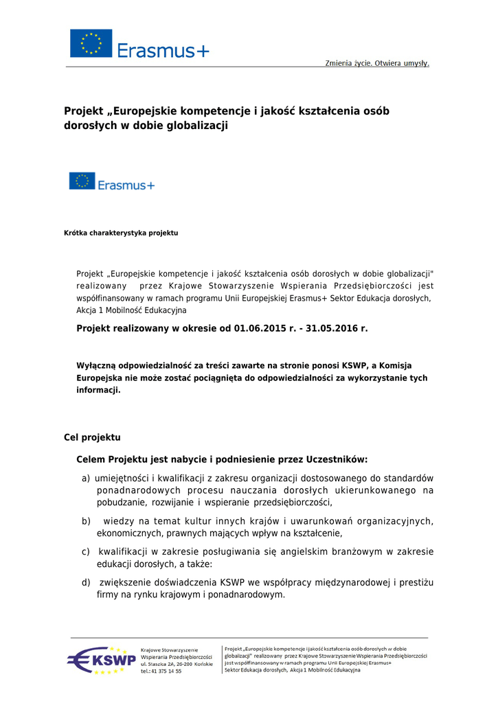 Projekt „Europejskie kompetencje i jakość kształcenia osób dorosłych w dobie globalizacji . Krótka charakterystyka projektu Projekt „Europejskie kompetencje i jakość kształcenia osób dorosłych w dobie globalizacji" realizowany przez Krajowe Stowarzyszenie Wspierania Przedsiębiorczości jest współfinansowany w ramach programu Unii Europejskiej Erasmus+ Sektor Edukacja dorosłych, Akcja 1 Mobilność Edukacyjna Projekt realizowany w okresie od 01.06.2015 r. - 31.05.2016 r. Wyłączną odpowiedzialność za treści zawarte na stronie ponosi KSWP, a Komisja Europejska nie może zostać pociągnięta do odpowiedzialności za wykorzystanie tych informacji. Cel projektu Celem Projektu jest nabycie i podniesienie przez Uczestników: a) umiejętności i kwalifikacji z zakresu organizacji dostosowanego do standardów ponadnarodowych procesu nauczania dorosłych ukierunkowanego na pobudzanie, rozwijanie i wspieranie przedsiębiorczości, b) wiedzy na temat kultur innych krajów i uwarunkowań organizacyjnych, ekonomicznych, prawnych mających wpływ na kształcenie, c) kwalifikacji w zakresie posługiwania się angielskim branżowym w zakresie edukacji dorosłych, a także: d) zwiększenie doświadczenia KSWP we współpracy międzynarodowej i prestiżu firmy na rynku krajowym i ponadnarodowym. Miejsce realizacji Końskie Grupa docelowa Uczestnikami Projektu będzie 10 osób, które spełnią łącznie następujące warunki: a) za są pracownikami KSWP zaangażowanymi w edukację dorosłych tj. osoby odpowiedzialne zarządzanie, przygotowanie, realizację szkoleń i projektów szkoleniowych, b) są trenerami/ konsultantami/ wykładowcami, c) posługują się angielskim na poziomie komunikatywnym, d) posiadają motywację do odbycia szkoleń w organizacjach przyjmujących (w Wielkiej Brytanii, Włoszech oraz Hiszpanii), e) f) zapoznają się i zaakceptują Regulamin rekrutacji i uczestnictwa w niniejszym projekcie, dostarczą do siedziby KSWP dokumenty rekrutacyjne we wskazanym okresie rekrutacji, g) zostaną zakwalifikowane przez Komisję Rekrutacyjną do udziału w projekcie, h) zawrą z KSWP umowy indywidualne i porozumienie o programie zajęć (określające konieczne do osiągnięcia docelowe efekty uczenia się, postanowienia dotyczące ich formalnego uznawania oraz wykaz praw i obowiązków każdej ze stron). Dostępne formy wsparcia Projekt przewiduje realizację działań: 1. przygotowawczych: a) 2 szkolenia z angielskiego dla dwóch 5-osobowych grup (30godz./gr) b) 1 szkolenie dla 10 uczestników projektu z przygotowania kulturowego (nt. kultury Wielkiej Brytanii, Włoch, Hiszpanii - po 16 godz. nauki o każdym państwie tj. łącznie 48 godz. zajęć) 2. w zakresie mobilności (po trzy wyjazdy dla każdej z dwóch 5-osobowych grup – łącznie 6 wyjazdów) tj.: a) 2 wyjazdy do organizacji przyjmującej w Wielkiej Brytanii (7 dni/ gr) b) 2 wyjazdy do organizacji przyjmującej w Włoszech (7 dni/ gr) c) 2 wyjazdy do organizacji przyjmującej w Hiszpanii (7 dni/ gr) Cel: odbycie przez uczestników projektu szkoleń (teoria + praktyka) z zakresu metod i technik kształcenia stosowanych w różnych krajach, wypracowanie dobrych praktyk i przeniesienia ich na Polski grunt. 3. następczych: opracowanie, upowszechnianie, wdrożenie wypracowanych w ramach projektu rezultatów W ramach projektu uczestnikom zapewnione zostaną m.in.: a) materiały szkoleniowe, b) ubezpieczenie podczas każdego wyjazdu realizowanego w ramach działań projektu w zakresie mobilności, c) współfinansowanie kosztów podróży i utrzymania w trakcie szkoleń odbywających się w ramach działań w zakresie mobilności. Każdy uczestnik po zakończeniu mobilności otrzyma akredytowany certyfikat mobilności Europass Mobility (w języku polskim i angielskim), a także zaświadczenie o ukończeniu szkolenia z zakresu języka angielskiego, zaświadczenie potwierdzające udział w szkoleniu kulturowym oraz zaświadczenie potwierdzające nabyte przez uczestników kompetencje podczas zagranicznych wyjazdów. Szczegółowych informacji o projekcie udziela: Olga Ciszewska - Asystentka Kierownika Projektu tel.: (41) 260 46 40 Elementy powiązane ● Trwają prace nad przygotowaniem rezultatów projektu Erasmus+! Pliki do pobrania ● ● ● ● ● ● ● ● . Formularz zgłoszeniowy do projektu Data dodania: 18.06.2015 Regulamin rekrutacji i uczestnictwa w projekcie Data dodania: 18.06.2015 Prezentacja multimedialna - dobre praktyki - Erasmus plus Data dodania: 09.08.2016 Ponadnarodowy standard kształcenia dorosłych w celu pobudzania i wspierania rozwoju przedsiębiorczości Data dodania: 09.08.2016 Publikacja na temat kształcenia osób dorosłych w dobie globalizacji Data dodania: 09.08.2016 Prezentacja multimedialna - dobre praktyki - Erasmus plus - wersja angielska Ponadnarodowy standard kształcenia dorosłych w celu pobudzania i wspierania rozwoju przedsiębiorczości - wersja angielska Data dodania: 10.08.2016 Publikacja na temat kształcenia osób dorosłych w dobie globalizacji - wersja angielska Data dodania: 10.08.2016