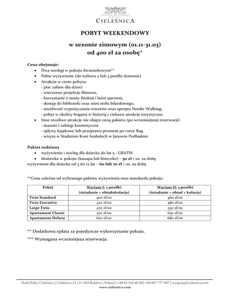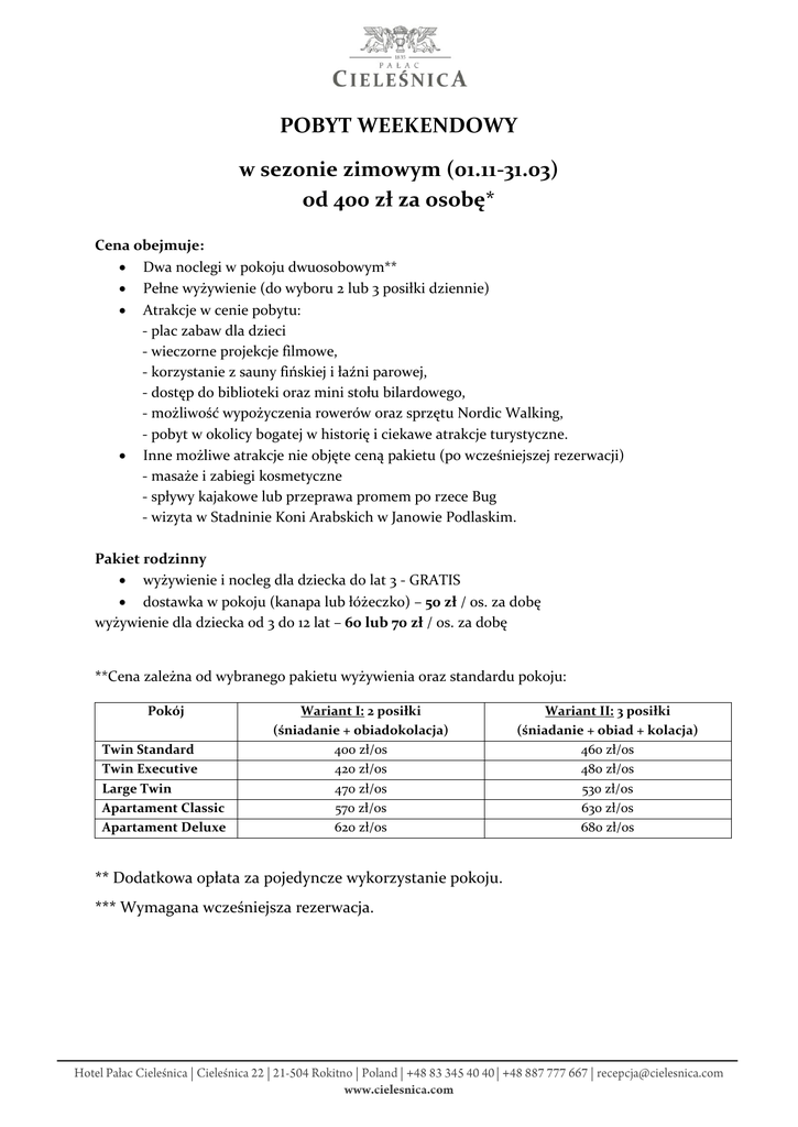 POBYT WEEKENDOWY w sezonie zimowym (01.11-31.03) od 400 zł za osobę* Cena obejmuje: Dwa noclegi w pokoju dwuosobowym** Pełne wyżywienie (do wyboru 2 lub 3 posiłki dziennie) Atrakcje w cenie pobytu: - plac zabaw dla dzieci - wieczorne projekcje filmowe, - korzystanie z sauny fińskiej i łaźni parowej, - dostęp do biblioteki oraz mini stołu bilardowego, - możliwość wypożyczenia rowerów oraz sprzętu Nordic Walking, - pobyt w okolicy bogatej w historię i ciekawe atrakcje turystyczne. Inne możliwe atrakcje nie objęte ceną pakietu (po wcześniejszej rezerwacji) - masaże i zabiegi kosmetyczne - spływy kajakowe lub przeprawa promem po rzece Bug - wizyta w Stadninie Koni Arabskich w Janowie Podlaskim. Pakiet rodzinny wyżywienie i nocleg dla dziecka do lat 3 - GRATIS dostawka w pokoju (kanapa lub łóżeczko) – 50 zł / os. za dobę wyżywienie dla dziecka od 3 do 12 lat – 60 lub 70 zł / os. za dobę **Cena zależna od wybranego pakietu wyżywienia oraz standardu pokoju: Pokój Twin Standard Twin Executive Large Twin Apartament Classic Apartament Deluxe Wariant I: 2 posiłki (śniadanie + obiadokolacja) 400 zł/os 420 zł/os 470 zł/os 570 zł/os 620 zł/os ** Dodatkowa opłata za pojedyncze wykorzystanie pokoju. *** Wymagana wcześniejsza rezerwacja. Wariant II: 3 posiłki (śniadanie + obiad + kolacja) 460 zł/os 480 zł/os 530 zł/os 630 zł/os 680 zł/os