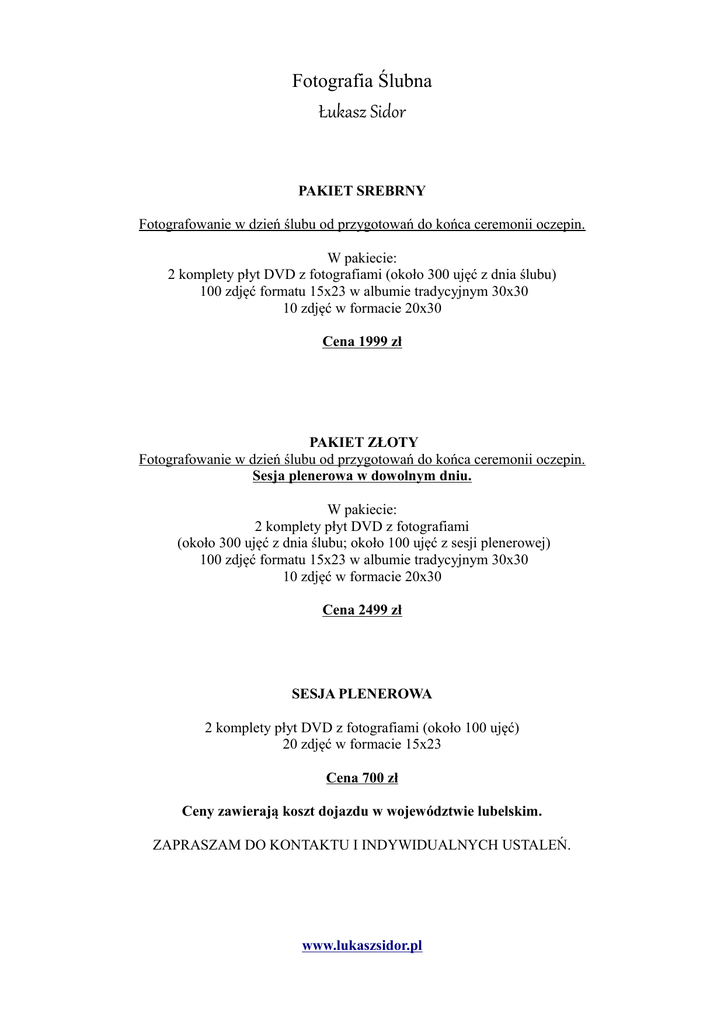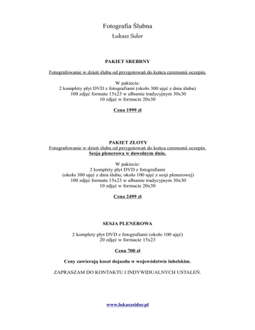 Fotografia Ślubna Łukasz Sidor PAKIET SREBRNY Fotografowanie w dzień ślubu od przygotowań do końca ceremonii oczepin. W pakiecie: 2 komplety płyt DVD z fotografiami (około 300 ujęć z dnia ślubu) 100 zdjęć formatu 15x23 w albumie tradycyjnym 30x30 10 zdjęć w formacie 20x30 Cena 1999 zł PAKIET ZŁOTY Fotografowanie w dzień ślubu od przygotowań do końca ceremonii oczepin. Sesja plenerowa w dowolnym dniu. W pakiecie: 2 komplety płyt DVD z fotografiami (około 300 ujęć z dnia ślubu; około 100 ujęć z sesji plenerowej) 100 zdjęć formatu 15x23 w albumie tradycyjnym 30x30 10 zdjęć w formacie 20x30 Cena 2499 zł SESJA PLENEROWA 2 komplety płyt DVD z fotografiami (około 100 ujęć) 20 zdjęć w formacie 15x23 Cena 700 zł Ceny zawierają koszt dojazdu w województwie lubelskim. ZAPRASZAM DO KONTAKTU I INDYWIDUALNYCH USTALEŃ. www.lukaszsidor.pl
