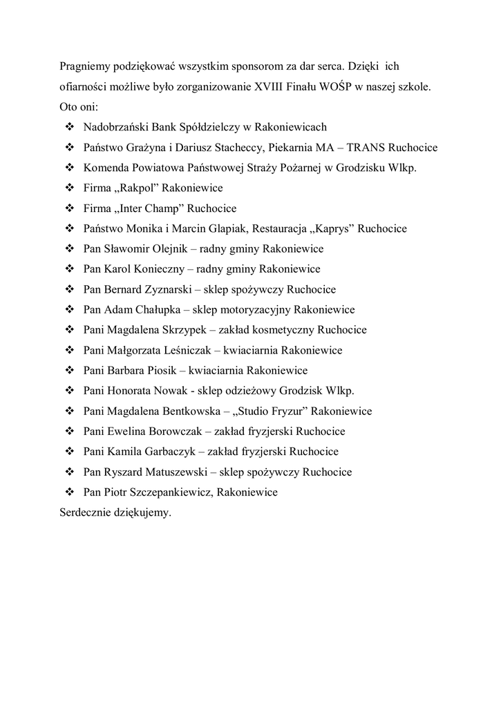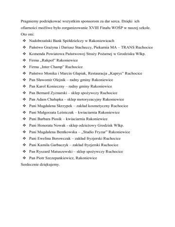 Pragniemy podziękować wszystkim sponsorom za dar serca. Dzięki ich ofiarności możliwe było zorganizowanie XVIII Finału WOŚP w naszej szkole. Oto oni: Nadobrzański Bank Spółdzielczy w Rakoniewicach Państwo Grażyna i Dariusz Stacheccy, Piekarnia MA – TRANS Ruchocice Komenda Powiatowa Państwowej Straży Pożarnej w Grodzisku Wlkp. Firma „Rakpol” Rakoniewice Firma „Inter Champ” Ruchocice Państwo Monika i Marcin Glapiak, Restauracja „Kaprys” Ruchocice Pan Sławomir Olejnik – radny gminy Rakoniewice Pan Karol Konieczny – radny gminy Rakoniewice Pan Bernard Zyznarski – sklep spożywczy Ruchocice Pan Adam Chałupka – sklep motoryzacyjny Rakoniewice Pani Magdalena Skrzypek – zakład kosmetyczny Ruchocice Pani Małgorzata Leśniczak – kwiaciarnia Rakoniewice Pani Barbara Piosik – kwiaciarnia Rakoniewice Pani Honorata Nowak - sklep odzieżowy Grodzisk Wlkp. Pani Magdalena Bentkowska – „Studio Fryzur” Rakoniewice Pani Ewelina Borowczak – zakład fryzjerski Ruchocice Pani Kamila Garbaczyk – zakład fryzjerski Ruchocice Pan Ryszard Matuszewski – sklep spożywczy Ruchocice Pan Piotr Szczepankiewicz, Rakoniewice Serdecznie dziękujemy.