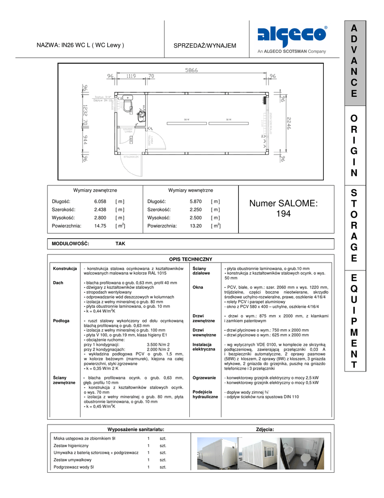 NAZWA: IN26 WC L ( WC Lewy ) A D V A N C E SPRZEDAŻ/WYNAJEM O R I G I N Wymiary zewnętrzne Wymiary wewnętrzne Długość: 6.058 [ m] Długość: 5.870 [ m] Szerokość: 2.438 [ m] Szerokość: 2.250 [ m] Wysokość: 2.800 [ m] Wysokość: 2.500 [ m] Powierzchnia: 14.75 [ m2] Powierzchnia: 13.20 [ m2] MODUŁOWOŚĆ: Numer SALOME: 194 TAK OPIS TECHNICZNY Konstrukcja - konstrukcja stalowa ocynkowana z kształtowników walcowanych malowana w kolorze RAL 1015 Dach - blacha profilowana o grub. 0,63 mm, profil 40 mm - dźwigary z kształtowników stalowych - stropodach wentylowany - odprowadzanie wód deszczowych w kolumnach - izolacja z wełny mineralnej o grub. 80 mm - płyta obustronnie laminowana, o grub. 10 mm - k = 0,44 W/m 2K Podłoga Ściany zewnętrzne - ruszt stalowy wykończony od dołu ocynkowaną blachą profilowaną o grub. 0,63 mm - izolacja z wełny mineralnej o grub. 100 mm - płyta V 100, o grub.19 mm, klasa higieny E1 - obciążenie ruchome: przy 1 kondygnacji: 3.500 N/m 2 przy 2 kondygnacjach: 2.000 N/m 2 - wykładzina podłogowa PCV o grub. 1,5 mm, w kolorze beżowym (marmurek), klejona na całej powierzchni, styki zgrzewane - k = 0,35 W/m 2 K - blacha profilowana ocynk. o grub. 0,63 mm, głęb. profilu 10 mm - konstrukcja z kształtowników stalowych ocynk. o wys. 70 mm - izolacja z wełny mineralnej o grub. 80 mm, płyta obustronnie laminowana, o grub. 10 mm - k = 0,45 W/m 2K Wyposażenie sanitariatu: Miska ustępowa ze zbiornikiem 9l 1 szt. Zestaw higieniczny 1 szt. Umywalka z baterią sztorcową + podgrzewacz 1 szt. Zestaw umywalkowy 1 szt. Podgrzewacz wody 5l 1 szt. Ściany działowe - płyta obustronnie laminowana, o grub.10 mm - konstrukcja z kształtowników stalowych ocynk. o wys. 50 mm Okna - PCV, białe, o wym.: szer. 2060 mm x wys. 1220 mm, trójdzielne, części boczne nieotwierane, skrzydło środkowe uchylno-rozwieralne, prawe, oszklenie 4/16/4 - rolety PCV i parapet aluminiowy - okno z PCV 580 x 400 – uchylne, oszklenie 4/16/4 Drzwi zewnętrzne - drzwi o wym.: 875 mm x 2000 mm, z klamkami i zamkiem patentowym Drzwi wewnętrzne - drzwi płycinowe o wym.: 750 mm x 2000 mm - drzwi płycinowe o wym.: 625 mm x 2000 mm Instalacja elektryczna - wg wytycznych VDE 0100, w komplecie ze skrzynką podłączeniową, zawierającą przełączniki 0,03 A i bezpieczniki automatyczne, 2 oprawy pasmowe (58W) z kloszem, 2 oprawy (9W) z kloszem, 3 gniazda wtykowe, 2 gniazda do grzejnika, puszkę na gniazdo telefoniczne i 3 przełączniki Ogrzewanie - konwektorowy grzejnik elektryczny o mocy 2,5 kW - konwektorowy grzejnik elektryczny o mocy 0,5 kW Podejścia hydrauliczne - dopływ wody zimnej ¾’ - odpływ ścieków rura spustowa DIN 110 Zdjęcia: S T O R A G E E Q U I P M E N T