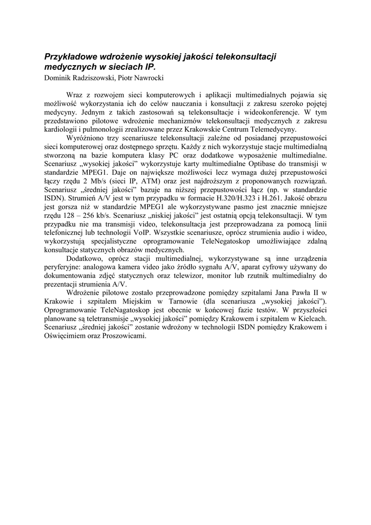 Przykładowe wdrożenie wysokiej jakości telekonsultacji medycznych w sieciach IP. Dominik Radziszowski, Piotr Nawrocki Wraz z rozwojem sieci komputerowych i aplikacji multimedialnych pojawia się możliwość wykorzystania ich do celów nauczania i konsultacji z zakresu szeroko pojętej medycyny. Jednym z takich zastosowań są telekonsultacje i wideokonferencje. W tym przedstawiono pilotowe wdrożenie mechanizmów telekonsultacji medycznych z zakresu kardiologii i pulmonologii zrealizowane przez Krakowskie Centrum Telemedycyny. Wyróżniono trzy scenariusze telekonsultacji zależne od posiadanej przepustowości sieci komputerowej oraz dostępnego sprzętu. Każdy z nich wykorzystuje stacje multimedialną stworzoną na bazie komputera klasy PC oraz dodatkowe wyposażenie multimedialne. Scenariusz „wysokiej jakości” wykorzystuje karty multimedialne Optibase do transmisji w standardzie MPEG1. Daje on największe możliwości lecz wymaga dużej przepustowości łączy rzędu 2 Mb/s (sieci IP, ATM) oraz jest najdroższym z proponowanych rozwiązań. Scenariusz „średniej jakości” bazuje na niższej przepustowości łącz (np. w standardzie ISDN). Strumień A/V jest w tym przypadku w formacie H.320/H.323 i H.261. Jakość obrazu jest gorsza niż w standardzie MPEG1 ale wykorzystywane pasmo jest znacznie mniejsze rzędu 128 – 256 kb/s. Scenariusz „niskiej jakości” jest ostatnią opcją telekonsultacji. W tym przypadku nie ma transmisji video, telekonsultacja jest przeprowadzana za pomocą linii telefonicznej lub technologii VoIP. Wszystkie scenariusze, oprócz strumienia audio i wideo, wykorzystują specjalistyczne oprogramowanie TeleNegatoskop umożliwiające zdalną konsultacje statycznych obrazów medycznych. Dodatkowo, oprócz stacji multimedialnej, wykorzystywane są inne urządzenia peryferyjne: analogowa kamera video jako źródło sygnału A/V, aparat cyfrowy używany do dokumentowania zdjęć statycznych oraz telewizor, monitor lub rzutnik multimedialny do prezentacji strumienia A/V. Wdrożenie pilotowe zostało przeprowadzone pomiędzy szpitalami Jana Pawła II w Krakowie i szpitalem Miejskim w Tarnowie (dla scenariusza „wysokiej jakości”). Oprogramowanie TeleNagatoskop jest obecnie w końcowej fazie testów. W przyszłości planowane są teletransmisje „wysokiej jakości” pomiędzy Krakowem i szpitalem w Kielcach. Scenariusz „średniej jakości” zostanie wdrożony w technologii ISDN pomiędzy Krakowem i Oświęcimiem oraz Proszowicami.