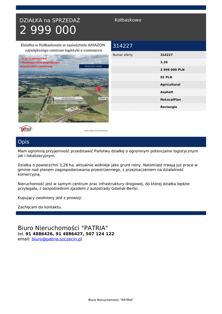 Kołbaskowo DZIAŁKA na SPRZEDAŻ 2 999 000 314227 Numer oferty 314227 3.26 2 999 000 PLN 92 PLN Agricultural Asphalt NoLocalPlan Rectangle Opis Mam ogromną przyjemność przedstawić Państwu działkę o ogromnym potencjalne logistycznym jak i lokalizacyjnym. Działka o powierzchni 3,26 ha, aktualnie widnieje jako grunt rolny. Natomiast trwają już prace w gminie nad planem zagospodarowania przestrzennego, z przeznaczeniem na działalność komercyjną. Nieruchomość jest w samym centrum prac infrastruktury drogowej, do której działka będzie przylegała, z bezpośrednim zjazdem z autostrady Gdańsk-Berlin. Kupujący zwolniony jest z prowizji. Zachęcam do kontaktu. Biuro Nieruchomości "PATRIA" tel. 91 4886426, 91 4886427, 507 124 122 email: [email protected] Biuro Nieruchomości "PATRIA" Powered by TCPDF (www.tcpdf.org)