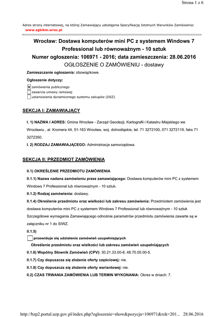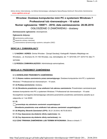 Strona 1 z 6 Adres strony internetowej, na której Zamawiający udostępnia Specyfikację Istotnych Warunków Zamówienia: www.zgkikm.wroc.pl Wrocław: Dostawa komputerów mini PC z systemem Windows 7 Professional lub równoważnym - 10 sztuk Numer ogłoszenia: 106971 - 2016; data zamieszczenia: 28.06.2016 OGŁOSZENIE O ZAMÓWIENIU - dostawy Zamieszczanie ogłoszenia: obowiązkowe. Ogłoszenie dotyczy: V zamówienia publicznego zawarcia umowy ramowej ustanowienia dynamicznego systemu zakupów (DSZ) SEKCJA I: ZAMAWIAJĄCY I. 1) NAZWA I ADRES: Gmina Wrocław - Zarząd Geodezji, Kartografii i Katastru Miejskiego we Wrocławiu , al. Kromera 44, 51-163 Wrocław, woj. dolnośląskie, tel. 71 3272100, 071 3272119, faks 71 3272350. I. 2) RODZAJ ZAMAWIAJĄCEGO: Administracja samorządowa. SEKCJA II: PRZEDMIOT ZAMÓWIENIA II.1) OKREŚLENIE PRZEDMIOTU ZAMÓWIENIA II.1.1) Nazwa nadana zamówieniu przez zamawiającego: Dostawa komputerów mini PC z systemem Windows 7 Professional lub równoważnym - 10 sztuk. II.1.2) Rodzaj zamówienia: dostawy. II.1.4) Określenie przedmiotu oraz wielkości lub zakresu zamówienia: Przedmiotem zamówienia jest dostawa komputerów mini PC z systemem Windows 7 Professional lub równoważnym - 10 sztuk Szczegółowe wymagania Zamawiającego odnośnie parametrów przedmiotu zamówienia zawarte są w załączniku nr 1 do SIWZ. II.1.5) przewiduje się udzielenie zamówień uzupełniających Określenie przedmiotu oraz wielkości lub zakresu zamówień uzupełniających II.1.6) Wspólny Słownik Zamówień (CPV): 30.21.33.00-8, 48.70.00.00-5. II.1.7) Czy dopuszcza się złożenie oferty częściowej: nie. II.1.8) Czy dopuszcza się złożenie oferty wariantowej: nie. II.2) CZAS TRWANIA ZAMÓWIENIA LUB TERMIN WYKONANIA: Okres w dniach: 7. http://bzp2.portal.uzp.gov.pl/index.php?ogloszenie=show&pozycja=106971&rok=201... 28.06.2016 Strona 2 z 6 SEKCJA III: INFORMACJE O CHARAKTERZE PRAWNYM, EKONOMICZNYM, FINANSOWYM I TECHNICZNYM III.1) WADIUM Informacja na temat wadium: 1. Kwota wadium wynosi: 400,00 zł (słownie: czterysta złotych 00/100) 2. Wadium należy wnieść przed upływem terminu składania ofert. Zamawiający wymaga, aby kwota wadium wnoszona w formie pieniężnej była na wskazanym poniżej koncie Zamawiającego do terminu składania ofert czyli 08.07.2016 r. do godz. 12.00. 3. Wadium może być wnoszone w jednej lub kilku następujących formach: pieniądzu,poręczeniach bankowych lub poręczeniach spółdzielczej kasy oszczędnościowo-kredytowej, z tym, że poręczenie kasy jest zawsze poręczeniem pieniężnym,gwarancjach bankowych,gwarancjach ubezpieczeniowych,poręczeniach udzielanych przez podmioty, o których mowa w art. 6b ust. 5 pkt 2 ustawy z 9 listopada 2000 r. o utworzeniu Polskiej Agencji Rozwoju Przedsiębiorczości (tj. Dz. U. 2016 r. poz. 539 ze zm.). 4. Wadium wnoszone w pieniądzu należy wpłacić przelewem na rachunek bankowy: PKO BP S.A., nr konta 35 1020 5226 0000 6102 0416 5064 z dopiskiem: Wadium - przetarg nieograniczony na dostawę komputerów mini PC z systemem Windows 7 Professional lub równoważnym - 10 sztuk 5. Wadium wniesione w pieniądzu Zamawiający przechowuje na rachunku bankowym. 6. Zamawiający zwraca wadium wszystkim Wykonawcom niezwłocznie po wyborze oferty najkorzystniejszej lub unieważnieniu postępowania, z wyjątkiem Wykonawcy, którego oferta została wybrana jako najkorzystniejsza z zastrzeżeniem pkt. 11 7. Wykonawcy, którego oferta została wybrana jako najkorzystniejsza, Zamawiający zwraca wadium niezwłocznie po zawarciu umowy w sprawie zamówienia publicznego oraz wniesieniu zabezpieczenia należytego wykonania umowy, jeżeli jego wniesienia żądano. 8. Zamawiający zwraca niezwłocznie wadium, na wniosek Wykonawcy, który wycofał ofertę przed upływem terminu składania ofert. 9. Zamawiający żąda ponownego wniesienia wadium przez Wykonawcę, któremu zwrócono wadium na podstawie pkt. 6, jeżeli w wyniku rozstrzygnięcia odwołania jego oferta uznana została jako najkorzystniejsza. Wykonawca wnosi wadium w terminie określonym przez Zamawiającego. 10. Jeżeli wadium wniesiono w pieniądzu, zamawiający zwraca je wraz z odsetkami wynikającymi z umowy rachunku bankowego, na którym było ono przechowywane, pomniejszone o koszty prowadzenia rachunku bankowego oraz prowizji bankowej za przelew pieniędzy na rachunek bankowy wskazany przez wykonawcę 11. Zamawiający zatrzymuje wadium wraz z odsetkami, jeżeli wykonawca w odpowiedzi na wezwanie, o którym mowa w art. 26 ust. 3, z przyczyn leżących po jego stronie, nie złożył dokumentów lub oświadczeń, o których mowa w art. 25 ust. 1, pełnomocnictw, listy podmiotów należących do tej samej grupy kapitałowej, o której mowa w art. 24 ust. 2 pkt 5, lub informacji o tym, że nie należy do grupy kapitałowej, lub nie wyraził zgody na poprawienie omyłki, o której mowa w art. 87 ust. 2 pkt 3, co powodowało brak możliwości wybrania oferty złożonej przez wykonawcę jako najkorzystniejszej. 12. Zamawiający zatrzymuje wadium wraz z odsetkami, jeżeli Wykonawca, którego oferta została wybrana: 1. odmówił podpisania umowy w sprawie zamówienia publicznego na warunkach http://bzp2.portal.uzp.gov.pl/index.php?ogloszenie=show&pozycja=106971&rok=201... 28.06.2016 Strona 3 z 6 określonych w ofercie, 2. nie wniósł wymaganego zabezpieczenia należytego wykonania umowy, 3. zawarcie umowy w sprawie zamówienia publicznego stało się niemożliwe z przyczyn leżących po stronie Wykonawcy. III.2) ZALICZKI III.3) WARUNKI UDZIAŁU W POSTĘPOWANIU ORAZ OPIS SPOSOBU DOKONYWANIA OCENY SPEŁNIANIA TYCH WARUNKÓW III. 3.1) Uprawnienia do wykonywania określonej działalności lub czynności, jeżeli przepisy prawa nakładają obowiązek ich posiadania Opis sposobu dokonywania oceny spełniania tego warunku nie dotyczy III.3.2) Wiedza i doświadczenie Opis sposobu dokonywania oceny spełniania tego warunku nie dotyczy III.3.3) Potencjał techniczny Opis 