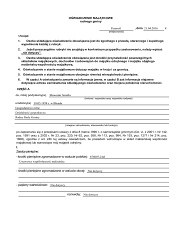 OŚWIADCZENIE MAJĄTKOWE radnego gminy Przerośl , dnia 21.04.2016 r. (miejscowość) Uwaga: 1. Osoba składająca oświadczenie obowiązana jest do zgodnego z prawdą, starannego i zupełnego wypełnienia każdej z rubryk. 2. Jeżeli poszczególne rubryki nie znajdują w konkretnym przypadku zastosowania, należy wpisać „nie dotyczy". 3. Osoba składająca oświadczenie obowiązana jest określić przynależność poszczególnych składników majątkowych, dochodów i zobowiązań do majątku odrębnego i majątku objętego małżeńską wspólnością majątkową. 4. Oświadczenie o stanie majątkowym dotyczy majątku w kraju i za granicą. 5. Oświadczenie o stanie majątkowym obejmuje również wierzytelności pieniężne. 6. W części A oświadczenia zawarte są informacje jawne, w części B zaś informacje niejawne dotyczące adresu zamieszkania składającego oświadczenie oraz miejsca położenia nieruchomości. CZĘŚĆ A Ja, niżej podpisany(a), Sławomir Serafin (imiona i nazwisko oraz nazwisko rodowe) urodzony(a) 18.05.1958 r. w Blenda Gospodarstwo rolne Działalność gospodarcza Radny Rady Gminy (miejsce zatrudnienia, stanowisko lub funkcja) po zapoznaniu się z przepisami ustawy z dnia 8 marca 1990 r. o samorządzie gminnym (Dz. U. z 2001 r. Nr 142, poz. 1591 oraz z 2002 r. Nr 23, poz. 220, Nr 62, poz. 558, Nr 113, poz. 984, Nr 153, poz. 1271 i Nr 214, poz. 1806), zgodnie z art. 24h tej ustawy oświadczam, że posiadam wchodzące w skład małżeńskiej wspólności majątkowej lub stanowiące mój majątek odrębny: I. Zasoby pieniężne: - środki pieniężne zgromadzone w walucie polskiej: 876007,24zł Ustawowa współwłasność małżeńska - środki pieniężne zgromadzone w walucie obcej: Nie dotyczy - papiery wartościowe: Nie dotyczy na kwotę: Nie dotyczy II. 1. Dom o powierzchni: 108 m 2, o wartości: 200 000,00 zł tytuł prawny: ustawowa współwłasność małżeńska 2. Mieszkanie o powierzchni: 46 m 2, o wartości: 100000,00 zł tytuł prawny: ustawowa współwłasność małżeńska 3. Gospodarstwo rolne: rodzaj gospodarstwa: wielokierunkowe , powierzchnia: 113,4658 ha o wartości: 1 700 000,00 zł rodzaj zabudowy: zagrodowa ( murowane budynki gospodarskie), inwentarz ,maszyny w rolnictwie tytuł prawny: ustawowa współwłasność małżeńska Z tego tytułu osiągnąłem(ęłam) w roku ubiegłym przychód i dochód w wysokości: 391478,89/250000zł w tym dopłaty z UE +akcyza(ustawowa współwłasność małżeńska) 4. Inne nieruchomości: powierzchnia: budynek piekarni wraz z wyposażeniem i budynkiem gospodarczym Nr.działki 307/1, 307/3 o pow. 0,1566ha o wartości: 400000,00 zł w tym wyposażenie około 50000zł Dom mieszkalny (120m2)z działką 0,1213ha o wartości 150000zł tytuł prawny: ustawowa współwłasność małżeńska III. 1. Posiadam udziały w spółkach handlowych z udziałem gminnych osób prawnych lub przedsiębiorców, w których uczestniczą takie osoby — należy podać liczbę i emitenta udziałów: Nie dotyczy udziały te stanowią pakiet większy niż 10% udziałów w spółce: Nie dotyczy Z tego tytułu osiągnąłem(ęłam) w roku ubiegłym dochód w wysokości: Nie dotyczy 2. Posiadam udziały w innych spółkach handlowych — należy podać liczbę i emitenta udziałów: Nie dotyczy Z tego tytułu osiągnąłem(ęłam) w roku ubiegłym dochód w wysokości: Nie dotyczy IV. 1. Posiadam akcje w spółkach handlowych z udziałem gminnych osób prawnych lub przedsiębiorców, w których uczestniczą takie osoby — należy podać liczbę i emitenta akcji: Nie dotyczy akcje te stanowią pakiet większy niż 10% akcji w spółce: Nie dotyczy Z tego tytułu osiągnąłem(ęłam) w roku ubiegłym dochód w wysokości: Nie dotyczy 2. Posiadam akcje w innych spółkach handlowych — należy podać liczbę i emitenta akcji: Nie dotyczy Z tego tytułu osiągnąłem(ęłam) w roku ubiegłym dochód w wysokości: Nie dotyczy V. Nabyłem(am) (nabył mój małżonek, z wyłączeniem mienia przynależnego do jego majątku odrębnego) od Skarbu Państwa, innej państwowej osoby prawnej, jednostek samorządu terytorialnego, ich związków lub od komunalnej osoby prawnej następujące mienie, które podlegało zbyciu w drodze przetargu — należy podać opis mienia i datę nabycia, od kogo: Nie dotyczy VI. 1. Prowadzę działalność gospodarczą (należy podać formę prawną i przedmiot działalności): Transport ciężarowy, handel, piekarnia - osobiście: tak - wspólnie z innymi osobami: Nie dotyczy Z tego tytułu osiągnąłem(ęłam) w roku ubiegłym przychód i dochód w wysokości: 253318,69/11372,32zł (ustawowa współwłasność małżeńska ) 2. Zarządzam działalnością gospodarczą lub jestem przedstawicielem pełnomocnikiem takiej działalności (należy podać formę prawną i przedmiot działalności): Nie dotyczy - osobiście: Nie dotyczy - wspólnie z innymi osobami: Nie dotyczy Z tego tytułu osiągnąłem(ęłam) w roku ubiegłym przychód i dochód w wysokości: Nie dotyczy VII. W spółkach handlowych (nazwa, siedziba spółki): Nie dotyczy - jestem członkiem zarządu (od kiedy): Nie dotyczy - jestem członkiem rady nadzorczej (od kiedy): Nie dotyczy - jestem członkiem komisji rewizyjnej (od kiedy): Nie dotyczy Z tego tytułu osiągnąłem(ęłam) w roku ubiegłym dochód w wysokości: Nie dotyczy VIII. Inne dochody osiągane z tytułu zatrudnienia lub innej działalności zarobkowej lub zajęć, z podaniem kwot uzyskiwanych z każdego tytułu: dieta radnego - 5400,00 zł Ustawowa współwłasność małżeńska IX. Składniki mienia ruchomego o wartości powyżej 10 000 złotych (w przypadku pojazdów mechanicznych należy podać markę, model i rok produkcji): Fiat Albea (2003r.) ciągnik Zetor (1987) Kombajn Bizon (1998r.)+ maszyny towarzyszące do produkcji w rolnictwie Nissan Patrol (2001) Ustawowa współwłasność małżeńska X. Zobowiązania pieniężne o wartości powyżej 10 000 złotych, w ty