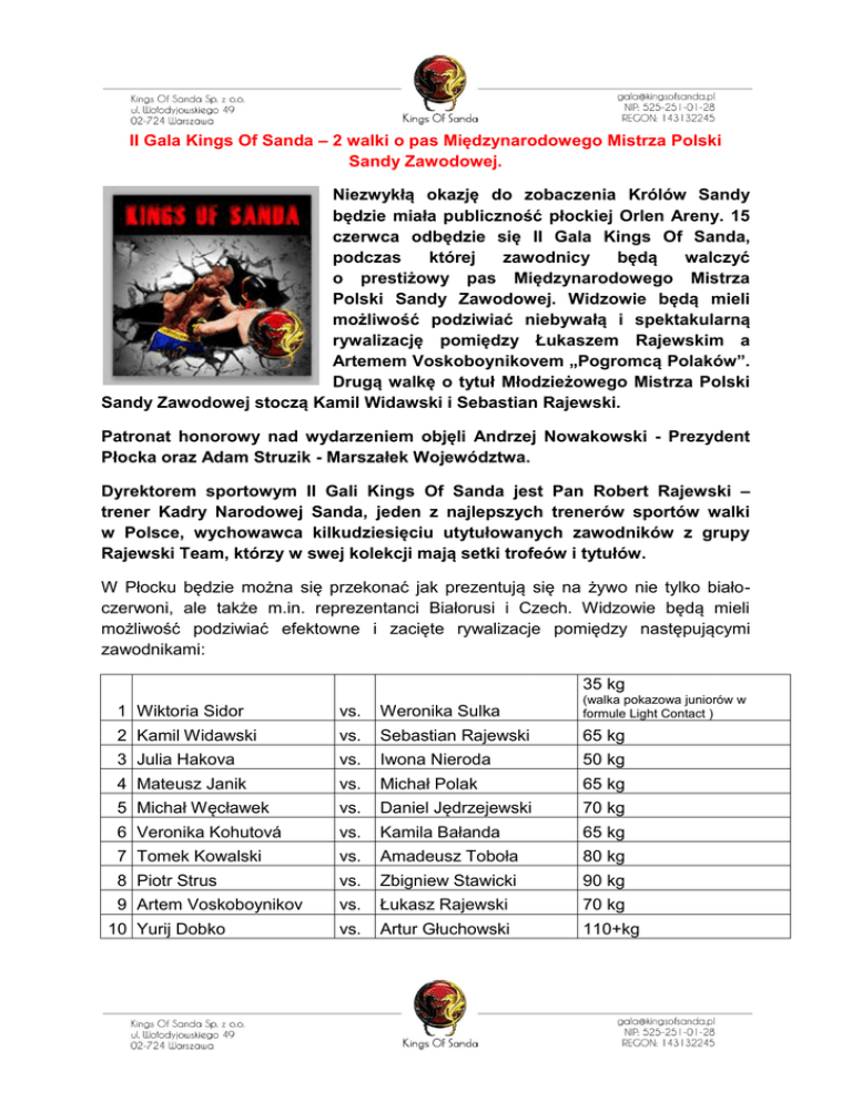 II Gala Kings Of Sanda – 2 walki o pas Międzynarodowego Mistrza Polski Sandy Zawodowej. Niezwykłą okazję do zobaczenia Królów Sandy będzie miała publiczność płockiej Orlen Areny. 15 czerwca odbędzie się II Gala Kings Of Sanda, podczas której zawodnicy będą walczyć o prestiżowy pas Międzynarodowego Mistrza Polski Sandy Zawodowej. Widzowie będą mieli możliwość podziwiać niebywałą i spektakularną rywalizację pomiędzy Łukaszem Rajewskim a Artemem Voskoboynikovem „Pogromcą Polaków”. Drugą walkę o tytuł Młodzieżowego Mistrza Polski Sandy Zawodowej stoczą Kamil Widawski i Sebastian Rajewski. Patronat honorowy nad wydarzeniem objęli Andrzej Nowakowski - Prezydent Płocka oraz Adam Struzik - Marszałek Województwa. Dyrektorem sportowym II Gali Kings Of Sanda jest Pan Robert Rajewski – trener Kadry Narodowej Sanda, jeden z najlepszych trenerów sportów walki w Polsce, wychowawca kilkudziesięciu utytułowanych zawodników z grupy Rajewski Team, którzy w swej kolekcji mają setki trofeów i tytułów. W Płocku będzie można się przekonać jak prezentują się na żywo nie tylko białoczerwoni, ale także m.in. reprezentanci Białorusi i Czech. Widzowie będą mieli możliwość podziwiać efektowne i zacięte rywalizacje pomiędzy następującymi zawodnikami: 35 kg 1 Wiktoria Sidor vs. Weronika Sulka (walka pokazowa juniorów w formule Light Contact ) 2 Kamil Widawski vs. Sebastian Rajewski 65 kg 3 Julia Hakova vs. Iwona Nieroda 50 kg 4 Mateusz Janik vs. Michał Polak 65 kg 5 Michał Węcławek vs. Daniel Jędrzejewski 70 kg 6 Veronika Kohutová vs. Kamila Bałanda 65 kg 7 Tomek Kowalski vs. Amadeusz Toboła 80 kg 8 Piotr Strus vs. Zbigniew Stawicki 90 kg 9 Artem Voskoboynikov vs. Łukasz Rajewski 70 kg vs. Artur Głuchowski 110+kg 10 Yurij Dobko Poziom sportowy Sandy w Polsce jest bardzo wysoki. Kadra Polski Wushu jest najmocniejszą kadrą w Unii Europejskiej - tylko w 2011 roku podczas Mistrzostw Europy i Mistrzostw Świata zdobyliśmy łącznie 28 medali! Osiągnięcia pozwalają nam sądzić, że Wushu, a w nim Sanda będą jedna z najmocniejszych Polskich Dyscyplin Olimpijskich. Perspektywa występu olimpijskiego motywuje zawodników do jeszcze cięższej pracy na treningach. Przypomnijmy, Wushu – w tym Sanda – jest w gronie dyscyplin oczekujących na wejście do oficjalnego kalendarza MKOL. Trudno się zresztą temu dziwić, bo Światowa Federacja Wushu zrzesza 144 związki krajowe. Warto dodać, że lata 2010-2012 były niezwykle udane dla Polaków. Z Mistrzostw Świata i Europy przywieźli oni do kraju 46 medali. Bohaterów tych zmagań nie zabraknie również w Orlen Arenie. Rankingowy tytuł Międzynarodowego Mistrza Polski Sandy Zawodowej to ważny pas w kolekcji. Podczas I Gali Kings Of Sanda zawodnicy pokazali światowy poziom walk i nie inaczej będzie tym razem – a to gwarantuje niezapomniane emocje! Bilety oraz szczegółowe informacje o zawodnikach i II Gali Kings Of Sanda: www.kingofsanda.pl Zapraszamy na nasz profil na Facebook’u: www.facebook.com/kingsofsanda