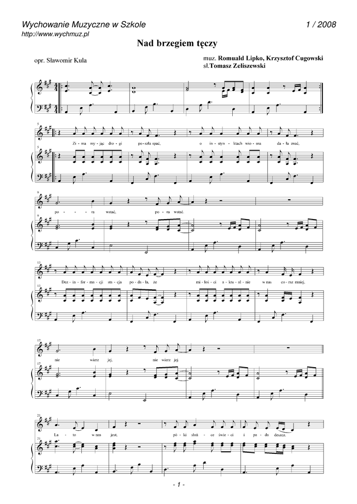 Wychowanie Muzyczne w Szkole 1 / 2008 http://www.wychmuz.pl 1 Wychowanie Muzyczne w Szkole 1 / 2008 http://www.wychmuz.pl 2 Wychowanie Muzyczne w Szkole 1 / 2008 http://www.wychmuz.pl Zima myjąc drogi poszła spać, o instynktach wiosna dała znać, pora wstać, pora wstać. Dezinformacji stacja podała, że miłości aktualnie w nas coraz mniej, nie wierz jej, nie wierz jej. Lato w nas jest, póki słońce świeci i pada deszcz. Bo człowiek wie, że nad brzegiem tęczy żyć się chce. A tutaj wszystko, czego pragniesz, jest możliwe, nic nie zagraża nam. Ludzie są ludźmi, cuda dla tych, co kochają. Nie wierzysz? Zrób to sam. Zrób to sam. Kim dla mnie jesteś, tego nie wie nikt, i pewnie nie wiesz tego nawet Ty. Uwierz mi, uwierz mi. Kiedy się świata boję, mówisz mi, że tęczowy łuk to zawsze słońce i deszcz. Kocham cię, kocham cię. Lato w nas jest, póki słońce świeci i pada deszcz. Bo człowiek wie, że nad brzegiem tęczy żyć się chce. A tutaj wszystko, czego pragniesz, jest możliwe, nic nie zagraża nam. Ludzie są ludźmi, cuda dla tych, co kochają. Nie wierzysz? Zrób to sam. Bo na planecie wszystko ciągle się obraca, nie wiedzieć który raz. A nam się wydaje, że my świat zmieniamy, a to świat zmienia nas. Lato w nas jest, póki słońce świeci i pada deszcz. Bo człowiek wie, że nad brzegiem tęczy żyć się chce. 3