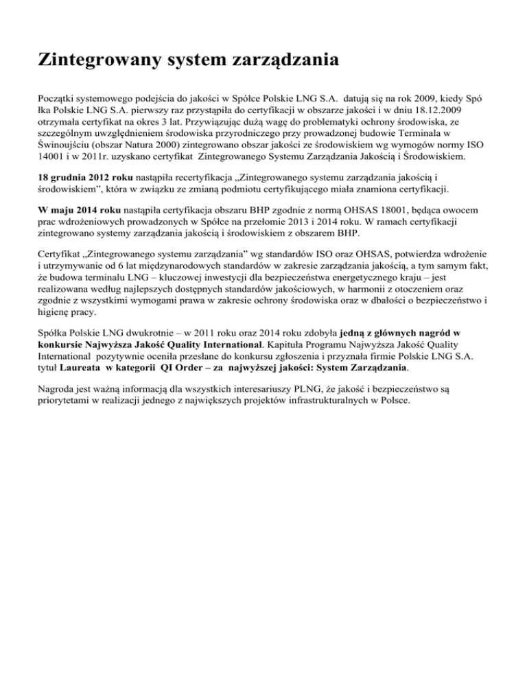 Zintegrowany system zarządzania Początki systemowego podejścia do jakości w Spółce Polskie LNG S.A. datują się na rok 2009, kiedy Spó łka Polskie LNG S.A. pierwszy raz przystąpiła do certyfikacji w obszarze jakości i w dniu 18.12.2009 otrzymała certyfikat na okres 3 lat. Przywiązując dużą wagę do problematyki ochrony środowiska, ze szczególnym uwzględnieniem środowiska przyrodniczego przy prowadzonej budowie Terminala w Świnoujściu (obszar Natura 2000) zintegrowano obszar jakości ze środowiskiem wg wymogów normy ISO 14001 i w 2011r. uzyskano certyfikat Zintegrowanego Systemu Zarządzania Jakością i Środowiskiem. 18 grudnia 2012 roku nastąpiła recertyfikacja „Zintegrowanego systemu zarządzania jakością i środowiskiem”, która w związku ze zmianą podmiotu certyfikującego miała znamiona certyfikacji. W maju 2014 roku nastąpiła certyfikacja obszaru BHP zgodnie z normą OHSAS 18001, będąca owocem prac wdrożeniowych prowadzonych w Spółce na przełomie 2013 i 2014 roku. W ramach certyfikacji zintegrowano systemy zarządzania jakością i środowiskiem z obszarem BHP. Certyfikat „Zintegrowanego systemu zarządzania” wg standardów ISO oraz OHSAS, potwierdza wdrożenie i utrzymywanie od 6 lat międzynarodowych standardów w zakresie zarządzania jakością, a tym samym fakt, że budowa terminalu LNG – kluczowej inwestycji dla bezpieczeństwa energetycznego kraju – jest realizowana według najlepszych dostępnych standardów jakościowych, w harmonii z otoczeniem oraz zgodnie z wszystkimi wymogami prawa w zakresie ochrony środowiska oraz w dbałości o bezpieczeństwo i higienę pracy. Spółka Polskie LNG dwukrotnie – w 2011 roku oraz 2014 roku zdobyła jedną z głównych nagród w konkursie Najwyższa Jakość Quality International. Kapituła Programu Najwyższa Jakość Quality International pozytywnie oceniła przesłane do konkursu zgłoszenia i przyznała firmie Polskie LNG S.A. tytuł Laureata w kategorii QI Order – za najwyższej jakości: System Zarządzania. Nagroda jest ważną informacją dla wszystkich interesariuszy PLNG, że jakość i bezpieczeństwo są priorytetami w realizacji jednego z największych projektów infrastrukturalnych w Polsce.