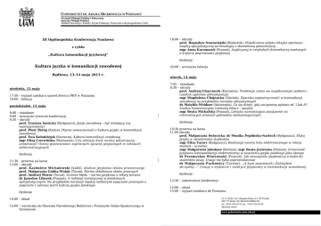 Wydział Filologii Polskiej i Klasycznej Instytut Filologii Polskiej Zakład Frazeologii i Kultury Języka Polskiego, Pracownia Leksykograficzna UAM III Ogólnopolska Konferencja Naukowa z cyklu „Kultura komunikacji językowej” 18:00 – obrady prof. Bogusław Nowowiejski (Białystok), Współczesna polska leksyka sportowa – między specjalistyczną terminologią a słownikową potocznością mgr Anna Kaczmarek (Poznań), Anglicyzmy w artykułach dziennikarzy modowych a kryteria poprawności językowej dyskusja Kultura języka w komunikacji zawodowej Będlewo, 13–14 maja 2013 r. niedziela, 12 maja 17:30 – wyjazd autokaru sprzed dworca PKP w Poznaniu 19:00 – kolacja poniedziałek, 13 maja 8:00 – śniadanie 9:00 – uroczyste otwarcie konferencji 9:30 – obrady prof. Grażyna Sawicka (Bydgoszcz), Język zawodowy – byt istniejący czy wyimaginowany? prof. Piotr Zbróg (Kielce), Płynna nowoczesność a kultura języka w komunikacji zawodowej prof. Ewa Kołodziejek (Szczecin), Kultura komunikacji urzędowej mgr Eliza Czerwińska (Warszawa), Czy istnieją dwie normy polszczyzny urzędowej? Ocena poprawności wybranych zjawisk językowych w tekstach administracyjnych dyskusja 11:30 – przerwa na kawę 12:00 – obrady prof. Kazimierz Michalewski (Łódź), Analiza językowa tekstu prawniczego prof. Małgorzata Gębka-Wolak (Toruń), Norma składniowa aktów prawnych prof. Andrzej Moroz (Toruń), Granice błędu – norma językowa a teksty prawne dr Jarosław Liberek (Poznań), O refleksji teoretycznej w dziedzinach specjalistycznych. Na przykładzie korelacji między niektórymi pojęciami prawnymi a pojęciami z zakresu teorii kultury języka polskiego dyskusja 14:00 – obiad 15:00 – wycieczka do Muzeum Narodowego Rolnictwa i Przemysłu Rolno-Spożywczego w Szreniawie 20:00 – uroczysta kolacja wtorek, 14 maja 7:45 – śniadanie 8:30 – obrady prof. Andrzej Charciarek (Katowice), Tendencje zmian we współczesnym polskim i czeskim systemie adresatywnym mgr Magdalena Chojnacka (Gdańsk), Zjawisko asymetryczności w komunikacji zawodowej na przykładzie zwrotów adresatywnych dr Matylda Weidner (Antwerpia), Co się dzieje, gdy zaczynamy pytania od I lub A? Analiza konwersacyjna rozmowy lekarz – pacjent mgr Beata Michalska (Poznań), Leksyka wartościująca pozytywnie na internetowych stronach gabinetów stomatologicznych dyskusja 10:30 przerwa na kawę 11:00 obrady prof. Małgorzata Święcicka, dr Monika Peplińska-Narloch (Bydgoszcz), Etyka języka w świadomości studentów mgr Eliza Tarary (Bydgoszcz), Realizacja wzorca listu elektronicznego w relacji student – uczelnia mgr Małgorzata Jakobsze (Bolonia), mgr Beata Jezierska (Poznań), Grzeczność językowa korespondencji elektronicznej w nauczaniu języka polskiego jako obcego dr Przemysław Wiatrowski (Poznań), Jak nauczyciele akademiccy e-maile do studentów piszą. Uwagi nie tylko poprawnościowe dr Małgorzata Pachowicz (Tarnów), „A bym zapomniał:) Założyłem skrzynkę...” Uwagi o etykiecie i estetyce językowej w komunikacji zawodowej dyskusja 13:30 – zakończenie konferencji 14:00 – obiad 15:00 – wyjazd autokaru do Poznania ul. A. Fredry 10, Collegium Maius, 61-701 Poznań NIP 777 00 06 350, REGON 000001293 tel. +48 61 829 45 92, fax. +48 61 829 45 00 [email protected] www.polonistyka.amu.edu.pl