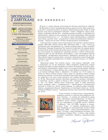 ZABYTKI W KRAJOBRAZIE OD REDAKCJI miesi!cznik popularnonaukowy TOWAR&YSTWA OPIEKI NAD &ABYTKAMI zrealizowano w ramach .rogramu 1peracyjnego .romocja 5zytelnictwa og!oszonego przez 8inistra 9ultury i :ziedzictwa <arodowego 12 (262) XXXII Warszawa 2008 ADRES REDAKCJI: 00-460 Warszawa, ul. Agrykoli 1 tel./fax 0-22 622-46-63 e-mail: [email protected] http://www.spotkania.pl REDAKCJA: Wojciech Przybyszewski redaktor naczelny Lidia Bruszewska zast!pca redaktora naczelnego Ewa A. Kami!ska sekretarz redakcji Jaros"aw Komorowski Piotr Berezowski opracowanie graficzne WSPÓ#PRACOWNICY: Witold P. Glinkowski, Stanis!aw Grzelachowski, Adam Konopacki, Marek Konopka, Robert M. Kunkel, Zbigniew Michalczyk, Zdzis!aw Skrok, Janusz Sujecki, Tomasz Urzykowski, Hanna Widacka, Wanda Za!"ska RADA REDAKCYJNA: dr hab. Dorota Folga-Januszewska dr hab. arch. Danuta K!osek-Koz!owska prof. dr hab. Marek Kwiatkowski prof. dr hab. Ma!gorzata Omilanowska prof. dr hab. Jacek Purchla prof. dr hab. Andrzej Rottermund prof. dr hab. Bogumi!a Rouba dr Tadeusz Rudkowski (przewodnicz#cy) prof. dr hab. Anna Sieradzka mgr Ewa Siurawska mgr Andrzej So!tan dr hab. in$. Bogus!aw Szmygin prof. dr hab. Andrzej Tomaszewski Wydawca: Oficyna Wydawnicza Towarzystwa Opieki nad Zabytkami dyrektor: Ewa Siurawska 00-459 Warszawa, ul. My%liwiecka 1A, tel. 0-22 629-62-26, tel./fax 0-22 622-46-74 www.zabytki-tonz.pl Druk: 02-903 Warszawa, ul. Powsi"ska 69/71 tel. 0-22 694-67-52, fax 0-22 694-62-06 www.cokprm.gov.pl B y!a [...] w"ród najwy#ej uhonorowanych (równie# pa$stwowymi orderami) artystów w Polsce, sprzedawa!a obrazy za ogromne sumy, stale uczestniczy!a w wystawach polskich za granic%. Reprodukcje jej prac traa!y do szkó! tworz%c nowy kanon postrzegania ludowo"ci i historii: «Ksi&garnie, salony sztuki, sklepy z materia!ami pi"miennymi – wsz&dzie spotkasz jej obrazy, w orygina!ach lub reprodukcjach, w!%cznie a# do pocztówek. Ba, nawet i antykwariaty, obok Kossaka zaczynaj% umieszcza' ju# i [...]»” ...No w#a$nie, kogo? Zo! Stryje"sk%, a dok#adnie rzecz bior%c, jej prace, które – przynajmniej w okresie dwudziestolecia mi!dzywojennego – cieszy#y si! nie tylko w Polsce niezaprzeczalnym powodzeniem. Cytat pochodzi z ksi%&ki Joanny Sosnowskiej Poza kanonem. Sztuka polskich artystek 1880-1939 (Instytut Sztuki PAN, Warszawa 2003, s. 150) i mo&na go potraktowa' jako wprowadzenie do rozdzia#u po$wi!conego przede wszystkim Stryje"skiej. Dlaczego Stryje"skiej? Bo „fenomen Stryje$skiej nie znajduje #adnego porównania w"ród artystek pierwszej po!owy XX wieku w ca!ej Europie. W #adnym kraju kobieta nie osi%gn&!a tak wysokiego presti#u w "wiecie artystycznym, nigdzie jej g!os nie sta! si& g!osem dominuj%cym, a wi&c narzucaj%cym sposób postrzegania i kszta!towania rzeczywisto"ci. Najlepszym dowodem jest fakt, #e kilka pokole$ kojarzy!o ludowe ta$ce z barwnymi wizerunkami roboty Stryje$skiej, zdobi%cymi pude!ka czekoladek firmy «E. Wedel» a pó(niej «22 lipca, d. E. Wedel»” (op.ODcit., s. 151). REDAKCJI Nadchodz% $wi!ta. Pod choink% mo&na i dzi$ po#o&y' czekoladki, cho' w opakowaniu ju& nie tak zdobionym. Mi#ym prezentem $wi%tecznym zawsze mog% te& by' bilety na dobr% wystaw! do muzeum. W Krakowie, w gmachu g#ównym Muzeum Narodowego, b!dzie mo&na na przyk#ad skonfrontowa' legend! o Zofii Stryje"skiej z rzeczywisto$ci% (zob. artyku# Boginka s!owia$ska, ss. 3-7), a po lekturze krótkiego tekstu o „Madonnie z Kru&lowej” (ss. 16-17) zajrze' na chwil! do Pa#acu biskupa Erazma Cio#ka, gdzie od niedawna rze(ba znalaz#a bezpieczn% przysta", a mo&e tak&e odwiedzi' staromiejski pawilon, by sprawdzi', czy dzieje si! w nim (lub w jego otoczeniu) co$ nowego (Staromiejski pawilon, ss. 28-30). Warszawskie Muzeum Narodowe zaprasza na wystaw! „Orientalizm w malarstwie, rysunku i grafice w Polsce w XIX i pierwszej po#owie XX wieku” (s. 32) i do Galerii Polskiej Sztuki Zdobniczej, gdzie w sta#ej ekspozycji mo&na podziwia' jeden z najciekawszych i najcenniejszych porcelanowych serwisów w Polsce (ss. 36-37). Now% wystaw!, na jubileusz swego czterdziestolecia, przygotowa#o Muzeum Papiernictwa w Dusznikach Zdroju (ss. 33-34), a Muzeum Miejskie w )ywcu – ekspozycj! obrazów Jana Kazimierza Olpi"skiego (ss. 30-31). W tym numerze, w naszym koszu z zaproszeniami, znajdziemy jeszcze co najmniej dwa $wi%teczne prezenty. Pierwszy – to zach!ta do odwiedzenia naszej strony internetowej (www.spotkania.pl), na której od niedawna mo&na znale(' zdygitalizowane najstarsze (ju& niedost!pne w oryginale) roczniki „Spotka" z Zabytkami” (lata 1977-1986; nast!pne w przygotowaniu). Drugi – to ilustracja przygotowana przez Zofi! Stryje"sk% do przedwojennego wydania Kol&d (Warszawa 1926) – nasza bo&onarodzeniowa „pocztówka”, na której, z okazji zbli&aj%cych si! *wi%t i nadchodz%cego Nowego Roku, w imieniu ca#ej redakcji wszystkim Czytelnikom sk#adamy najserdeczniejsze (w zbiorach Biblioteki ASP &yczenia. w Krakowie) Redakcja zastrzega sobie prawo wprowadzania zmian i skrótów w materia!ach przeznaczonych do publikacji oraz publikowania wybranych artyku!ów w wersji elektronicznej. Materia!ów niezamówionych redakcja nie zwraca. Za tre%& reklam i og!osze' redakcja nie odpowiada. Nak!ad: 6000 egz. SPOTKANIA Z ZABYTKAMI nr 12 • 2008 spotkania_12-2008-cs3.indd 1 1 11/21/08 2:50:35 PM