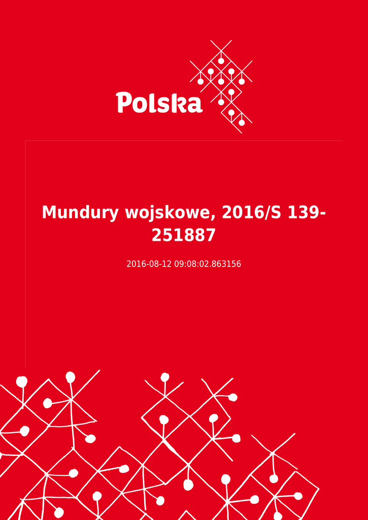 Mundury wojskowe, 2016/S 139251887 2016-08-12 09:08:02.863156 2 Ta oferta nie stanowi informacji handlowej Dane kontaktowe Lietuvos kariuomenė 188732677 LT-01144 Vilnius Šv. Ignoto g. 8 Litwa Osoba kontaktowa Ingrida Andriškevičiūtė [email protected] Tel: +370 52785215 Opis przedmiotu zamówienia Mundury wojskowe. Informacje uzupełniające Udział w postępowaniu w języku litewskim w formie elektronicznej na stronie Centralnego systemu informacyjnego zamówień publicznych (https://pirkimai.eviesiejipirkimai.lt). Więcej informacji: http://ted.europa.eu/udl?uri=TED:NOTICE:251887-2016:TEXT:PL:HTML&src=0 CPV ● ● Sprzęt bezpieczeństwa, gaśniczy, policyjny i obronny Mundury wojskowe 3 Forma przetargu Międzynarodowy Kraj Litwa Adres WWW ted.europa.eu/udl?uri=TED:NOTICE:251887-2016:TEXT:PL:HTML&src=0 Termin składania ofert 30.08.2016 Ważna od 11.08.2016 Branże Tekstylia, Odzież, tekstylia, wyroby skórzane, 4