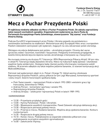 Fundacja Otwarty Dialog Al. J. Ch. Szucha 11a/21 00-580 Warszawa T: +48 22 307 11 22 Mecz o Puchar Prezydenta Polski W najbliższą niedzielę odbędzie się Mecz o Puchar Prezydenta Polski. Do udziału zaprosiliśmy także naszych wschodnich sąsiadów. Organizatorami wydarzenia są: biuro Posła do Parlamentu Europejskiego Pawła Zalewskiego, stowarzyszenie "Daj szansę" oraz Fundacja Otwarty Dialog. Podczas Euro2012 organizowanych przez Polskę i Ukrainę pojawiły się pomówienia o rasistowskie zachowania na stadionach. Wolontariusze akcji Europejski Kibic wraz z europosłem Pawłem Zalewskim zainicjowali cykl wydarzeń, mających na celu odczarować polski stereotyp. Zbliżająca się edycja dedykowana jest polsko – ukraińskiej przyjaźni. Chcemy dać wyraz sprzeciwu wobec rasizmowi, ksenofobii i faszyzmowi. Potępiamy kremlowską propagandę, w świetle której demokratyczne dążenia narodu ukraińskiego zrównywane są z faszyzmem. Na murawie zmierzą się drużyny FC Tolerancja i RPA (Reprezentacja Piłkarzy Afryki). W tym roku w skład FC Tolerancja wejdą obywatele Ukrainy. Kibice na trybunach będą śpiewać i skandować wspólnie hasła solidarności. Dostępne będą również punkty informacyjne rozstawione wokół stadionu. W przerwie odbędzie się także wspólne jedzenie bananów, co stanowi kontynuację akcji WeAreAllMonkeys. Patronat nad wydarzeniem objęli m.in. Polsat i Orange TV. Udział wezmą członkowie Reprezentacji Artystów Polskich, polscy piłkarze (w tym Legii Warszawa), komentatorzy sportowi i wielu innych. Gośćmi honorowymi spotkania będą: Piotr Świerczewski – reprezentant Polski w latach 1992-2003 i wieloletni gracz ligi francuskiej, dziennikarze TVN24, Andrzej Person - komentator sportowy i senator PO, Reprezentacja Artystów Polskich, Andrzej Strejlau - selekcjoner reprezentacji Polski w latach 1989-1993. HARMONOGRAM 12:30 – Przywitanie przybyłych gości 13:00 – Hymny Państwowe- Polski i Ukraiński. 13:08 – Wywieszenie wszelkich transparentów. Paweł Zalewski odczytuje deklarację akcji. 13:30 – Rozpoczęcie pierwszej połowy meczu. 14:10 – Przerwa w meczu. Rozdanie bananów. Wspólna akcja zjedzenia bananów. Konkurs rzutów karnych. 14:30 – Rozpoczęcie drugiej połowy meczu. 15:10 – Koniec meczu. Podziękowanie za wspaniałe widowisko piłkarzom oraz podziękowanie za przyjście wszystkim zgromadzonym. 16:00 – Zakończenie imprezy. Dołącz do wydarzenia na Facebooku facebook.com/OpenDialogFoundation | [email protected] | www.odfoundation.eu