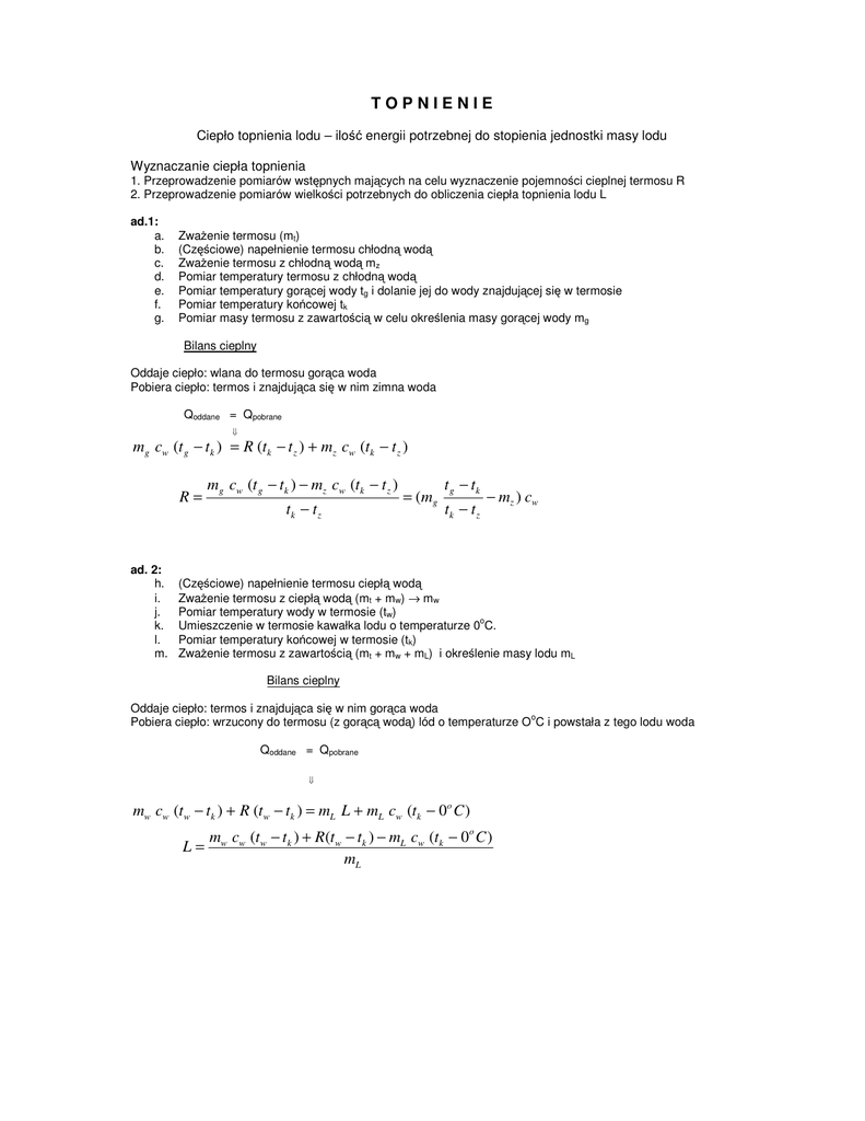 TOPNIENIE Ciepło topnienia lodu – ilość energii potrzebnej do stopienia jednostki masy lodu Wyznaczanie ciepła topnienia 1. Przeprowadzenie pomiarów wstępnych mających na celu wyznaczenie pojemności cieplnej termosu R 2. Przeprowadzenie pomiarów wielkości potrzebnych do obliczenia ciepła topnienia lodu L ad.1: a. b. c. d. e. f. g. Zważenie termosu (mt) (Częściowe) napełnienie termosu chłodną wodą Zważenie termosu z chłodną wodą mz Pomiar temperatury termosu z chłodną wodą Pomiar temperatury gorącej wody tg i dolanie jej do wody znajdującej się w termosie Pomiar temperatury końcowej tk Pomiar masy termosu z zawartością w celu określenia masy gorącej wody mg Bilans cieplny Oddaje ciepło: wlana do termosu gorąca woda Pobiera ciepło: termos i znajdująca się w nim zimna woda Qoddane = Qpobrane ⇓ mg cw (t g − t k ) = R (tk − t z ) + mz cw (tk − t z ) R= ad. 2: h. i. j. k. l. m. mg cw (t g − tk ) − mz cw (tk − t z ) tk − t z = ( mg t g − tk tk − t z − mz ) c w (Częściowe) napełnienie termosu ciepłą wodą Zważenie termosu z ciepłą wodą (mt + mw) → mw Pomiar temperatury wody w termosie (tw) o Umieszczenie w termosie kawałka lodu o temperaturze 0 C. Pomiar temperatury końcowej w termosie (tk) Zważenie termosu z zawartością (mt + mw + mL) i określenie masy lodu mL Bilans cieplny Oddaje ciepło: termos i znajdująca się w nim gorąca woda o Pobiera ciepło: wrzucony do termosu (z gorącą wodą) lód o temperaturze O C i powstała z tego lodu woda Qoddane = Qpobrane ⇓ mw cw (t w − tk ) + R (t w − tk ) = mL L + mL cw (tk − 0o C ) L= mw cw (t w − t k ) + R(t w − tk ) − mL cw (tk − 0o C ) mL