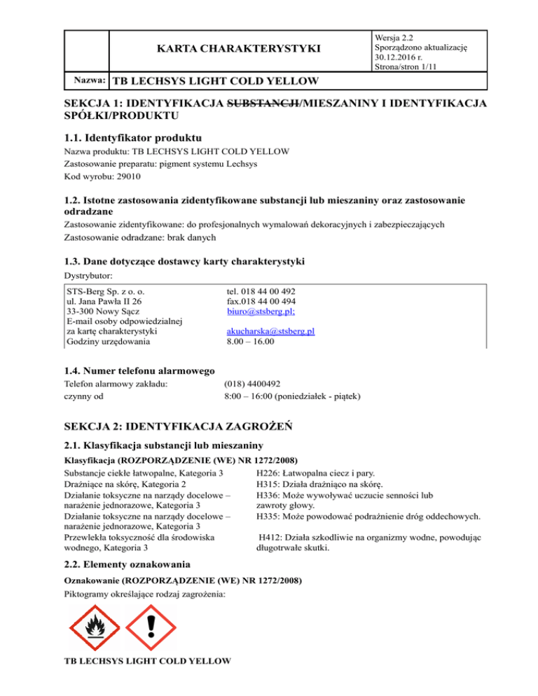 KARTA CHARAKTERYSTYKI Wersja 2.2 Sporządzono aktualizację 30.12.2016 r. Strona/stron 1/11 Nazwa: TB LECHSYS LIGHT COLD YELLOW SEKCJA 1: IDENTYFIKACJA SUBSTANCJI/MIESZANINY I IDENTYFIKACJA SPÓŁKI/PRODUKTU 1.1. Identyfikator produktu Nazwa produktu: TB LECHSYS LIGHT COLD YELLOW Zastosowanie preparatu: pigment systemu Lechsys Kod wyrobu: 29010 1.2. Istotne zastosowania zidentyfikowane substancji lub mieszaniny oraz zastosowanie odradzane Zastosowanie zidentyfikowane: do profesjonalnych wymalowań dekoracyjnych i zabezpieczających Zastosowanie odradzane: brak danych 1.3. Dane dotyczące dostawcy karty charakterystyki Dystrybutor: STS-Berg Sp. z o. o. ul. Jana Pawła II 26 33-300 Nowy Sącz E-mail osoby odpowiedzialnej za kartę charakterystyki Godziny urzędowania tel. 018 44 00 492 fax.018 44 00 494 [email protected]; [email protected] 8.00 – 16.00 1.4. Numer telefonu alarmowego Telefon alarmowy zakładu: czynny od (018) 4400492 8:00 – 16:00 (poniedziałek - piątek) SEKCJA 2: IDENTYFIKACJA ZAGROŻEŃ 2.1. Klasyfikacja substancji lub mieszaniny Klasyfikacja (ROZPORZĄDZENIE (WE) NR 1272/2008) Substancje ciekłe łatwopalne, Kategoria 3 H226: Łatwopalna ciecz i pary. Drażniące na skórę, Kategoria 2 H315: Działa drażniąco na skórę. Działanie toksyczne na narządy docelowe – H336: Może wywoływać uczucie senności lub narażenie jednorazowe, Kategoria 3 zawroty głowy. Działanie toksyczne na narządy docelowe – H335: Może powodować podrażnienie dróg oddechowych. narażenie jednorazowe, Kategoria 3 Przewlekła toksyczność dla środowiska H412: Działa szkodliwie na organizmy wodne, powodując wodnego, Kategoria 3 długotrwałe skutki. 2.2. Elementy oznakowania Oznakowanie (ROZPORZĄDZENIE (WE) NR 1272/2008) Piktogramy określające rodzaj zagrożenia: TB LECHSYS LIGHT COLD YELLOW KARTA CHARAKTERYSTYKI Wersja 2.2 Sporządzono aktualizację 30.12.2016 r. Strona/stron 2/11 Nazwa: TB LECHSYS LIGHT COLD YELLOW Hasło ostrzegawcze: UWAGA Zwroty wskazujące rodzaj zagrożenia: H226 Łatwopalna ciecz i pary. H315 Działa drażniąco na skórę. H335 Może powodować podrażnienie dróg oddechowych. H336 Może wywoływać uczucie senności lub zawroty głowy. H412 Działa szkodliwie na organizmy wodne, powodując długotrwałe skutki. Zwroty wskazujące środki ostrożności: Zapobieganie: P210 Przechowywać z dala od źródeł ciepła, gorących powierzchni, źródeł iskrzenia, otwartego ognia i innych źródeł zapłonu. Nie palić. P261 Unikać wdychania par. Reagowanie: P362 + P364 Zanieczyszczoną odzież zdjąć i wyprać przed ponownym użyciem. P370 + P378 W przypadku pożaru: Użyć suchy piasek, suche proszki gaśnicze lub pianę alkoholoodporną do gaszenia. Niebezpieczne składniki muszą być wymienione na etykiecie: 64742-95-6 Solwent nafta (ropa naftowa), węglowodory lekkie aromatyczne Dodatkowe oznakowanie: EUH208 Zawiera: oksym butan-2-onu. Może powodować wystąpienie reakcji alergicznej. 2.3. Inne zagrożenia Nieznane. Dostarczony produkt nie stwarza zagrożeń. Wymagana informacja znajduje się w tej karcie Charakterystyki Niebezpiecznej Substancji Chemicznej. SEKCJA 3: SKŁAD/ INFORMACJA O SKŁADNIKACH 3.2. Mieszaniny Typ związku: Płynna zabarwiona dyspersja. Składniki stwarzające zagrożenie: Nazwa substancji Nr CAS Nr WE Nr Rejestracji Solwent nafta (ropa naftowa), węglowodory lekkie aromatyczne Klasyfikacja (Rozporządzenie 1272/2008) Stężenie % (C.) 64742-95-6 649-356-00-4 265-199-0 01-2119455851-35-0006 Flam. Liq. 3; H226 STOT SE 3; H335, H336 Aquatic Chronic 2; H411 Asp. Tox. 1; H304 EUH066 >= 20 - < 25 Dimetylobenzen– mieszanina izomerów 1330-20-7 215-535-7 01-2119488216-32 Flam. Liq. 3; H226 Acute Tox. 4; H332 Acute Tox. 4; H312 Skin Irrit. 2; H315 >=17,5-<20 Oksym butan 2-onu 96-29-7 202-496-6 01-2119539477-28 Carc. 2; H351 Acute Tox. 4; H312 Eye Dam. 1; H318 Skin Sens. 1; H317 >= 0,1 - < 1 Pełny tekst symboli (H) znajduje się w sekcji 16. TB LECHSYS LIGHT COLD YELLOW Nr Indeksowy 601-022-00-9 616-014-00-0 Wersja 2.2 Sporządzono aktualizację 30.12.2016 r. Strona/stron 3/11 KARTA CHARAKTERYSTYKI Nazwa: TB LECHSYS LIGHT COLD YELLOW SEKCJA 4: ŚRODKI PIERWSZEJ POMOC 4.1. Opis środków pierwszej pomocy Porady ogólne: W przypadku utrzymujących się objawów lub jakichkolwiek wątpliwości zasięgnąć porady medycznej. Nieprzytomnej osobie nigdy nie podawać nic doustnie. W przypadku wdychania: Wynieść na świeże powietrze. Zapewnić poszkodowanemu ciepło i spokój. W przypadku nieregularnego lub zatrzymanego oddechu zastosować sztuczne oddychanie. Osobie nieprzytomnej zapewnić wygodną pozycję i zasięgnąć porady medycznej. W przypadku kontaktu ze skórą: Natychmiast zdjąć skażone ubranie. Zmyć starannie skórę wodą z mydłem lub zastosować znane środki zmywające. NIE stosować rozpuszczalników lub rozcieńczalników. Zapewnić prysznic w miejscu pracy. W przypadku kontaktu z oczami: Przepłukiwać otwarte oczy obficie czystą, świeżą wodą przynajmniej przez 10 minut. Zasięgnąć porady medycznej. Zapewnić oczomyjkę w miejscu pracy. Usunąć szkła (szkło) kontaktowe. W przypadku połknięcia: W razie przypadkowego połknięcia uzyskać niezwłocznie opiekę medyczną. NIE prowokować wymiotów. 4.2. Najważniejsze ostre i opóźnione objawy oraz skutki narażenia Objawy: Brak dostępnej informacji. Zagrożenia: Brak dostępnej informacji. 4.3. Wskazania dotyczące wszelkiej natychmiastowej pomocy lekarskiej i szczególnego postępowania z poszkodowanym Kuracja: Procedura pierwszej pomocy powinna zostać ustalona wspólnie z lekarzem medycyny pracy. Zasięgnąć porady medycznej. SEKCJA 5: POSTĘPOWANIE W PRZYPADKU POŻARU 5.1. Środki gaśnicze Odpowiednie środki gaśnicze: Środki gaśnicze, które nie mogą być użyte ze względów bezpieczeństwa Stosować zraszanie wodą, piany alkoholoodporne, suche chemikalia lub dwutlenek węgla. Chłodzić zbiorniki i ich otoczenie poprzez zraszanie wod