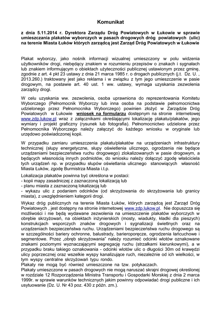 Komunikat z dnia 5.11.2014 r. Dyrektora Zarządu Dróg Powiatowych w Łukowie w sprawie umieszczania plakatów wyborczych w pasach drogowych dróg powiatowych (ulic) na terenie Miasta Łuków których zarządcą jest Zarząd Dróg Powiatowych w Łukowie Plakat wyborczy, jako nośnik informacji wizualnej umieszczony w polu widzenia użytkowników drogi, niebędący znakiem w rozumieniu przepisów o znakach i sygnałach lub znakiem informującym o obiektach użyteczności publicznej ustawionym przez gminę, zgodnie z art. 4 pkt 23 ustawy z dnia 21 marca 1985 r. o drogach publicznych (j.t. Dz. U. , 2013.260.) traktowany jest jako reklama i w związku z tym jego umieszczenie w pasie drogowym, na postawie art. 40 ust. 1 ww. ustawy, wymaga uzyskania zezwolenia zarządcy drogi. W celu uzyskania ww. zezwolenia, osoba uprawniona do reprezentowania Komitetu Wyborczego (Pełnomocnik Wyborczy lub inna osoba na podstawie pełnomocnictwa udzielonego przez Pełnomocnika Wyborczego) powinien złożyć w Zarządzie Dróg Powiatowych w Łukowie wniosek na formularzu dostępnym na stronie internetowej www.zdp.lukow.pl wraz z załącznikami określającymi lokalizację plakatu/plakatów, jego wymiary i projekt graficzny (rysunek lub fotografia). Pełnomocnictwo udzielone przez Pełnomocnika Wyborczego należy załączyć do każdego wniosku w oryginale lub urzędowo poświadczonej kopii. W przypadku zamiaru umieszczenia plakatu/plakatów na urządzeniach infrastruktury technicznej (słupy energetyczne, słupy oświetlenia ulicznego, ogrodzenia nie będące urządzeniami bezpieczeństwa ruchu drogowego) zlokalizowanych w pasie drogowym, a będących własnością innych podmiotów, do wniosku należy dołączyć zgodę właściciela tych urządzeń np. w przypadku słupów oświetlania ulicznego stanowiących własność Miasta Łuków, zgodę Burmistrza Miasta i.t.p. Lokalizacja plakatów powinna być określona w postaci: - kopii mapy zasadniczej z zaznaczoną lokalizacją lub - planu miasta z zaznaczoną lokalizacją lub - wykazu ulic z podaniem odcinków (od skrzyżowania do skrzyżowania lub granicy miasta), z uwzględnieniem kategorii drogi. Wykaz dróg publicznych na terenie Miasta Łuków, których zarządcą jest Zarząd Dróg Powiatowych , jest dostępny na stronie internetowej www.zdp.lukow.pl. Nie dopuszcza się możliwości i nie będą wydawane zezwolenia na umieszczenie plakatów wyborczych w obrębie skrzyżowań, na obiektach inżynierskich (mosty, wiadukty, kładki dla pieszych) konstrukcjach wsporczych znaków drogowych i sygnalizacji świetlnych oraz na urządzeniach bezpieczeństwa ruchu. Urządzeniami bezpieczeństwa ruchu drogowego są w szczególności bariery ochronne, balustrady, barieroporęcze, ogrodzenia łańcuchowe i segmentowe. Przez „obręb skrzyżowania” należy rozumieć odcinki wlotów oznakowane znakami poziomymi wyznaczającymi segregację ruchu (strzałkami kierunkowymi), a w przypadku braku takiego oznakowania - odcinki wlotów ulic o długości 30m od krawędzi ulicy poprzecznej oraz wszelkie wyspy kanalizujące ruch, niezależnie od ich wielkości, w tym wyspy centralne skrzyżowań typu rondo. . Plakaty nie mogą być również umieszczone na tzw. potykaczach. . Plakaty umieszczone w pasach drogowych nie mogą naruszać skrajni drogowej określonej w rozdziale 12 Rozporządzenia Ministra Transportu i Gospodarki Morskiej z dnia 2 marca 1999r. w sprawie warunków technicznych jakim powinny odpowiadać drogi publiczne i ich usytuowanie (Dz. U. Nr 43 poz. 430 z późn. zm.). Zgodnie z § 4 ust. 2 Uchwała nr XXVI/259/2013 Rady Powiatu w Łukowie z dnia 21 sierpnia 2013 r. w sprawie wysokości opłat za zajęcie pasa drogowego dróg powiatowych, dla których zarządcą jest Zarząd Powiatu w Łukowie na cele niezwiązane z budową, przebudową, remontem, utrzymaniem i ochroną dróg (Dz.Urz. Woj. Lub. 2013.3966) za zajęcie pasa drogowego w celu umieszczania w pasie drogowym reklamy obowiązują następujące stawki opłat za każdy dzień zajęcia 1 m2 powierzchni: 1) reklamy o powierzchni nieprzekraczającej 1 m 2 - 2 zł; 2) reklamy o powierzchni przekraczającej 1 m 2 - 3 zł. Pod pojęciem plakat wyborczy należy rozumieć również inne formy materiałów wyborczych tj. tablice, bannery itp. Wnioski wraz z złącznikami jw. należy składać w Zarządzie Dróg Powiatowych w Łukowie 21-400, ul. Łapiguz 112, od poniedziałku do piątku, w godzinach 7:00-15:00. W przypadku złożenia wniosku nie zawierającego wszystkich wymaganych informacji i załączników, wnioskodawca zostanie wezwany do uzupełnienia wniosku, który, do czasu uzupełnienia, pozostanie bez rozpatrzenia. Dyrektor ZDP Stanisław Sokół Załączniki: 1. Wniosek o wydanie zezwolenia 2. Wykaz dróg publicznych Łuków, dnia ………………………….. ….................................................................................. ….................................................................................. (NAZWA KOMITETU WYBORCZEGO) ….................................................................................. (imię i nazwisko pełnomocnika) ….................................................................................. (adres dla korespondencji, nr telefonu pełnomocnika) Zarząd Dróg Powiatowych w Łukowie ul. Łapiguz 112 21-400 Łuków WNIOSEK O WYDANIE ZEZWOLENIA NA UMIESZCZENIE W PASIE DROGOWYM REKLAM – PLAKATÓW WYBORCZYCH Proszę o wydanie zgody zezwalającej na zajęcie pasa drogowego ulicy: ………………………………………………………………………………………………………………… ………………………………………………………………………………………………………………… ………………………………………………………………………………………………......................... w celu umieszczenia plakatów wyborczych w związku z kampanią wyborcz