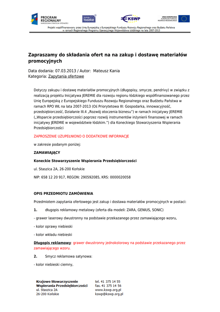 . Zapraszamy do składania ofert na na zakup i dostawę materiałów promocyjnych Data dodania: 07.03.2013 / Autor: Mateusz Kania Kategoria: Zapytania ofertowe Dotyczy zakupu i dostawę materiałów promocyjnych (długopisy, smycze, pendrivy) w związku z realizacją projektu Inicjatywa JEREMIE dla rozwoju regionu łódzkiego współfinansowanego przez Unię Europejską z Europejskiego Funduszu Rozwoju Regionalnego oraz Budżetu Państwa w ramach RPO WŁ na lata 2007-2013 (Oś Priorytetowa III: Gospodarka, innowacyjność, przedsiębiorczość, Działanie III.4 „Rozwój otoczenia biznesu”) w ramach inicjatywy JEREMIE („Wsparcie przedsiębiorczości poprzez rozwój instrumentów inżynierii finansowej w ramach inicjatywy JEREMIE w województwie łódzkim.”) dla Koneckiego Stowarzyszenia Wspierania Przedsiębiorczości ZAPROSZENIE UZUPEŁNIONO O DODATKOWE INFORMACJE w zakresie podanym poniżej: ZAMAWIAJĄCY Koneckie Stowarzyszenie Wspierania Przedsiębiorczości ul. Staszica 2A, 26-200 Końskie NIP: 658 12 20 917, REGON: 290592085, KRS: 0000020058 OPIS PRZEDMIOTU ZAMÓWIENIA Przedmiotem zapytania ofertowego jest zakup i dostawa materiałów promocyjnych w postaci: 1. długopis reklamowy metalowy (oferta dla modeli: ZARA, GENIUS, SONIC) - grawer laserowy dwustronny na podstawie przekazanego przez zamawiającego wzoru, - kolor oprawy niebieski - kolor wkładu niebieski Długopis reklamowy: grawer dwustronny jednokolorowy na podstawie przekazanego przez zamawiającego wzoru. 2. Smycz reklamowa satynowa: - kolor niebieski ciemny, - szerokość 15 mm, - zakończenie karabińczyk + klamra odpinana + zawieszka na telefon, - nadruk full color na podstawie przekazanego przez zamawiającego wzoru. Smycz reklamowa: nadruk dwustronny full color na podstawie przekazanego przez zamawiającego wzoru 3. Pendrive o pojemności 4 GB - kolor niebieski (wzór załączony do zapytania) - nadruk na obudowie zgodnie z przekazanym przez zamawiającego wzorem. Pendrive: nadruk dwustronny (może być też grawer) jednokolorowy na obudowie, model pendrive klasyczny wykonany z aliminium i plastiku, kolor plastiku ciemny niebieski. Pendrive zgodny z załaczonym wzorem lub bardzo zbliżony. TERMIN I FORMA REALIZACJI ZAMÓWIENIA: Dostawa artykułów będzie zrealizowana na koszt i ryzyko Wykonawcy. Dostawa towaru po zaakceptowaniu projektów przez Zamawiającego powinna nastąpić nie później niż do dnia 18 kwietnia 2013 r. Dostawa zrealizowana będzie w godzinach pracy Zamawiającego tj. od godz. 8.00 do16.00. OBOWIĄZKI WYKONAWCY: Wykonawca dostarczy artykuły fabrycznie nowe. Wszystkie projekty poszczególnych materiałów muszą zostać zatwierdzone przez zamawiającego. Zamawiającemu przysługują uprawnienia z tytułu rękojmi za wady w zakresie przewidzianym przepisami Kodeksu Cywilnego. Reklamacje realizowane będą w terminie do 10 dni kalendarzowych. TERMIN ZWIĄZANIA OFERTĄ: Wykonawca jest związany ofertą przez okres 30 dni liczonych od daty upływu terminu do składania ofert. FORMA SKŁADANIA OFERT: Ofertę należy złożyć na formularzu ofertowym stanowiącym Załącznik nr 1 do Zapytania ofertowego – formularz ofertowy. Ofertę należy przesyłać mailem na adres [email protected] w tytule wiadomości wpisując: „Oferta – materiały promocyjne JEREMIE” lub faksem na numer telefonu 41 375 14 56 TERMIN SKŁADANIA OFERT: do 21.03.2013 r. do godz. 12.00. W ZWIĄZKU Z UZUPEŁNIENIEM DO ZAPYTANIA ULEGA ZMIANIE TERMIN SKŁADANIA OFERT: Termin składania ofert do: 25.03.2013 r. do godz. 12.00. KRYTERIA WYBORU DOSTAWCY Zamawiający dokona oceny ważnych ofert i wyłoni wykonawcę na podstawie najniższej ceny – 100%. OPIS SPOSOBU PRZYGOTOWANIA OFERTY: W ofercie należy podać jednostkową cenę brutto (zgodnie z jednostkami miary podanymi w zał. 1) Tylko kompletne oferty będą podlegały ocenie i musza być zgodne z załącznikiem nr 1 do Zapytania ofertowego – formularz ofertowy na materiały promocyjne JEREMIE. Nie dopuszcza się składania ofert częściowych. OSOBY DO KONTAKTU: Izabela Magierowska [email protected] Katarzyna Rupniewska [email protected] Koneckie Stowarzyszenie Wspierania Przedsiębiorczości ul. Staszica 2A, 26-200 Końskie tel. 41/375 14 55/56 [email protected] Inne informacje: Zamawiający może przed terminem składania ofert zmienić treść zapytania bez podawania przyczyn. Zamawiający może w każdym czasie unieważnić postępowanie bez podawania przyczyn. Wykonawcy nie przysługuje odszkodowanie z tytułu odwołania lub unieważnienia postępowania. Złożenie ewentualnej oferty nie stwarza po stronie oferenta roszczenia względem KSWP Końskie o zawarcie umowy i zastrzegamy sobie prawo wyboru oferty i zawarcia umowy z wybranym oferentem. Z wybranym Wykonawcą zostanie podpisana umowa w miejscu i terminie wyznaczonym przez Zamawiającego. Elementy powiązane ● ● Inicjatywa JEREMIE dla rozwoju regionu łódzkiego UZUPEŁNIENIE DO ZAPYTANIA OFERTOWEGO NA MATERIAŁY PROMOCYJNE Pliki do pobrania ● . Załącznik nr 1 - Formularz oferty Data dodania: 12.03.2013