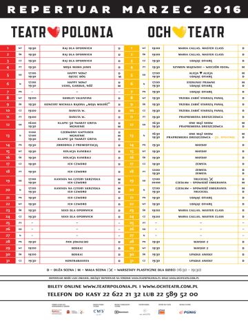 r e p e r t u a r m a r z e c 2016 1 wt 19:30 raj dla opornych d 1 wt 19:00 maria callas. master class d 2 śr 19:30 raj dla opornych d 2 śr 19:00 maria callas. master class d 3 cz 19:30 raj dla opornych d 3 cz 19:30 udając ofiarę d 4 pt 19:30 moja mama janis d 4 pt 19:30 szymon majewski – wieczór f ochu m 5 so 17:00 19:30 happy now? ojciec bóg d m 5 so 17:00 19:30 alicja ♥ alicja udając ofiarę m d 6 n 17:00 19:30 happy now? ucho, gardło, nóż d m 6 n 17:00 19:30 stosunki prawne udając ofiarę m d 7 pn – – – 7 pn 19:30 udając ofiarę d 8 wt 19:00 shirley valentine d 8 wt 19:30 trzeba zabić starszą panią d 9 śr 19:30 koncert michała bajora „moja miłość” d 9 śr 19:30 trzeba zabić starszą panią d 10 cz 19:00 danuta w. d 10 cz 19:30 trzeba zabić starszą panią d 11 pt 19:00 danuta w. d 11 pt 19:30 prapremiera dreszczowca d 12 so 16:00 19:30 klaps! 50 twarzy greya mgnienie d m 12 so 16:30 19:30 one mąż show prapremiera dreszczowca m d 13 n 11:00 17:00 19:30 czerwony kapturek mgnienie klaps! 50 twarzy greya d m d 13 n 16:30 19:30 one mąż show prapremiera dreszczowca – 50. spektakl m d 14 pn 19:30 zbrodnia z premedytacją d 14 pn 19:30 mayday d 15 wt 19:30 kolacja kanibali d 15 wt 19:30 mayday d 16 śr 19:30 kolacja kanibali d 16 śr 19:30 mayday d 17 cz 19:30 ich czworo d 17 cz 19:30 zemsta d 18 pt 19:30 ich czworo d 18 pt 12:00 19:30 zemsta zemsta d d 19 so 17:00 19:30 kantata na cztery skrzydła ich czworo m d 19 so 17:00 20:00 truciciel czesław – spowiedź emigranta d m 20 n 17:00 19:30 kantata na cztery skrzydła ich czworo m d 20 n 17:00 19:30 czesław – spowiedź emigranta truciciel m d 21 pn 19:30 ich czworo d 21 pn 19:30 udając ofiarę d 22 wt 19:30 ich czworo d 22 wt 19:30 udając ofiarę d 23 śr 19:30 seks dla opornych d 23 śr 19:00 maria callas. master class d 24 cz 19:30 seks dla opornych d 24 cz 19:00 maria callas. master class d 25 pt – – – 25 pt – – – 26 so – – – 26 so – – – 27 n – – – 27 n – – – 28 pn 19:30 pan jowialski d 28 pn 19:30 mayday 2 d 29 wt 19:00 boska! d 29 wt 19:30 mayday 2 d 30 śr 19:00 boska! d 30 śr 19:30 upadłe anioły d 31 cz 19:30 kontrabasista d 31 cz 19:30 upadłe anioły d d – duża scena | m – mała scena | – warsztaty plastyczne dla dzieci (16:30 - 19:30) repertuar może ulec zmianie. bieżący repertuar na stronie www.teatrpolonia.pl oraz www.ochteatr.com.pl bilety online www.teatrpolonia.pl i www.ochteatr.com.pl telefon do kasy 22 622 21 32 lub 22 589 52 00 PREMIERY W ROKU 2016 DOFINANSOWANO ZE ŚRODKÓW: DORADCA PRAWNY TEATRÓW: MECENAS TECHNOLOGICZNY TEATRÓW: PARTNER PREMIER: PARTNER OCH-TEATRU: MECENAS TEATRÓW: