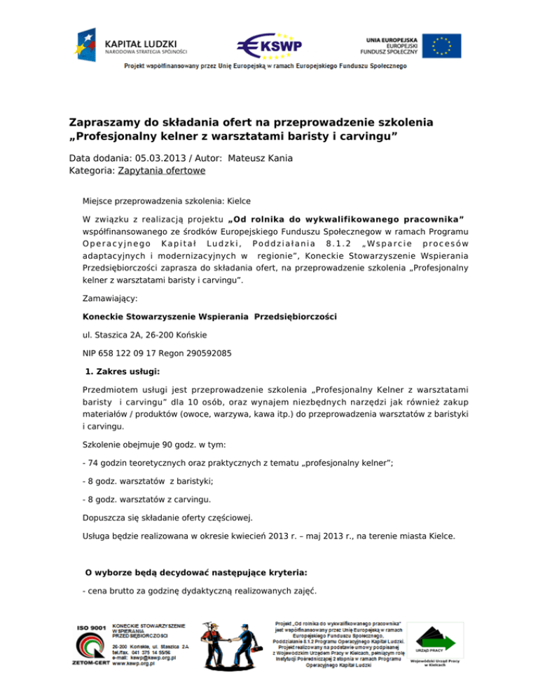 . Zapraszamy do składania ofert na przeprowadzenie szkolenia „Profesjonalny kelner z warsztatami baristy i carvingu” Data dodania: 05.03.2013 / Autor: Mateusz Kania Kategoria: Zapytania ofertowe Miejsce przeprowadzenia szkolenia: Kielce W związku z realizacją projektu „Od rolnika do wykwalifikowanego pracownika” współfinansowanego ze środków Europejskiego Funduszu Społecznegow w ramach Programu Operacyjnego Kapitał Ludzki, Poddziałania 8.1.2 „Wsparcie procesów adaptacyjnych i modernizacyjnych w regionie”, Koneckie Stowarzyszenie Wspierania Przedsiębiorczości zaprasza do składania ofert, na przeprowadzenie szkolenia „Profesjonalny kelner z warsztatami baristy i carvingu”. Zamawiający: Koneckie Stowarzyszenie Wspierania Przedsiębiorczości ul. Staszica 2A, 26-200 Końskie NIP 658 122 09 17 Regon 290592085 1. Zakres usługi: Przedmiotem usługi jest przeprowadzenie szkolenia „Profesjonalny Kelner z warsztatami baristy i carvingu” dla 10 osób, oraz wynajem niezbędnych narzędzi jak również zakup materiałów / produktów (owoce, warzywa, kawa itp.) do przeprowadzenia warsztatów z baristyki i carvingu. Szkolenie obejmuje 90 godz. w tym: - 74 godzin teoretycznych oraz praktycznych z tematu „profesjonalny kelner”; - 8 godz. warsztatów z baristyki; - 8 godz. warsztatów z carvingu. Dopuszcza się składanie oferty częściowej. Usługa będzie realizowana w okresie kwiecień 2013 r. – maj 2013 r., na terenie miasta Kielce. O wyborze będą decydować następujące kryteria: - cena brutto za godzinę dydaktyczną realizowanych zajęć. Oferta powinna zawierać: - cenę brutto za godzinę dydaktyczną realizowanych zajęć, - program szkolenia, - CV oraz oświadczenie o współpracy (formularz dostępne na stronie internetowej www.kswp.org.pl) - kopie dokumentów potwierdzających posiadane wykształcenie oraz doświadczenie w przeprowadzaniu tego typu szkoleń. Oferujemy: - umowę zlecenie/o dzieło, - pracę od poniedziałku do piątku w godzinach od 8.00 do 16.00, - możliwość nawiązania stałej współpracy. Miejsce i termin złożenia oferty: Ofertę należy przesłać do dnia 8.03.2012 r. do godziny 12.00 na adres elektroniczny zamawiającego: (z dopiskiem wykładowca – Kelner) [email protected] lub złożyć osobiście w Biurze Projektu w Kielcach, Al. IX Wieków Kielc 6 pok. 24, piętro III ( budynek Becher Platinum) Dodatkowych informacji udziela Karolina Mońska – Asystentka Lokalna Koordynatora. Informacje dodatkowe: Zamawiający – KSWP Końskie, oświadcza i informuje, że niniejsze zapytanie ofertowe, ma wyłącznie charakter sondażu rynku pod kątem wyboru oferty najkorzystniejszej pod względem ceny. Złożenie ewentualnej oferty nie stwarza po stronie oferenta roszczenia pod względem KSWP Końskie o zawarcie umowy i zastrzegamy sobie prawo wyboru oferty i zawarcia umowy z wybranym oferentem. Elementy powiązane ● . Od rolnika do wykwalifikowanego pracownika
