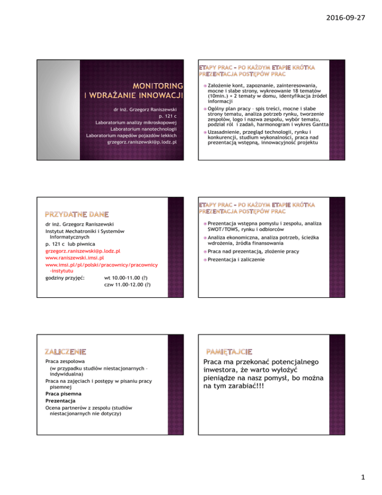 2016-09-27 Założenie kont, zapoznanie, zainteresowania, mocne i słabe strony, wykreowanie 18 tematów (10min.) + 2 tematy w domu, identyfikacja źródeł informacji dr inż. Grzegorz Raniszewski p. 121 c Laboratorium analizy mikroskopowej Laboratorium nanotechnologii Laboratorium napędów pojazdów lekkich [email protected] dr inż. Grzegorz Raniszewski Instytut Mechatroniki i Systemów Informatycznych p. 121 c lub piwnica [email protected] www.raniszewski.imsi.pl www.imsi.pl/pl/polski/pracownicy/pracownicy -instytutu godziny przyjęć: wt 10.00-11.00 (?) czw 11.00-12.00 (?) Praca zespołowa (w przypadku studiów niestacjonarnych – indywidualna) Praca na zajęciach i postępy w pisaniu pracy pisemnej Praca pisemna Prezentacja Ocena partnerów z zespołu (studiów niestacjonarnych nie dotyczy) Ogólny plan pracy – spis treści, mocne i słabe strony tematu, analiza potrzeb rynku, tworzenie zespołów, logo i nazwa zespołu, wybór tematu, podział ról i zadań, harmonogram i wykres Gantta Uzasadnienie, przegląd technologii, rynku i konkurencji, studium wykonalności, praca nad prezentacją wstępną, innowacyjność projektu Prezentacja wstępna pomysłu i zespołu, analiza SWOT/TOWS, rynku i odbiorców Analiza ekonomiczna, analiza potrzeb, ścieżka wdrożenia, źródła finansowania Praca nad prezentacją, złożenie pracy Prezentacja i zaliczenie Praca ma przekonać potencjalnego inwestora, że warto wyłożyć pieniądze na nasz pomysł, bo można na tym zarabiać!!! 1 2016-09-27 Trzeba uwzględnić w pracy pisemnej i prezentacji: opis zespołu, logo, nazwa zespołu krótkie wprowadzenie opisujące o czym jest praca wstęp teoretyczny, uzasadnienie wyboru tematu opis technologii/opis tematu/do kogo skierowany produkt/charakterystyka odbiorcy końcowego opis istniejących technologii konkurencyjnych analiza SWOT/TOWS uwzględnienie kosztów/zysków analiza opłacalności To po prostu każda zmiana, która coś ulepsza, daje nową jakość lub pozwala stworzyć nowy produkt czy usługę. www.edunews.pl Charakterystyka przedsięwzięcia. Charakterystyka problemu, który dany pomysł może rozwiązać. Charakterystyka rynku (m.in. kto jest odbiorcą, podział odbiorców/klientów) Jakie są potrzeby/oczekiwania klientów? W jaki sposób prezentowane Czy rozwiązanie odpowiada na te potrzeby? Czy do istniejącej sytuacji coś można dodać, zmienić? Czy popyt w danej dziedzinie jest rosnący czy malejący? W których dziedzinach jest najwyższy wzrost? Czy popyt ulega wahaniom sezonowym? Jaka jest konkurencja na rynku? W jakim zakresie nasz pomysł jest lepszy a w jakim gorszy? Jeśli wnosimy jakąś innowacje to co by było nowością? Co potrzebujemy do realizacji pomysłu? Czy dany pomysł poprawia konkurencyjność na rynku? Czy dany projekt wprowadza lub ulepsza nowe produkty? Jak wpływa na środowisko naturalne? Według upowszechnionej definicji innowacja jest to każda zmiana w przedsiębiorstwie, która została dokonana w celu uzyskania nowego produktu, nowej usługi bądź nowej jakości. Może być to zmiana radykalna, dająca zupełnie nowy produkt, ale również cząstkowa, prowadząca do udoskonalenia produktu. O innowacji można mówić na poziomie przedsiębiorstwa, na poziomie kraju, na poziomie świata, stawiając coraz wyższe wymagania w odniesieniu do tego, na jakim poziomie dana zmiana jest nowością Co najmniej tydzień przed ostatnimi zajęciami na których będą prowadzone prezentacje 2 2016-09-27 beesfund.com – crowdfunding udziałowy i nie udziałowy; wspolnyprojekt.pl – crowdfunding nieudziałowy; wspólnicy.pl – crowdfunding udziałowy; crowdangels.pl – crowdfunding udziałowy; polakpotrafi.pl – różne typy projektów, możliwy jedynie crowdfunding nieudziałowy; megatotal.pl – projekty muzyczne; clipontheroad.pl – teledyski, crowdfunders.pl – grupowy zakup nieruchomości komercyjnych; wspieramkulture.pl – projekty kulturalne; ideowi.pl – crowdfunding udziałowy; wspieram.to – różne typy projektów, możliwy jedynie crowdfunding nieudziałowy. www.gofundme.com www.kickstarter.com www.indiegogo.com www.teespring.com www.youcaring.com www.causes.com www.giveforward.com www.patreon.com www.crowdrise.com www.fundly.com Paliwo z odpadów organicznych Zgazowanie węgla Energia z wysypisk Energia z oczyszczalni ścieków Energia z biomasy Energia z odpadów medycznych Energia ze spalania odpadów komunalnych Plazmowa piroliza odpadów Przetworzenie CO2 Lekki pojazd elektryczny Samochód na ogniwa paliwowe Optymalizacja silnika na wodór Optymalizacja silnika na gaz CNG… Odzysk surowców z azbestu, odzysk surowców… Likwidacja freonów i innych gazów cieplarnianych Przetwarzanie pyłów hutniczych na… Utylizacja odpadów chromowych Czujniki w pojazdach Elementy tekstroniczne w pojazdach Energetyczne wykorzystanie odpadów Utylizacja azbestu Utylizacja gleb i gruntów Utylizacja popiołów ze spalarni odpadów technologie uzyskiwania paliw z odpadów przemysłowych i komunalnych Utylizacja odpadów promieniotwórczych Utylizacja odpadów in-situ Plazmowe technologie utylizacji odpadów Ekonomiczne aspekty gospodarki odpadami Zastosowanie czujników w siatkówce Odzysk energii w autach Energia z bakterii dla mieszkań Przedłużenie żywotności dla pożywienia Poprawa temperatury w e-papierosach System wczesnego ostrzegania przed wybuchem wulkanów Technologie skaningowe w protetyce stomatologicznej Zastosowanie prądnic w siłowni 3 2016-09-27 Fotel wspomagający wychodzenie z auta Buty z napędem Czujniki trzeźwości w samochodach Model składanej hulajnogi elektrycznej Algi jako źródło energii Automatyczna kontrola biletów Domowa frezarka CNC System ratunkowy w ubiorach narciarskich Transport niekonwencjonalny Aerożele Innowacyjne zastosowanie elastycznych wyświetlaczy Czytnik linii papilarnych w samochodzie Silniki wykorzystujące energię mięśni do generacji energii elektrycznej Nanodiagnostyka medyczna Nanomed